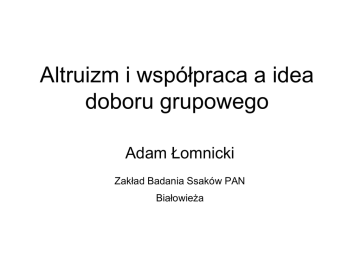 Altruizm i współpraca a idea doboru grupowego Adam Łomnicki Zakład Badania Ssaków PAN Białowieża Dwa osobniki w jednym niepodzielnym zasobie koniecznym do przeżycia Losowy dobór osobników altruistycznych i niealtruistycznych Q2 2Q(1-Q) (1-Q)2 A A N A N N CZY Q2/(Q2 + 2Q(1-Q) > Q ? NIE Gdy dwa osobniki są rodzeństwem a altruizm jest zdeterminowany genetycznie Q2 2Q(1-Q) (1-Q)2 A A N A N N Czy Q2/(Q2 + 2Q(1-Q) > Q ? TAK Większe grupy (na przykład po 30 osobników) Losowe rozmieszczenie dwóch genotypów A i N między grupami Każda grupa z tego samego klonu A lub N A N A N Wniosek • Grupy homogeniczne genetycznie faworyzują altruizm genetyczny • Grupy heterogeniczne genetycznie faworyzują egoizm Dobór grupowy schemat na powierzchni: puste lokalne siedliska, grupy A, grupy N, likwidacja grupy, kolonizacja pustego siedlika A A N N A N A Dobór grupowy: graf przejść kolonizacja A eliminacja altruistów przez niealtruistów PUSTE wyniszczenie kolonizacja N Dobór grupowy: graf przejść z ksenofobią kolonizacja A obrona altruistów przed kolonizacją przez obcych PUSTE wyniszczenie kolonizacja N Opieka nad wdowami i sierotami • nonsens z punktu widzenia indywidualnego interesu • zyski dla grupy (plemienia) • uogólnienie podobnych zachowań w religii • przewaga społeczności religijnych nad ateistycznymi • przyczyny tępienia innowierców i ateistów PRZY SPOTKANIU Z AGRESOREM AGRESOR USTĘPUJĄCY 10/2- 4/2= 3 0 USTĘPUJĄCYM 10 10/2=5 PRZY SPOTKANIU Z AGRESOREM AGRESOR USTĘPUJĄCY 10/2-15/2= -2,5 0 USTĘPUJĄCYM 10 10/2=5 złudzenia pseudodarwinowskie i socjalistyczne Tragedia wspólnot (the tragedy of commons) • przykład klasyczny: wypas bydła na błoniach • segregacja śmieci we wspólnotach mieszkaniowych • stosowanie antybiotyków >> sposoby zapobieżenia: podział wspólnot, zakazy prawne, bojkot towarzyski I to jest wszystko, co chciałem Państwu powiedzieć