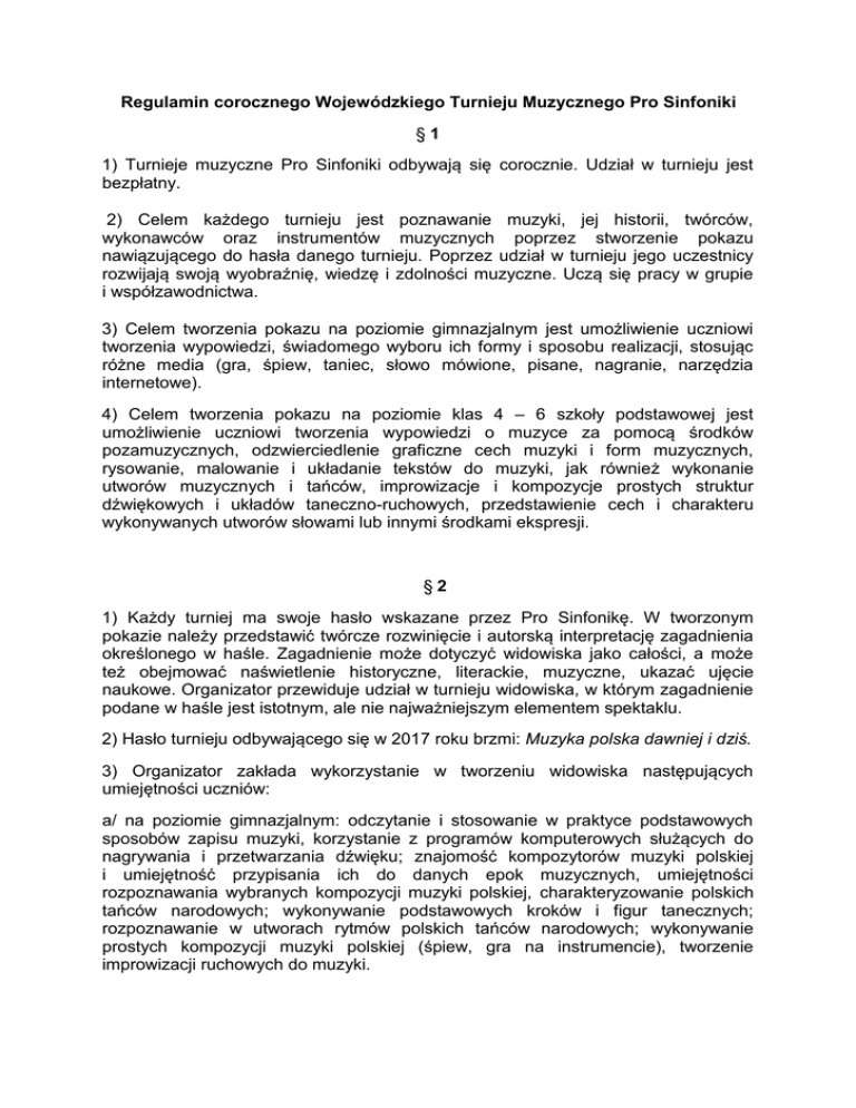 Regulamin corocznego Wojewódzkiego Turnieju Muzycznego Pro Sinfoniki §1 1) Turnieje muzyczne Pro Sinfoniki odbywają się corocznie. Udział w turnieju jest bezpłatny. 2) Celem każdego turnieju jest poznawanie muzyki, jej historii, twórców, wykonawców oraz instrumentów muzycznych poprzez stworzenie pokazu nawiązującego do hasła danego turnieju. Poprzez udział w turnieju jego uczestnicy rozwijają swoją wyobraźnię, wiedzę i zdolności muzyczne. Uczą się pracy w grupie i współzawodnictwa. 3) Celem tworzenia pokazu na poziomie gimnazjalnym jest umożliwienie uczniowi tworzenia wypowiedzi, świadomego wyboru ich formy i sposobu realizacji, stosując różne media (gra, śpiew, taniec, słowo mówione, pisane, nagranie, narzędzia internetowe). 4) Celem tworzenia pokazu na poziomie klas 4 – 6 szkoły podstawowej jest umożliwienie uczniowi tworzenia wypowiedzi o muzyce za pomocą środków pozamuzycznych, odzwierciedlenie graficzne cech muzyki i form muzycznych, rysowanie, malowanie i układanie tekstów do muzyki, jak również wykonanie utworów muzycznych i tańców, improwizacje i kompozycje prostych struktur dźwiękowych i układów taneczno-ruchowych, przedstawienie cech i charakteru wykonywanych utworów słowami lub innymi środkami ekspresji. §2 1) Każdy turniej ma swoje hasło wskazane przez Pro Sinfonikę. W tworzonym pokazie należy przedstawić twórcze rozwinięcie i autorską interpretację zagadnienia określonego w haśle. Zagadnienie może dotyczyć widowiska jako całości, a może też obejmować naświetlenie historyczne, literackie, muzyczne, ukazać ujęcie naukowe. Organizator przewiduje udział w turnieju widowiska, w którym zagadnienie podane w haśle jest istotnym, ale nie najważniejszym elementem spektaklu. 2) Hasło turnieju odbywającego się w 2017 roku brzmi: Muzyka polska dawniej i dziś. 3) Organizator zakłada wykorzystanie w tworzeniu widowiska następujących umiejętności uczniów: a/ na poziomie gimnazjalnym: odczytanie i stosowanie w praktyce podstawowych sposobów zapisu muzyki, korzystanie z programów komputerowych służących do nagrywania i przetwarzania dźwięku; znajomość kompozytorów muzyki polskiej i umiejętność przypisania ich do danych epok muzycznych, umiejętności rozpoznawania wybranych kompozycji muzyki polskiej, charakteryzowanie polskich tańców narodowych; wykonywanie podstawowych kroków i figur tanecznych; rozpoznawanie w utworach rytmów polskich tańców narodowych; wykonywanie prostych kompozycji muzyki polskiej (śpiew, gra na instrumencie), tworzenie improwizacji ruchowych do muzyki. b/ na poziomie szkoły podstawowej: znajomość wybranych kompozytorów muzyki polskiej i ich twórczości, określanie charakterystycznych cech polskich tańców narodowych, odtwarzanie ruchem i gestodźwiękami prostych rytmów i schematów rytmicznych, wykonywanie prostych kroków i figur tanecznych, tworzenie ilustracji do muzyki. 4) Organizator zakłada osiągnięcie dzięki turniejowi rezultatów umożliwiających nauczycielowi dążenie do otwierania uczniów na świat muzyki, rozbudzanie i wspieranie muzycznych zainteresowań uczniów, wskazywanie przyjemności, jaką daje czynne lub bierne obcowanie z muzyką oraz publiczne prezentowanie umiejętności muzycznych uczniów. §3 1) Turniej rozgrywany będzie w dwóch kategoriach wiekowych: 1) dla uczniów klas 4 – 6 szkoły podstawowej 2) dla uczniów gimnazjum. 2) Turniej jest otwarty dla wszystkich szkół regionu wielkopolskiego. 3) Nauczyciel odpowiadający za organizację spektaklu może zaprosić do współtworzenia widowiska rodziców, nauczycieli, zawodowych artystów-muzyków. Profesjonaliści powinni uczestniczyć w turnieju z umiarem mając na uwadze to, iż celem turnieju jest twórczy wkład dzieci i młodzieży. 4) Organizator zastrzega sobie możliwość limitowania liczby zgłoszeń ze względu na ograniczoną ilość jurorów. 5) Zgłoszenia do udziału w turnieju należy przesyłać drogą elektroniczną na adres: www.prosinfonika.eu 6) Zgłoszenia do udziału w turnieju prosimy składać do dnia 28.02.2017 7) Ocena spektakli turniejowych odbędzie się pomiędzy 1.03.2017 a 31.05.2017 zgodnie z harmonogramem ustalonym ze szkołami, które zgłoszą udział w turnieju. §4 1.Przyjmuje się zasadę punktową i zasadę lokaty w ocenie przedstawionego materiału. Najwyższą ilość punktów, którą można osiągnąć wynosi maksymalnie 100. 2. Punkty otrzymuje się za następujące elementy pokazu: – do 25 punktów – do 25 punktów - za mistrzostwo prezentacji - za zgodność z hasłem - za zawartość merytoryczną - za pomysłowość i kreatywność – do 25 punktów – do 25 punktów. Za łączne osiągnięcie ponad 85 punktów otrzymuje się I miejsce. Za łączne osiągnięcie 60 - 85 punktów otrzymuje się II miejsce. Za łączne osiągnięcie 40 - 60 punktów otrzymuje się III miejsce. Za łączne osiągnięcie do 40 punktów otrzymuje się wyróżnienie. 3. Jury może przyznać dodatkowo ocenę wyższą niż I miejsce w postaci „Grand Prix”. 4. Nagrody za uzyskane miejsca i wyróżnienia turniejowe (zbiorowe i indywidualne) używają nazwy „DYPLOM”. Wyróżnienia te są „non profit” (chyba, że Biuro Pro Sinfoniki postanowi inaczej). 5. Spektakle turniejowe oceniają co najmniej 3-osobowe składy orzekające. Jury corocznie jest powoływane od nowa. Jury powołuje każdorazowo kierownik artystyczno-programowy Pro Sinfoniki, który wskazuje również Przewodniczącego Jury. 6. Zobowiązuje się jurorów do pełnego przestrzegania tajemnicy służbowej jury, nie ujawniania faktów z obrad jury, nie ujawniania ocen cząstkowych. §5 1. Dokumentacja turnieju składa się z jednostkowych protokołów indywidualnych i protokołu zbiorowego. 2. Wszystkie spory dotyczące realizacji regulaminu i decyzji turniejowych rozstrzyga kierownik artystyczno-programowy Pro Sinfoniki. §6 1. Regulamin wchodzi w życie w dniu 31