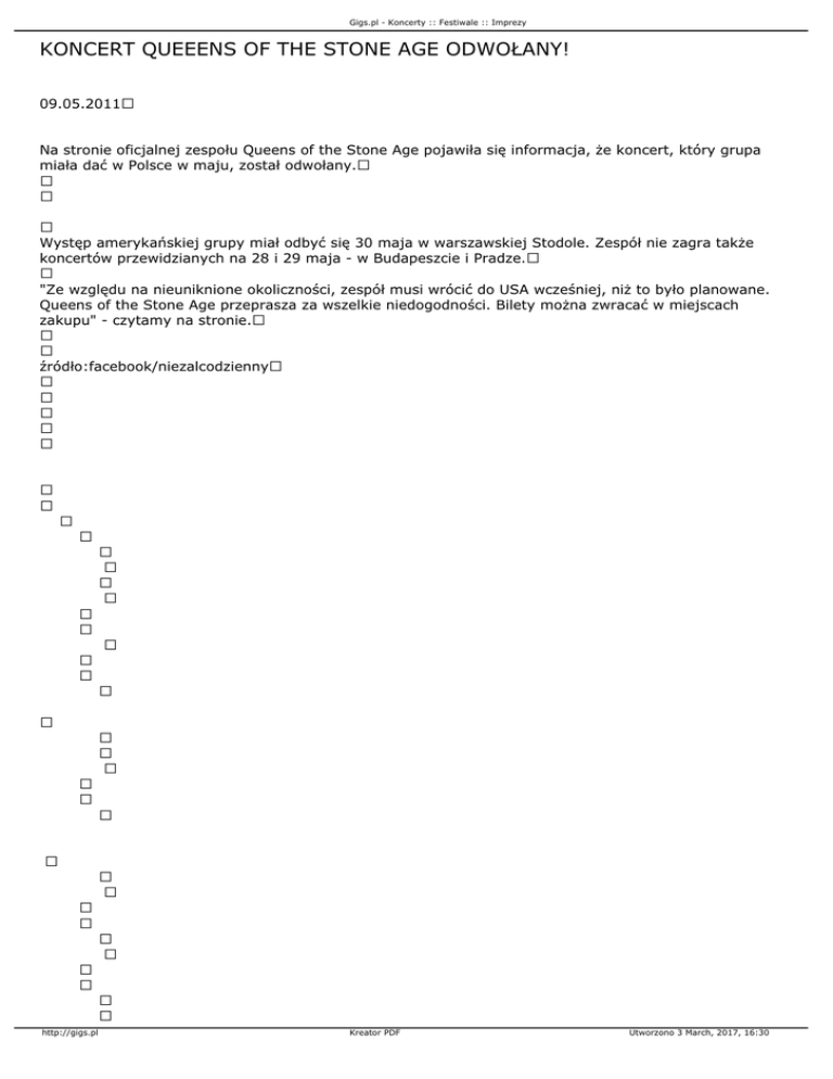 Gigs.pl - Koncerty :: Festiwale :: Imprezy KONCERT QUEEENS OF THE STONE AGE ODWOŁANY! 09.05.2011 Na stronie oficjalnej zespołu Queens of the Stone Age pojawiła się informacja, że koncert, który grupa miała dać w Polsce w maju, został odwołany. Występ amerykańskiej grupy miał odbyć się 30 maja w warszawskiej Stodole. Zespół nie zagra także koncertów przewidzianych na 28 i 29 maja - w Budapeszcie i Pradze. "Ze względu na nieuniknione okoliczności, zespół musi wrócić do USA wcześniej, niż to było planowane. Queens of the Stone Age przeprasza za wszelkie niedogodności. Bilety można zwracać w miejscach zakupu" - czytamy na stronie. źródło:facebook/niezalcodzienny http://gigs.pl Kreator PDF Utworzono 3 March, 2017, 16:30 Gigs.pl - Koncerty :: Festiwale :: Imprezy http://gigs.pl Kreator PDF Utworzono 3 March, 2017, 16:30