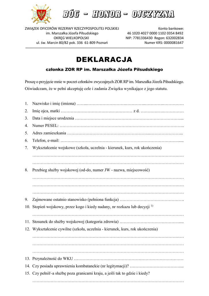 BÓG – HONOR – OJCZYZNA ZWIĄZEK OFICERÓW REZERWY RZECZYPOSPOLITEJ POLSKIEJ im. Marszałka Józefa Piłsudskiego OKRĘG WIELKOPOLSKI ul. św. Marcin 80/82 pok. 336 61-809 Poznań Konto bankowe: 46 1020 4027 0000 1102 0354 8492 NIP: 7781336430 Regon: 632002834 Numer KRS: 0000081647 _________________________________________________________________________________________________________________ DEKLARACJA członka ZOR RP im. Marszałka Józefa Piłsudskiego Proszę o przyjęcie mnie w poczet członków zwyczajnych ZOR RP im. Marszałka Józefa Piłsudskiego. Oświadczam, że w pełni akceptuję cele i zadania Związku wynikające z jego statutu. 1. Nazwisko i imię (imiona) ……..……………………….…………..………….…………… 2. Imię ojca, matki …………………………………………… z d. …………….…………… 3. Data i miejsce urodzenia …………………………………………………………………... 4. Numer PESEL: …………………………………………………………………………….. 5. Adres zamieszkania …………………………………………………...…………………... 6. Telefon, e-mail: …………………………………………………………………………..... 7. Wykształcenie wojskowe (szkoła, uczelnia - kierunek, kurs, rok ukończenia) ……………………………………………………………………………………………… ……………………………………………………………………………………………… 8. Przebieg służby wojskowej (od-do, numer JW - nazwa, miejscowość) ……………………………………………………………………………………………… ……………………………………………………………………………………………… ……………………………………………………………………………………………… 9. Zajmowane ostatnio stanowisko (pełniona funkcja) ………………………………………. 10. Stopień wojskowy, przez kogo i kiedy nadany, nr rozkazu lub decyzji 1) ……………………………………………………………………………………………… 11. Stosunek do służby wojskowej (kategoria zdrowia) ……………………………………..... 12. Wykształcenie cywilne (szkoła, uczelnia - kierunek, kurs, rok ukończenia) ……………………………………………………………………………………………… ……………………………………………………………………………………………… ……………………………………………………………………………………………… 13. Przynależność do WKU …………………………………………………………………… 14. Czy posiada uprawnienia kombatanckie (nr legitymacji)? ………………………………... 15. Czy pełnił/-a służbę poza granicami kraju, a jeśli tak to gdzie i kiedy? ……………………………………………………………………………………………… 16. Czy pełnił/-a służbę poza granicami kraju, a jeśli tak to gdzie i kiedy? ……………………………………………………………………………………………… 17. Czy posiada status weterana lub weterana poszkodowanego (nr legitymacji)? …………………………………………………………………………………....………… 18. Przynależność do organizacji, stowarzyszeń i pełnione funkcje ……………………………………………………………………………………………… ………………………………………………………………………………………............ ……………………………………………………………………………………………… ……………………………………………………………………………………………… 19. Posiadane najważniejsze ordery i odznaczenia, nr legitymacji, rok nadania 2) ……………………………………………………………………………………………… ……………………………………………………………………………………………… ……………………………………………………………………………………………… ……………………………………………………………………………………………… ……………………………………………………………………………………………… ……………………………………………………………………………………………… Do wniosku załączam moją aktualną fotografię w formacie legitymacyjnym. ………………………, dn. ….……… Miejscowość, data ………………………………. Podpis wnioskodawcy 3) Uchwała Zarządu Koła …………………………………………………………………………. o przyjęciu wnioskodawcy na członka zwyczajnego z dniem …………………………………. Nr legitymacji: ……………………………. …………………………………..……. Pieczęć Koła Nr odznaki ZOR RP: …………………….. …………………………………… Pieczęć i podpis Prezesa Koła ____________ W przypadku posiadania stopnia wojskowego, proszę dołączyć ksero pierwszej strony książeczki wojskowej i strony potwierdzającej mianowanie na stopień lub ksero innego dokumentu potwierdzającego mianowanie. 2) W przypadku posiadania orderu lub odznaczenia państwowego proszę o dołączenie ksero legitymacji. 3) Wyrażam zgodę na przetwarzanie moich danych osobowych zawartych w Deklaracji, dla potrzeb niezbędnych mojemu członkostwu w ZOR RP im. Marszałka Józefa Piłsudskiego, mając jednocześn