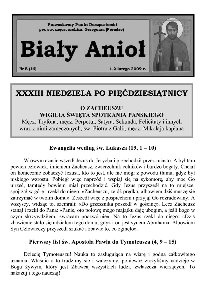 XXXIII NIEDZIELA PO PIĘĆDZIESIĄTNICY O ZACHEUSZU WIGILIA ŚWIĘTA SPOTKANIA PAŃSKIEGO Męcz. Tryfona, męcz. Perpetui, Satyra, Sekunda, Felicitaty i innych wraz z nimi zamęczonych, św. Piotra z Galii, męcz. Mikołaja kapłana Ewangelia według św. Łukasza (19, 1 – 10) W owym czasie wszedł Jezus do Jerycha i przechodził przez miasto. A był tam pewien człowiek, imieniem Zacheusz, zwierzchnik celników i bardzo bogaty. Chciał on koniecznie zobaczyć Jezusa, kto to jest, ale nie mógł z powodu tłumu, gdyż był niskiego wzrostu. Pobiegł więc naprzód i wspiął się na sykomorę, aby móc Go ujrzeć, tamtędy bowiem miał przechodzić. Gdy Jezus przyszedł na to miejsce, spojrzał w górę i rzekł do niego: «Zacheuszu, zejdź prędko, albowiem dziś muszę się zatrzymać w twoim domu». Zeszedł więc z pośpiechem i przyjął Go rozradowany. A wszyscy, widząc to, szemrali: «Do grzesznika poszedł w gościnę». Lecz Zacheusz stanął i rzekł do Pana: «Panie, oto połowę mego majątku daję ubogim, a jeśli kogo w czym skrzywdziłem, zwracam poczwórnie». Na to Jezus rzekł do niego: «Dziś zbawienie stało się udziałem tego domu, gdyż i on jest synem Abrahama. Albowiem Syn Człowieczy przyszedł szukać i zbawić to, co zginęło». Pierwszy list św. Apostoła Pawła do Tymoteusza (4, 9 – 15) Dziecię Tymoteuszu! Nauka to zasługująca na wiarę i godna całkowitego uznania. Właśnie o to trudzimy się i walczymy, ponieważ złożyliśmy nadzieję w Bogu żywym, który jest Zbawcą wszystkich ludzi, zwłaszcza wierzących. To nakazuj i tego nauczaj! Niechaj nikt nie lekceważy twego młodego wieku, lecz wzorem bądź dla wiernych w mowie, w obejściu, w miłości, w wierze, w czystości! Do czasu, aż przyjdę, przykładaj się do czytania, zachęcania, nauki. Nie zaniedbuj w sobie charyzmatu, który został ci dany za sprawą proroctwa i przez włożenie rąk kolegium prezbiterów. W tych rzeczach się ćwicz, cały im się oddaj, aby twój postęp widoczny był dla wszystkich. Rozważania niedzielne Niedziela o Zacheuszu jest pierwszą niedzielą przygotowawczą do Wielkiego Postu. Ewangelia przypadająca na dzisiejszy dzień rozpoczyna również pewien cykl czytań ewangelicznych, który ma na celu ukazać i uświadomić człowiekowi wchodzącemu w czas Wielkiego Postu jego kondycję duchową. Przez dwie kolejne niedziele będziemy słyszeli również przypowieści: ²o celniku i faryzeuszu², a następnie „o synu marnotrawnym. Wszystkie te czytania są przykładem głoszonej w Cerkwi Bożej pedagogii zbawienia, skierowanej do człowieka zagubionego i przytłoczonego brzemieniem grzechów. Ukazują bowiem drogę do nawrócenia i wspólnoty z Bogiem, sposób na utrzymanie wytyczonego kierunku i zachowanie się w momentach utraty orientacji oraz zejścia z tej drogi. Powinny zatem stanowić dla chrześcijanina – zwłaszcza w okresie wprowadzającym w Wielki Post – źródło refleksji i pociechy duchowej. Dzięki nim wszyscy mamy okazję poznać cele i motywy, jakimi powinniśmy kierować się w naszej drodze do Boga. Mamy szansę zobaczyć, że nasza droga ku Chrystusowi prowadzi poprzez urzeczywistnienie się naszego człowieczeństwa. Dzisiaj przed oczyma naszej duszy staje postać Zacheusza. Zacheusz jest bogatym człowiekiem. Ale jako poborca podatkowy należy do kategorii ludzi, którzy wśród Żydów otaczani są pogardą. Celnik, który z racji swego zawodu stale kontaktował się z różnymi ludźmi, także z poganami – uważany był za nieczystego. Powszechnie przypisywano celnikom chciwość, nienawidzono ich i unikano. Zacheusz był więc człowiekiem z marginesu. Miał wprawdzie bogactwo i dobrą posadę, ale nie cieszył się szacunkiem u ludzi o decydującym wpływie na społeczeństwo. Być może to było przyczyną, że Zacheusza tak bardzo interesował przebywający właśnie w Jerycho Jezus Chrystus. Zacheusz nie był, jak widać, jednym z tych bogaczy, którzy chcą tylko przyjemnie korzystać z dóbr, nie myśląc o niczym innym. Jego interesuje coś więcej. Zacheusz bardzo pragnie zobaczyć Jezusa. Powodem może tu być w dużej mierze ciekawość. W każdym razie to pragnienie jest tak silne, że zadaje sobie trudu, byle tylko dojrzeć Jezusa. Liczne osoby wokół Jezusa zasłaniają widok Zacheuszowi, który jest człowiekiem niskiego wzrostu. Ale Zacheusz jest pomysłowy. Biegnie naprzód, wyprzedza pochód, a zyskawszy na czasie, wchodzi na drzewo: wreszcie znalazł miejsce, z którego będzie mógł zobaczyć Jezusa. Zapewne nie dodaje powagi bogatemu człowiekowi wspinanie się na drzewo. To zajęcie dla dzieci. Ale Zacheusz godzi się na takie ośmieszenie. Więcej, ma również odwagę, ale też i wiarę, aby przyjąć Chrystusa u siebie w domu, chociaż naraził tym dla wielu. Jest przykładem odwagi i gotowości zerwania ze swoim starym stylem życia – z dala od Boga. Pozwolił, aby Bóg stał się na nowo obecny w jego życiu; zreorganizował je opierając na opoce wiary i zawierzenia się Bogu – Chrystusowi. Innymi słowy stał się przykładem właściwego nawrócenia, czyli metanoi. Będąc wyróżnionym przez Chrystusa nie szukał poklasku wśród innych z racji goszczenia u siebie samego Zbawiciela. Zdecydował się na położenie kresu eskalacji nienawiści i nieporozumień, związanych z zawodem, który wykonywał, deklarując zwrot niesłusznie nabytych dóbr. Przyjmując Chrystusa do swego domu i ... serca, rezygnując ze sztucznej małości, stał się – jak powiedział sam Chrystus – „autentycznym synem Abrahama”. Takiej Zacheuszowej postawy oczekuje od nas Bóg, tj. postawy w której entuzjazm idzie w parze z rozsądkiem, odwaga z wewnętrzną mądrością, wolność zaś z pokorą. Ks. Artur Aleksiejuk Zdaniem Ojców i nie tylko… «Nie podniosłem się z tej podłej ziemi jak celnik Zacheusz na wzniosłe drzewo mądrości, aby dostrzec Cię w boskiej kontemplacji, ale także i małoś