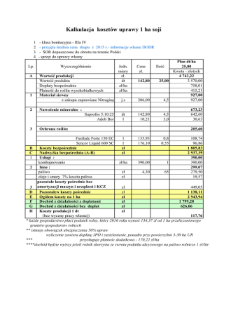 Kalkulacja kosztów uprawy 1 ha soji 1 2 3 4 - klasa bonitacyjna - IIIa IV - przyjęta średnia cena skupu z 2015 r.- informacje własne DODR - ŚOR dopuszczone do obrotu na terenie Polski - sprzęt do uprawy własny Lp. Wyszczególnienie A Wartość produkcji Wartość produktu Dopłaty bezpośrednie Płatność do roślin wysokobiałkowych Materiał siewny z zakupu zaprawiane Nitraginą 1 2 25,00 j.s 206,00 4,5 dt l 142,80 10,21 4,5 3,0 673,23 642,60 30,63 Cena zł. Ilość Nawożenie mineralne : Suprofos 5:10:25 Adob Bor 3 142,80 Plon dt/ha 25,00 Kwota - złotych 4 743,22 3 570,00 758,01 415,21 927,00 927,00 Jedn. miary zł. dt zł/ha zł/ha Ochrona roślin: 205,60 Fusilade Forte 150 EC l 135,93 0,8 108,74 Sencor Liquid 600 SC l 176,10 0,55 96,86 B Koszty bezpośrednie zł 1 805,83 C Nadwyżka bezpośrednia (A-B) zł 2 937,39 1 Usługi : 390,00 kombajnowanie zł/ha 390,00 1 390,00 2 Inne : 299,07 paliwo zł 4,30 65 279,50 oleje i smary 7% kosztu paliwa zł 19,57 pozostałe koszty pośrednie bez 3 amortyzacji maszyn i urządzeń i KCZ zł 449,05 D Pozostałew koszty pośrednie zł 1 138,11 E Ogółem koszty na 1 ha zł 2 943,94 F Dochód z działalności z dopłatami zł 1 799,28 G Dochód z działalności bez dopłat zł 626,06 H Koszty produkcji 1 dt zł (bez wyceny pracy własnej) 117,76 * każde gospodarstwo płaci podatek rolny, który 2016 roku wynosi 134,37 zł od 1 ha przeliczeniowego gruntów gospodarstw rolnych ** istnieje obowiązek ubezpieczenia 50% upraw wyliczenie zawiera dopłatę JPO i zazielenienie, ponadto przy powierzchni 3-30 ha UR *** przysługuje płatnośc dodatkowa - 170,22 zł/ha ****dochód będzie wyższy jeżeli rolnik skorzysta ze zwrotu podatku akcyzowego na paliwo rolnicze 1 zł/litr