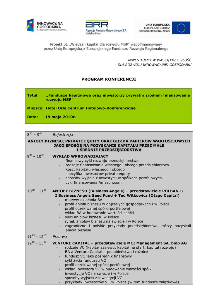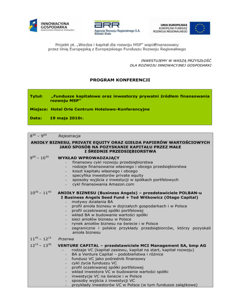INWESTUJEMY W WASZĄ PRZYSZŁOŚĆ DLA ROZWOJU INNOWACYJNEJ GOSPODARKI PROGRAM KONFERENCJI Tytuł: „Fundusze kapitałowe oraz inwestorzy prywatni źródłem finansowania rozwoju MSP” Miejsce: Hotel Orle Centrum Hotelowo-Konferencyjne Data: 19 maja 2010r. 830 – 900 Rejestracja ANIOŁY BIZNESU, PRIVATE EQUITY ORAZ GIEŁDA PAPIERÓW WARTOŚCIOWYCH JAKO SPOSÓB NA POZYSKANIE KAPITAŁU PRZEZ MAŁE I ŚREDNIE PRZEDSIĘBIORSTWA 900 – 1030 WYKŁAD WPROWADZAJĄCY - finansowy cykl rozwoju przedsiębiorstwa - rodzaje finansowania własnego i obcego przedsiębiorstwa - koszt kapitału własnego i obcego - specyfika inwestorów private equity - sposoby wyjścia z inwestycji w spółkach portfelowych - cykl finansowania Amazon.com 1030 – 1145 ANIOŁY BIZNESU (Business Angels) – przedstawiciele POLBAN-u I Business Angels Seed Fund + Ted Witkowicz (Otago Capital) - motywy działania BA - profil anioła biznesu w dojrzałych gospodarkach i w Polsce - profil oczekiwanej spółki portfelowej - wkład BA w budowanie wartości spółki - sieci aniołów biznesu w Polsce - rynek aniołów biznesu na świecie i w Polsce - zagraniczne i polskie przykłady przedsiębiorców, którzy pozyskali anioła biznesu 1145 – 1215 Przerwa 12 15 – 13 30 VENTURE CAPITAL – przedstawiciele MCI Management SA, bmp AG − rodzaje VC (kapitał zasiewu, kapitał na start, kapitał rozwoju) - BA a Venture Capital – podobieństwa i róŜnice - fundusz VC jako pośrednik finansowy - cykl Ŝycia funduszu VC - profil oczekiwanej spółki portfelowej - wkład inwestora VC w budowanie wartości spółki - inwestycje VC na świecie i w Polsce - sposoby wyjścia z inwestycji VC - przykłady inwestorów VC w Polsce (w tym fundusze zaląŜkowe) 1330 – 1415 14 15 – 16 00 przykłady zagranicznych pozyskały VC i polskich spółek portfelowych, które Przerwa na lunch FINANSOWANIE PÓŹNIEJSZYCH ETAPÓW ROZWOJU SPÓŁEK PRZEZ FUNDUSZE PRIVATE EQUITY - finansowanie wykupów menedŜerskich (MBO) i lewarowanych (LBO) - istota wykupu menedŜerskiego i lewarowanego - przykłady wykupów MBO i LBO w Polsce - finansowanie z wykorzystaniem długu podporządkowanego (mezzanine) - rodzaje instrumentów o charakterze mezzanine - przykłady inwestorów mezzanine w Polsce - przykłady spółek, które pozyskały mezzanine - finansowanie pozostałych etapów rozwoju spółki przez fundusze PE finansowanie pomostowe (istota i przykłady spółek portfelowych) NEW CONNECT JAKO PRZEDSIONEK GPW W WARSZAWIE - korzyści i wady bycia spółką giełdową - specyfika rynku w porównaniu z WGPW - koszty wejścia - przykłady IPO na New Connect GPW W WARSZAWIE JAKO SPOSÓB NA POZYSKANIE KAPITAŁU NA ROZWÓJ - pierwsza oferta publiczna (IPO) na WGPW - proces IPO - koszty IPO - rynek IPO w Polsce w okresie 2005-2009 - przykłady IPO na WGPW - wtórna oferta publiczna - przykłady 1600 – 1615 Sesja pytań. Zakończenie konferencji.