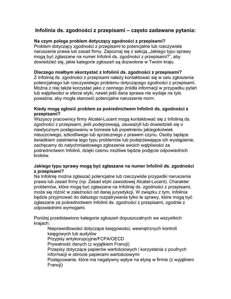 Infolinia ds. zgodności z przepisami – często zadawane pytania: Na czym polega problem dotyczący zgodności z przepisami? Problem dotyczący zgodności z przepisami to potencjalne lub rzeczywiste naruszenie prawa lub zasad firmy. Zapoznaj się z sekcją „Jakiego typu sprawy mogą być zgłaszane na numer Infolinii ds. zgodności z przepisami?”, aby dowiedzieć się, jakie kategorie zgłoszeń są dozwolone w Twoim kraju. Dlaczego miałbym skorzystać z Infolinii ds. zgodności z przepisami? Z Infolinią ds. zgodności z przepisami należy kontaktować się w celu zgłoszenia potencjalnego lub rzeczywistego problemu dotyczącego zgodności z przepisami. Można z niej także korzystać jako z cennego źródła informacji w przypadku pytań lub wątpliwości w sferze etyki, nawet jeśli dana sprawa nie wydaje na tyle poważna, aby mogła stanowić potencjalne naruszenie norm. Kiedy mogę zgłosić problem za pośrednictwem Infolinii ds. zgodności z przepisami? Wszyscy pracownicy firmy Alcatel-Lucent mogą kontaktować się z Infolinią ds. zgodności z przepisami, jeśli podejrzewają, zauważyli lub dowiedzieli się o nieetycznym postępowaniu w biznesie lub popełnieniu jakiegokolwiek nieuczciwego, szkodliwego lub sprzecznego z prawem czynu. Osoby będące świadkiem zaistnienia tego typu problemów lub podejrzewające ich wystąpienie, zachęcamy do natychmiastowego zgłoszenia swoich wątpliwości za pośrednictwem Infolinii, dzięki czemu możliwe będzie podjęcie odpowiednich kroków. Jakiego typu sprawy mogą być zgłaszane na numer Infolinii ds. zgodności z przepisami? Na Infolinię można zgłaszać potencjalne lub rzeczywiste przypadki naruszenia prawa lub zasad firmy (np. Zasad etyki zawodowej Alcatel-Lucent). Charakter problemów, które mogą być zgłaszane na Infolinię ds. zgodności z przepisami, może się różnić w zależności od danej jurysdykcji. W związku z tym, Infolinia będzie przyjmować do dalszego rozpatrywania tylko te sprawy, które mogą być zgłaszane za pośrednictwem Infolinii ds. zgodności z przepisami, zgodnie z odpowiednimi wymogami. Poniżej przedstawiono kategorie zgłoszeń dopuszczalnych we wszystkich krajach: Nieprawidłowości dotyczące księgowości, wewnętrznych kontroli księgowych lub audytów Przypisy antykorupcyjne/FCPA/OECD Prywatność danych (z wyjątkiem Francji) Przepisy dotyczące papierów wartościowych i korzystania z poufnych informacji w obrocie papierami wartościowymi Postępowanie, które ma negatywny wpływ na etykę w firmie (z wyjątkiem Francji) Poniższe kategorie zgłoszeń są dopuszczalne poza Unią Europejską: Działania podlegające przepisom antymonopolowym Bezpieczeństwo zasobów komputerowych Konflikt interesów Ochrona środowiska, bezpieczeństwo i higiena w miejscu pracy Fałszowanie umów, raportów lub kartotek Napastowanie lub dyskryminacja Zgodność sprzętowa produktów Prawa człowieka Import/eksport Nieprawidłowe pożyczki Niestosowne prezenty i rozrywka Niewłaściwe korzystanie z telefonu, Internetu lub poczty elektronicznej Dostosowanie stanowiska pracy Problemy pracownicze Bezprawne korzystanie z funduszy firmy Sprawy związane z bezpieczeństwem narodowym Bezpieczeństwo fizyczne Informacje zastrzeżone Działania odwetowe wobec osób zgłaszających nieprawidłowości Sabotaż lub wandalizm Molestowanie seksualne Inżynieria społeczna Kradzież Groźby/obraźliwe wypowiedzi Nieautoryzowane/nieuczciwe wykorzystywanie obiektów lub sprzętu firmowego Naruszenie polityki Nieprawidłowości płacowe i dotyczące czasu pracy Przemoc w miejscu pracy Kto może zgłaszać problemy na Infolinię ds. zgodności z przepisami? Wszyscy pracownicy firmy Alcatel-Lucent mogą zgłaszać problemy na Infolinię ds. zgodności z przepisami. Dodatkowo, tam gdzie pozwalają na to miejscowe przepisy prawa, z Infolinii ds. zgodności mogą korzystać pracownicy nieetatowi, dostawcy, klienci i inni interesariusze firmyAlcatel. Jeżeli miejscowe przepisy prawa nie pozwalają na zgłaszanie problemów przez osoby inne niż etatowi pracownicy, osoba zgłaszająca zostanie poinformowana o możliwości wykorzystania innych kanałów w celu przekazania danej sprawy. Co się dzieje po zgłoszeniu sprawy na Infolinię ds. zgodności z przepisami? Infolinia ds. zgodności, jako narzędzie, jest administrowana przez zewnętrzną firmę, EthicsPoint, Inc. EthicsPoint działa jako kontraktowy administrator danych w imieniu firmy. W trakcie kontaktu z Infolinią ds. zgodności z przepisami lub po złożeniu raportu na stronie internetowej, specjalista z centrum telefonicznego firmy EticsPoint poprosi Cię o podanie szczegółowych informacji. Podczas rozmowy ze specjalistą na Infolinii możesz zachować anonimowość, o ile prawo na to pozwala – spowoduje to jednak ograniczenie możliwości pełnego wyjaśnienia sprawy. W związku z tym zachęcamy do podania swojej tożsamości. Jeżeli ją podasz, zostanie ona potraktowana jako informacja poufna w trakcie procesu rozpatrywania sprawy, w zakresie dopuszczalnym przez miejscowe przepisy i zasady firmy. Musisz się również przygotować na to, aby podać nazwiska świadków i potencjalnych poszkodowanych w wyniku domniemanego naruszenia (o ile chcesz to uczynić), co pozwoli zwiększyć skuteczność postępowania wyjaśniającego w danej sprawie. Specjalista przekaże pytanie lub zgłoszoną sprawę do odpowiedniego działu firmy Alcatel-Lucent. Specjalista z centrum telefonicznego firmy EthicsPoint nie może udzielić porady ani załatwić sprawy drogą telefoniczną. Jeśli dana sprawa jest pilna, specjalista przyjmie informacje i przekaże je odpowiedniej osobie w firmie Alcatel-Lucent, która skontaktuje się z Tobą w celu udzielenia natychmiastowej pomocy. Specjalista z centrum telefonicznego przekaże klucz zgłoszenia i hasło dostępu do sekcji „Śledzenie raportu” na stronie internetowej Infolinii ds. zgodności z przepisami, do której uzyskasz