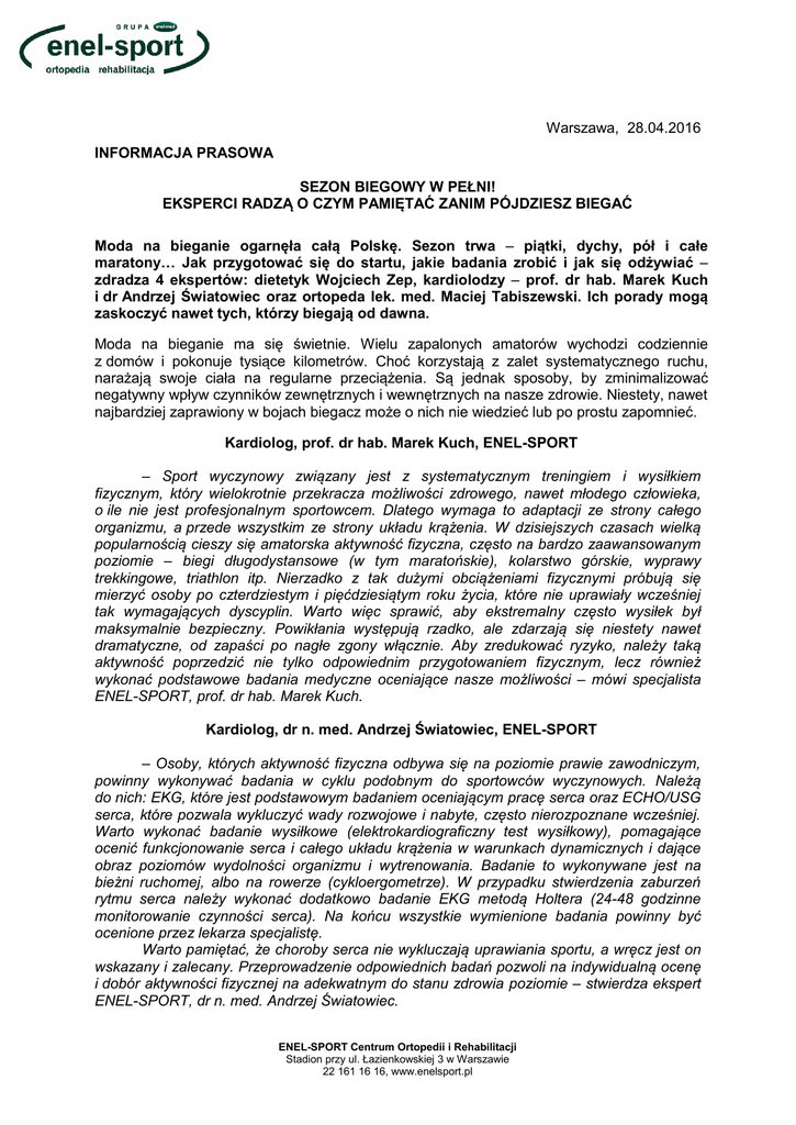 Warszawa, 28.04.2016 INFORMACJA PRASOWA SEZON BIEGOWY W PEŁNI! EKSPERCI RADZĄ O CZYM PAMIĘTAĆ ZANIM PÓJDZIESZ BIEGAĆ Moda na bieganie ogarnęła całą Polskę. Sezon trwa – piątki, dychy, pół i całe maratony… Jak przygotować się do startu, jakie badania zrobić i jak się odżywiać – zdradza 4 ekspertów: dietetyk Wojciech Zep, kardiolodzy – prof. dr hab. Marek Kuch i dr Andrzej Światowiec oraz ortopeda lek. med. Maciej Tabiszewski. Ich porady mogą zaskoczyć nawet tych, którzy biegają od dawna. Moda na bieganie ma się świetnie. Wielu zapalonych amatorów wychodzi codziennie z domów i pokonuje tysiące kilometrów. Choć korzystają z zalet systematycznego ruchu, narażają swoje ciała na regularne przeciążenia. Są jednak sposoby, by zminimalizować negatywny wpływ czynników zewnętrznych i wewnętrznych na nasze zdrowie. Niestety, nawet najbardziej zaprawiony w bojach biegacz może o nich nie wiedzieć lub po prostu zapomnieć. Kardiolog, prof. dr hab. Marek Kuch, ENEL-SPORT – Sport wyczynowy związany jest z systematycznym treningiem i wysiłkiem fizycznym, który wielokrotnie przekracza możliwości zdrowego, nawet młodego człowieka, o ile nie jest profesjonalnym sportowcem. Dlatego wymaga to adaptacji ze strony całego organizmu, a przede wszystkim ze strony układu krążenia. W dzisiejszych czasach wielką popularnością cieszy się amatorska aktywność fizyczna, często na bardzo zaawansowanym poziomie – biegi długodystansowe (w tym maratońskie), kolarstwo górskie, wyprawy trekkingowe, triathlon itp. Nierzadko z tak dużymi obciążeniami fizycznymi próbują się mierzyć osoby po czterdziestym i pięćdziesiątym roku życia, które nie uprawiały wcześniej tak wymagających dyscyplin. Warto więc sprawić, aby ekstremalny często wysiłek był maksymalnie bezpieczny. Powikłania występują rzadko, ale zdarzają się niestety nawet dramatyczne, od zapaści po nagłe zgony włącznie. Aby zredukować ryzyko, należy taką aktywność poprzedzić nie tylko odpowiednim przygotowaniem fizycznym, lecz również wykonać podstawowe badania medyczne oceniające nasze możliwości – mówi specjalista ENEL-SPORT, prof. dr hab. Marek Kuch. Kardiolog, dr n. med. Andrzej Światowiec, ENEL-SPORT – Osoby, których aktywność fizyczna odbywa się na poziomie prawie zawodniczym, powinny wykonywać badania w cyklu podobnym do sportowców wyczynowych. Należą do nich: EKG, które jest podstawowym badaniem oceniającym pracę serca oraz ECHO/USG serca, które pozwala wykluczyć wady rozwojowe i nabyte, często nierozpoznane wcześniej. Warto wykonać badanie wysiłkowe (elektrokardiograficzny test wysiłkowy), pomagające ocenić funkcjonowanie serca i całego układu krążenia w warunkach dynamicznych i dające obraz poziomów wydolności organizmu i wytrenowania. Badanie to wykonywane jest na bieżni ruchomej, albo na rowerze (cykloergometrze). W przypadku stwierdzenia zaburzeń rytmu serca należy wykonać dodatkowo badanie EKG metodą Holtera (24-48 godzinne monitorowanie czynności serca). Na końcu wszystkie wymienione badania powinny być ocenione przez lekarza specjalistę. Warto pamiętać, że choroby serca nie wykluczają uprawiania sportu, a wręcz jest on wskazany i zalecany. Przeprowadzenie odpowiednich badań pozwoli na indywidualną ocenę i dobór aktywności fizycznej na adekwatnym do stanu zdrowia poziomie – stwierdza ekspert ENEL-SPORT, dr n. med. Andrzej Światowiec. ENEL-SPORT Centrum Ortopedii i Rehabilitacji Stadion przy ul. Łazienkowskiej 3 w Warszawie 22 161 16 16, www.enelsport.pl Dietetyk, mgr Wojciech Zep, ENEL-SPORT – Trening jest oczywiście podstawą przygotowania startowego, jednak należy zwrócić uwagę na kilka aspektów dotyczących żywienia, które sprzyjają poprawie wyników sportowych i zapobiegają niszczeniu zdrowia. Najważniejsze jest nawodnienie – minimalna ilość wody bez treningu, to 30 ml na kilogram masy ciała. Jeśli ktoś waży np. 75 kg powinien pić 2,25 l wody średniozmineralizowanej w ciągu całego dnia. Na każdą godzinę wysiłku powinien dodać ok. 0,5 – 0,75 l wody lub izotoniku. Bardzo zdrowy zwyczaj to szklanka wody jako pierwsza czynność w ciągu dnia, może być z cytryną, miodem lub imbirem. Dietę należy dostosować do intensywności treningu. Gdy trenuje się więcej, należy też więcej jeść. Jeśli dodatkowo pojawia się wysiłek o wysokiej intensywności, trzeba wprowadzić do diety więcej węglowodanów – zwłaszcza zwrócić uwagę na ich potreningowe uzupełnienie. Minimalna ilość to 50 g węglowodanów, czyli np. dwa banany. Na dwa do trzech dni przed startem należy wprowadzić do diety dodatkowe porcje węglowodanów, żeby zgromadzić odpowiedni zapas glikogenu, który zaopatrzy mięśnie w paliwo. Do standardowego menu można dołączyć mus owocowy, dżem, konfitury, owoce, pełnoziarniste pieczywo, makarony, ryż brązowy czy kasze. Można również skorzystać z odżywek węglowodanowych. Z kolei, jeden do dwóch dni po starcie, dobrze jest zwiększyć w diecie zawartość produktów białkowych (tak długo, jak odczuwa się tzw. „zakwasy”). Pozwoli to na lepszą odbudowę uszkodzonych w trakcie biegu struktur mięśniowych. Warto wprowadzić białko jaj, dodatkową porcję mięsa lub ryb, rośliny strączkowe, a przed spaniem ser twarogowy. Idealnie jeśli będą to 4 porcje po ok. 25 g białka w ciągu całego dnia. – tłumaczy dietetyk, mgr Wojciech Zep, z zespołu dietetyków ENEL-SPORT Ortopeda, lek. med. Maciej Tabiszewski, ENEL-SPORT – Należy pamiętać o odpowiedniej rozgrzewce. Przed każdą wzmożoną aktywnością fizyczną trzeba przygotować ciało poprzez jego odpowiednie rozgrzanie, zwiększenie przepływu krwi przez wielkie partie mięśniowe. Stopniowo trzeba zwiększać obciążenia (dystans, intensywność treningu). Każdemu zdarza się czasem przerwa w regularnym bieganiu spowodowana urlopem, chorobą czy k