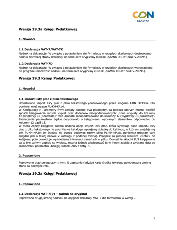 Wersja 19.3a Księgi Podatkowej 1. Nowości 1.1 Deklaracja VAT-7/VAT-7K Nadruk na deklaracje. W związku z pojawieniem się formularzy w urzędach skarbowych dostosowano nadruk pierwszej strony deklaracji na formularz oryginalny (DRUK: „SAMIN DRUK” druk V.2009r.). 1.2 Deklaracja VAT-7D Nadruk na deklaracje. W związku z pojawieniem się formularzy w urzędach skarbowych wprowadzono do programu moŜliwość nadruku na formularz oryginalny (DRUK: „SAMIN DRUK” druk V.2009r.). Wersja 19.3 Księgi Podatkowej 1. Nowości 1.1 Import listy płac z pliku tekstowego UmoŜliwiono import listy płac z pliku tekstowego generowanego przez program CDN OPT!MA. Plik powinien mieć nazwę PL-KH-KP.txt. W Konfiguracji-> Parametry firmy zostały dodane dwa parametry, za pomocą których moŜna określić sposób księgowania innych wypłat oraz dodatków nieopodatkowanych: „Inne wypłaty do kolumny 12 (wypłaty)/13 (pozostałe)” oraz „Dodatki nieopodatkowane do kolumny 12 (wypłaty)/13 (pozostałe)”. Zaznaczenie parametrów będzie decydowało o księgowaniu wybranych elementów odpowiednio do kolumny 12 bądź 13. W menu Zapisy księgowe została dodana opcja Import listy płac, która wywołuje okno importu listy płac z pliku tekstowego. W polu Nazwa katalogu wpisujemy ścieŜkę do katalogu, w którym znajduje się plik PL-KH-KP.txt (w ścieŜce nie trzeba podawać nazwy pliku PL-KH-KP.txt, poniewaŜ program sam znajdzie plik o takiej nazwie w katalogu z podanej ścieŜki). Przejście za pomocą klawisza <Enter> do kolejnego pola powoduje wyświetlenie informacji zawartych w pliku. Domyślnie składki ZUS księgowane są w tym samym zapisie co wypłaty, moŜna jednak zaksięgować je w innym zapisie z wybraną datą po zaznaczeniu parametru „Księguj składki ZUS z datą…”. 2. Poprawiono Poprawiono błąd polegający na tym, iŜ zapisanie (edycja) karty środka trwałego powodowała zmianę stanu na początek roku. Wersja 19.2a Księgi Podatkowej 1. Poprawiono 1.1 Deklaracja VAT-7(9) – nadruk na oryginał Poprawiono drugą stronę nadruku na oryginał deklaracji VAT-7 dla formularza w wersji 9. 1 Wersja 19.2 Księgi Podatkowej 1. Nowości 1.1 Deklaracja VAT-7D Ustawa z dnia 7 listopada 2008 r. o zmianie ustawy o podatku od towarów i usług (Dz. U. nr 209 poz. 1320 z 2008 r.) wprowadziła moŜliwość kwartalnych rozliczeń dla szerszej grupy podatników niŜ do tej pory. Rozporządzenie Ministra Finansów z dnia 28 listopada 2008 r. (Dz. U. nr 211, poz. 1333 z 2008 r.) w sprawie wzorów deklaracji podatkowych dla podatku od towarów i usług wprowadziło wzór nowej deklaracji dla podatku od towarów i usług o symbolu VAT-7D. Do tej pory podatnik mógł rozliczać się z podatku miesięcznie (na deklaracji VAT-7 – wszyscy podatnicy) lub kwartalnie (na deklaracji VAT-7K – tzw. mali podatnicy). Ustawa wprowadziła trzecią moŜliwość, dla podatników innych niŜ mali podatnicy, do rozliczania się w okresach kwartalnych. Nowa deklaracja kwartalna róŜni się od deklaracji VAT-7K tym, Ŝe podatnicy wpłacają zaliczki na podatek za pierwsze dwa miesiące kwartału, a później rozliczają je w deklaracji kwartalnej razem z naleŜnością za trzeci miesiąc. W związku z tymi zmianami wprowadzone zostały zmiany w konfiguracji, aby umoŜliwić wyliczenie deklaracji VAT-7D. W Konfiguracji -> Parametry firmy po zaznaczeniu parametru Kwartalne rozliczanie dekl. VAT-7 pojawiają się do wyboru dwie moŜliwości: VAT-7K oraz VAT-7D. W przypadku kiedy zmieniamy sposób liczenia deklaracji np. z miesięcznej na kwartalny powoduje to usunięcie zapisanych deklaracji – pojawia się wtedy informujący o tym komunikat: „Zmiana metody rozliczenia VAT-7 spowoduje usunięcie zapisanych deklaracji począwszy od … Czy jesteś pewien?”. Zaznaczenie w konfiguracji kwartalnego rozliczania deklaracji VAT-7 i wybranie VAT-7D powoduje, iŜ deklaracja liczona jest na formularzu VAT-7D(1). Podatnik wpłaca w kolejnym kwartale zaliczkę miesięczną na podatek VAT w pierwszym i drugim miesiącu kwartału w wysokości 1/3 kwoty naleŜnego zobowiązania podatkowego wynikającego z deklaracji złoŜonej za kwartał poprzedni. W polu 56 wpisywane jest 2/3 wysokości zobowiązania podatkowego z poprzedniego kwartału, pole to jest aktywne i moŜliwe do zmiany przez UŜytkownika. Jest równieŜ moŜliwość wydrukowania trzech przelewów do US z tej deklaracji: kwota zaliczki za pierwszy i drugi kwartał (z pola 56) oraz kwota do zapłaty z pola 58. Przy generowaniu przelewu pojawia się pytanie, dla którego miesiąca kwartału przelew ma być generowany. Na tej deklaracji równieŜ jest moŜliwość wykazywania importu towarów podlegającego rozliczeniu zgodnie z art.33a ustawy. Aby dokument został zakwalifikowany do tej pozycji musi być to faktura wewnętrzna sprzedaŜy ze statusem Exp. lub Z. exp i rodzajem Towary lub Środki transportu. 1.2 Zmiany PIT-4R Został wprowadzony nowy wzór deklaracji PIT-4R obowiązujący w roku 2009. Jest to wzór 3. Wersja 19.1 Księgi Podatkowej 1. Nowości 1.1 Zmiany w VAT Rozporządzenie Ministra Finansów z dnia 28 listopada 2008 r. (Dz. U. nr 211, poz. 1333 z 2008 r.) w sprawie wzorów deklaracji podatkowych dla podatku od towarów i usług wprowadziło nowe wzory 2 formularzy VAT-7 wersja 10, VAT-7K wersja 4. W związku z tymi zmianami wprowadzone zostały zmiany w konfiguracji, aby umoŜliwić wyliczenie odpowiedniej dla Podatnika deklaracji. W Konfiguracji -> Dekl. VAT-7/VAT-UE został usunięty formularz VAT w wersji 8, a pojawił się nowy w wersji 10. JeŜeli w konfiguracji wybrana jest wersja formularza 9 wtedy deklaracje liczą się w oparciu o stare formularze: VAT-7(9) i VAT-7K(3). Natomiast jeŜeli w konfiguracji wybrana zostanie nowa wersja formularza 10, wtedy deklaracje liczone są w oparciu o nowe formularze: VAT-7(10) i VAT-7K(4). Na nowych wzorach deklaracji jest moŜliwość wykazywania importu towarów podlegającego rozliczeniu zgodni