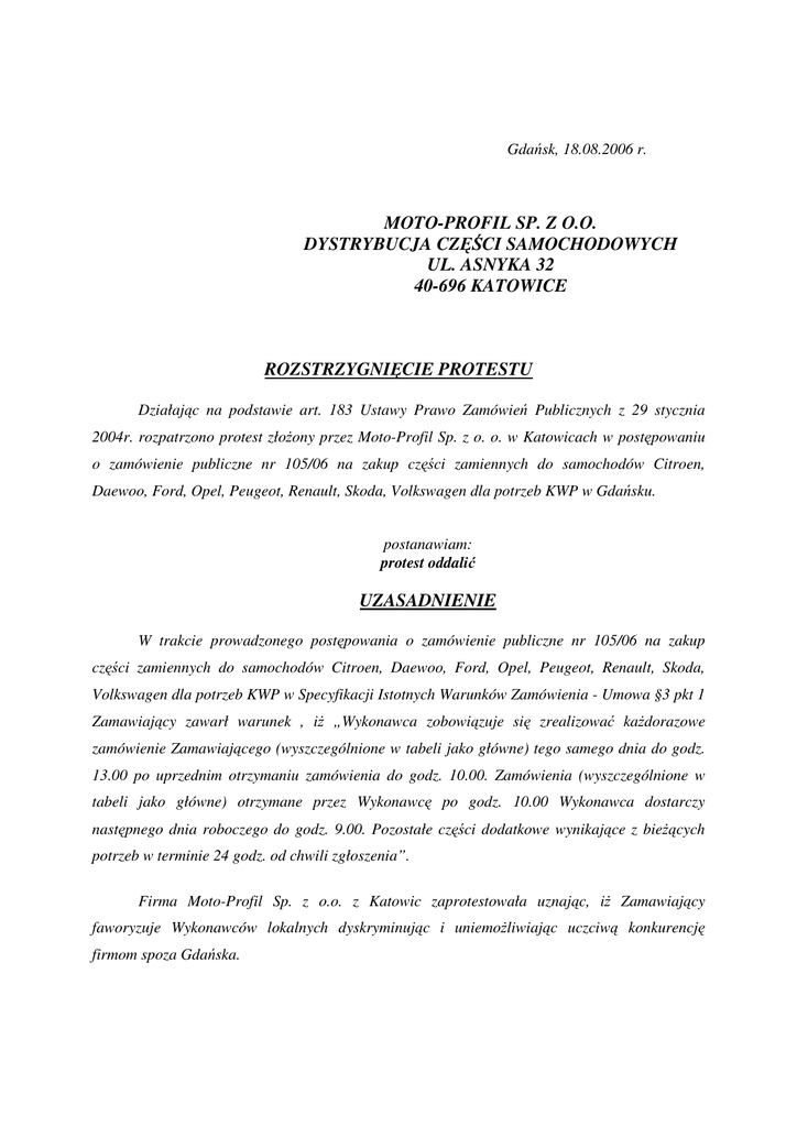 Gda sk, 18.08.2006 r. MOTO-PROFIL SP. Z O.O. DYSTRYBUCJA CZ CI SAMOCHODOWYCH UL. ASNYKA 32 40-696 KATOWICE ROZSTRZYGNI CIE PROTESTU Działaj c na podstawie art. 183 Ustawy Prawo Zamówie Publicznych z 29 stycznia 2004r. rozpatrzono protest zło ony przez Moto-Profil Sp. z o. o. w Katowicach w post powaniu o zamówienie publiczne nr 105/06 na zakup cz ci zamiennych do samochodów Citroen, Daewoo, Ford, Opel, Peugeot, Renault, Skoda, Volkswagen dla potrzeb KWP w Gda sku. postanawiam: protest oddali UZASADNIENIE W trakcie prowadzonego post powania o zamówienie publiczne nr 105/06 na zakup cz ci zamiennych do samochodów Citroen, Daewoo, Ford, Opel, Peugeot, Renault, Skoda, Volkswagen dla potrzeb KWP w Specyfikacji Istotnych Warunków Zamówienia - Umowa §3 pkt 1 Zamawiaj cy zawarł warunek , i „Wykonawca zobowi zuje si zrealizowa ka dorazowe zamówienie Zamawiaj cego (wyszczególnione w tabeli jako główne) tego samego dnia do godz. 13.00 po uprzednim otrzymaniu zamówienia do godz. 10.00. Zamówienia (wyszczególnione w tabeli jako główne) otrzymane przez Wykonawc po godz. 10.00 Wykonawca dostarczy nast pnego dnia roboczego do godz. 9.00. Pozostałe cz ci dodatkowe wynikaj ce z bie cych potrzeb w terminie 24 godz. od chwili zgłoszenia”. Firma Moto-Profil Sp. z o.o. z Katowic zaprotestowała uznaj c, i faworyzuje Wykonawców lokalnych dyskryminuj c i uniemo liwiaj c uczciw firmom spoza Gda ska. Zamawiaj cy konkurencj Z uwagi na specyfik pracy Policji, co wi e si m.in. z zabezpieczeniem stałej gotowo ci i nieprzerwanej eksploatacji pojazdów słu bowych, warunek zawarty w SIWZ jest niezb dny do prawidłowego jej funkcjonowania. Poj cie niemo liwo ci wiadczenia zwi zane jest ze stanem obiektywnej niemo liwo ci jego spełnienia odnosz cej si do wszystkich a nie tylko do konkretnego Wykonawcy. Je eli spełnienie wiadczenia jest niemo liwe tylko dla konkretnego Wykonawcy a mo e by spełnione przez inne podmioty to nie mo e by mowy o niemo liwo ci wiadczenia. Bior c pod uwag powy sze postanawiam jak na wst pie. Zgodnie z art. 184 Ustawy prawo zamówie publicznych w terminie 5 dni od dor czenia rozstrzygni cia protestu zainteresowanemu przysługuje odwołanie do Prezesa Urz du Zamówie Publicznych. Pomorski Komendant Wojewódzki Policji w Gda sku z up. I Zast pca Komendanta Wojewódzkiego Policji w Gda sku insp. Stanisław Gutowski Wyk. w 2 egz. Egz. nr 1 – adresat Egz. nr 2 – a/a