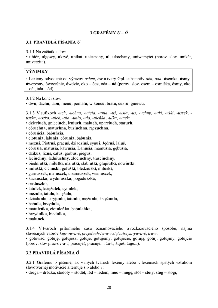 3 GRAFÉMY U – Ó 3.1. PRAVIDLÁ PÍSANIA U 3.1.1 Na začiatku slov: • ubiór, ulgowy, ukryć, unikat, ucieszony, ul, ukochany, uniwersytet (porov. slov. unikát, univerzita). VÝNIMKY ◦ Lexémy odvodené od výrazov osiem, ów a tvary Gpl. substantív oko, oda: ósemka, ósmy, ówczesny, ówcześnie, ówdzie, oko – ócz, oda – ód (porov. slov. osem – osmička, ôsmy, oko – očí, óda – ód). 3.1.2 Na konci slov: • dwu, dachu, tabu, menu, pomału, w końcu, bratu, cukru, gniewu. 3.1.3 V sufixoch -uch, -uchna, -uńcia, -unia, -uś, -usia, -us, -uchny, -utki, -uśki, -uszek, uszka, -uszko, -ulek, -ulo, -unio, -ula, -uleńka, -ulka, -unek: • dzieciuch, gnieciuch, leniuch, maluch, uparciuch, staruch, • córuchna, matuchna, buziuchna, rączuchna, • córuńcia, babuńcia, • ciotunia, lalunia, córunia, babunia, • mężuś, Piotruś, pracuś, dziadziuś, synuś, Jędruś, laluś, • córusia, matusia, kawusia, Danusia, mamusia, gębusia, • dzikus, lizus, całus, garbus, piegus, • leciuchny, ładniuchny, złociuchny, tłuściuchny, • biedniutki, milutki, malutki, słabiutki, głupiutki, nowiutki, • miluśki, cichuśki, goluśki, bledziuśki, miluśki, • garnuszek, maluszek, uparciuszek, wianuszek, • kaczuszka, wydmuszka, pogaduszka, • serduszko, • tatulek, księżulek, synulek, • mężulo, tatulo, księżulo, • dziadunio, stryjunio, tatunio, mężunio, księżunio, • babula, brzydula, • matuleńka, ciotuleńka, babuleńka, • brzydulka, biedulka, • malunek. 3.1.4 V tvaroch prítomného času oznamovacieho a rozkazovacieho spôsobu, najmä slovesných vzorov kup-ow-a-ć, przysłuch-iw-a-ć się/zatrzym-yw-a-ć, tru-ć: • gotować: gotuję, gotujesz, gotuje, gotujemy, gotujecie, gotują, gotuj, gotujmy, gotujcie (porov. slov prac-ov-a-ť, pracuješ, pracuje..., žu-ť, žuješ, žuje...). 3.2 PRAVIDLÁ PÍSANIA Ó 3.2.1 Grafému ó píšeme, ak v iných tvaroch lexémy alebo v lexémach spätých vzťahom slovotvornej motivácie alternuje s o alebo e: • droga – dróżka, stodoły – stodół, lód – lodem, móc – mogę, stół – stoły, stóg – stogi, 20 • popiół – w popiele, kościół – w kościele, brzózka – brzezina, pióro – pierze, przyjaciel – przyjaciółka. 3.2.2 V koreňových morfémach slovies vyjadrujúcich jednorazovú činnosť (v koreňoch slovies vyjadrujúcich opakovanú činnosť vystupuje a): • mówić – mawiać, skrócić – skracać, wrócić – wracać, powtórzyć – powtarzać. 3.2.3 V Gpl. maskulín: • panów, stołów, zeszytów, chłopców, rodziców, ptaków, kwiatów (porov. slov. pánov, stolov). 3.2.4 V sufixoch -ów, -ówna, -ówka: • Głogów, Kraków, Rzeszów, Tarnów (porov. slov. pravopis Krakov, Tarnov a slov. Spišský Hrhov), • Cząstkówna, Kucówna, Wojasówna, Nowakówna, Iłłakowiczówna, Radziwiłłówna, Wereszczakówna, cesarzówna, kniaziówna, generałówna, baronówna, • biodrówka, kartkówka, kreskówka, pocztówka, złotówka. VÝNIMKY ◦ V slovách zasuwka, skuwka, okuwka, zakuwka, podkuwka, przesuwka, wsuwka píšeme grafému u, lebo u je súčasťou koreňovej morfémy, nie sufixu. 3.2.5 Na začiatku slov v lexémach odvodených od výrazov osiem, ów a v tvaroch Gpl. substantív oko, oda: • ósemka, ósmy, ósemkowy, ósmoklasista, ósmak (porov. slov. osmička, ôsmy) • ówczesny, ówcześnie, ówdzie, • oko – ócz, oda – ód (porov. slov. oko – očí, óda – ód). Poľská graféma ó nikdy nevystupuje na konci slov. 3.3 BÁSNE S GRAFÉMOU U Lis i Kogut M. Karolewska Jak przechytrzyć tłustą kurę? O lis knuje coś pod murem, duża, gruba wprost z kurnika, lis cichaczem już przemyka. Co ten chytrus, hultaj knuje, lubi cudze, pożałuje. Kogut okrutnie wzburzony, rzuca się do kur, obrony. Ty rabusiu, zguby szukasz, wchodzisz, a do drzwi nie pukasz. Lis uśmiechnął się pod nosem, czas się zmierzyć tutaj z losem. Nie rozumiesz, precz rudzielcze, udajesz głupca, zdziwiony wielce. Tu na łupy nie pozwolę i przybłędom na swawolę. 21 Lis zaś na to – wiesz co stary, mierzże siły na zamiary. I chwyciwszy go za szyję. Kto silniejszy? Kto przeżyje? (http://wierszegosi.ovh.org/index.php?m=w&w=76 ) Prawo dżungli M. Karolewska Skrucha, żubr nam tutaj usiłuje, czułym słowem sugeruje i humoru kruchą nutką, że czas kres położyć smutkom . Czas tym burdom i knowaniom, co nas niszczą oraz ranią, rzucić dumę i zuchwałość, zbudzić ufność, uczuć stałość. Żuraw, żuczek nawet mucha, mowy bez sprzeciwu słucha. Tylko kundel chudy, brudny w poczynaniach swych obłudny. Sprytnie im insynuuje, iż żubr cele swe maskuje. Że pod maską tej ugody, ograniczyć chce swobody. Ja ci na to nie pozwolę, chcę anarchii, tak żyć wolę. I kto kundla z was zrozumie, nie zna prawa, a szczekać umie. (http://wierszegosi.ovh.org/index.php?m=w&w=89) Nieznany Głos M. Karolewska Gbur! Dzikus! Maczugą w brzuch, tak kupca złupić, bezduszny ruch. Pusta sakiewka, kupiec się snuje, trudno, już poznał, jak zło smakuje. Smutna to prawda, upokarza, szokuje, kupiec wzrok spuścił, straty szacuje. Czuje, jak długi strumień się toczy, łza, już rozumiesz, kupiec mruży oczy. Nuci cichutko, słowa pieśni smutne "Czemu, ach czemuś, życie tak okrutne". Lubisz się rozczulać, nie godne człowieka, dzień za dniem mija, to czas, on ucieka. Posłuchaj, wiem, czasami trudno zrozumieć to, dlaczego, dlaczego nas, spotyka zło. Jednakże zło, jest jak studnia bez dna, zaufaj, zaufaj mi, nie marnuj dnia. 22 Walcz z nim i niech Cię nigdy, nie znuży to, bo dobroć musi zwyciężyć zło. Głos wskazuje drogę, czy temu podoła? Nieśmiało spogląda, pusto dookoła. Głos wyraźny, dumny, czyżby głos sumienia, kupiec, już gotowy, walczyć, bez wytchnienia. (http://wierszegosi.ovh.org/index.php?m=w&w=118) Żądza władzy M. Karolewska Zdumiewająco zarozumiały, szczur, szubrawiec to zuchwały. Trudno wzbudzić zaufan