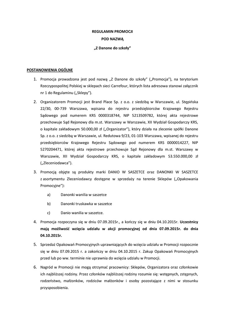 REGULAMIN PROMOCJI POD NAZWĄ „Z Danone do szkoły” POSTANOWIENIA OGÓLNE 1. Promocja prowadzona jest pod nazwą „Z Danone do szkoły” („Promocja”), na terytorium Rzeczypospolitej Polskiej w sklepach sieci Carrefour, których lista adresowa stanowi załącznik nr 1 do Regulaminu („Sklepy”). 2. Organizatorem Promocji jest Brand Place Sp. z o.o. z siedzibą w Warszawie, ul. Stępińska 22/30, 00-739 Warszawa, wpisana do rejestru przedsiębiorców Krajowego Rejestru Sądowego pod numerem KRS 0000318744, NIP 5213509782, której akta rejestrowe przechowuje Sąd Rejonowy dla m.st. Warszawy w Warszawie, XII Wydział Gospodarczy KRS, o kapitale zakładowym 50.000,00 zł („Organizator”), który działa na zlecenie spółki Danone Sp. z o.o. z siedzibą w Warszawie, ul. Redutowa 9/23, 01-103 Warszawa, wpisanej do rejestru przedsiębiorców Krajowego Rejestru Sądowego pod numerem KRS 0000014227, NIP 5270204471, której akta rejestrowe przechowuje Sąd Rejonowy dla m.st. Warszawy w Warszawie, XII Wydział Gospodarczy KRS, o kapitale zakładowym 53.550.000,00 zł („Zleceniodawca”). 3. Promocją objęte są produkty marki DANIO W SASZETCE oraz DANONKI W SASZETCE z asortymentu Zleceniodawcy dostępne w sprzedaży na terenie Sklepów („Opakowania Promocyjne”): a) Danonki wanilia w saszetce b) Danonki truskawka w saszetce c) Danio wanilia w saszetce. 4. Promocja rozpoczyna się w dniu 07.09.2015r., a kończy się w dniu 04.10.2015r. Uczestnicy mają możliwość wzięcia udziału w akcji promocyjnej od dnia 07.09.2015r. do dnia 04.10.2015r. 5. Sprzedaż Opakowań Promocyjnych uprawniających do wzięcia udziału w Promocji rozpocznie się w dniu 07.09.2015 r. a zakończy w dniu 04.10.2015 r. Zakup Opakowań Promocyjnych przed lub po ww. terminie nie uprawnia do wzięcia udziału w Promocji. 6. Nagród w Promocji nie mogą otrzymać pracownicy: Sklepów, Organizatora oraz członkowie ich najbliższej rodziny. Przez członków najbliższej rodziny rozumie się: wstępnych, zstępnych, rodzeństwo, małżonków, rodziców małżonków i osoby pozostające z nimi w stosunku przysposobienia. ZASADY PROWADZENIA PROMOCJI 7. W celu wzięcia udziału w Promocji Uczestnik powinien w okresie od dnia 07.09.2015 r. do dnia 04.10.2015 r. spełnić łącznie następujące warunki: a) w dowolnym Sklepie (z Załącznika nr 1) dokonać jednorazowego zakupu przynajmniej jednego Opakowania Promocyjnego, b) dokonać w Sklepie, w którym będzie dokonany zakup Opakowania Promocyjnego, zakupu 16–kartkowego zeszytu w kratkę z Małym Głodem oraz Dinusiem („Zeszyt”), płacąc za niego 1 grosz (0,01 zł). 8. Jednorazowy zakup przynajmniej jednego Opakowania Promocyjnego upoważnia do zakupu jednego Zeszytu za 1 grosz. Uczestnik może wziąć udział w Promocji dowolną ilość razy. Aby wziąć udział w Promocji kolejny raz, należy spełnić wymagania, o których mowa w pkt 7 a) oraz b) Regulaminu. W przypadku dokonania przez Uczestnika jednorazowego zakupu wielokrotności liczby jednego Opakowania Promocyjnego, Uczestnik ma prawo do zakupu odpowiedniej liczby Zeszytów, według zasady, że za każde zakupione Opakowanie Promocyjne Uczestnik może kupić jeden Zeszyt za 1 grosz. Przykładowo: Uczestnik, który dokonał jednorazowego zakupu 5 Opakowań Promocyjnych, ma prawo do zakupu 5 Zeszytów, płacąc 1 grosz za każdy z nich. NAGRODY W PROMOCJI 9. W niniejszej Promocji przewidziano: a) pulę 39 000 równorzędnych nagród, każda w postaci uprawnienia do zakupu Zeszytu o wartości 5,00 zł brutto, za cenę 1 grosza (0,01 zł) brutto („Nagroda”). 10. Pod warunkiem spełnienia wymagań określonych w pkt 7 a) oraz b), jeden Uczestnik może dokonać zakupu dowolnej liczby Zeszytów, płacąc 1 grosz za każdy z Zeszytów, do wyczerpania zapasów. Pula nagród jest ograniczona, na jeden sklep przypada 1000 zeszytów. 11. Uczestnikom Promocji nie przysługuje prawo do zastrzeżenia szczególnych właściwości Zeszytu, do otrzymania ekwiwalentu pieniężnego Nagrody, ani do przeniesienia prawa do Nagrody na osoby trzecie. 12. Uczestnik może dokonać zakupu Zeszytu wyłącznie w momencie dokonywania zakupu Opakowania/-ń Promocyjnego/-ych. WERYFIKACJA PRAWA DO NAGRODY 13. Warunkiem realizacji Nagrody jest dokonanie przez Uczestnika zakupu minimum jednego Opakowania Promocyjnego oraz zapłacenia 1 grosza przy odbiorze Zeszytu. 14. Niedopełnienie przez weryfikowaną osobę wymogów, o których mowa w pkt 13 Regulaminu, skutkuje utratą prawa do nabycia Zeszytu w cenie promocyjnej. 15. Zeszyty nierozdysponowane w powyższym trybie pozostają własnością Carrefour. WYDANIE NAGRÓD W PROMOCJI 16. Zeszyty nabywane w ramach Promocji będą sprzedawane w promocyjnej cenie najpóźniej do dnia 04.10.2015 r. 17. Nieodebranie Zeszytu w terminie zgodnie z postanowieniami Regulaminu jest równoznaczne z rezygnacją z Nagrody. W takim wypadku Carrefour nie jest zobowiązany do ponownej sprzedaży Zeszytu w promocyjnej cenie. 18. W przypadku utraty prawa do Nagrody przez Uczestnika, zgodnie z postanowieniami Regulaminu, Zeszyt pozostaje własnością Carrefour. PROCEDURA POSTĘPOWANIA REKLAMACYJNEGO 19. Każdy Uczestnik Promocji może zgłosić reklamację w związku z przeprowadzeniem i uczestnictwem w Promocji w formie pisemnej na adres Organizatora, Brand Place Sp. z o.o., ul. Stępińska 22/30, 00 -739 Warszawa. Reklamacje rozpatruje Organizator. 20. O sposobie rozpatrzenia reklamacji Uczestnik Promocji zostanie powiadomiony pisemnie w terminie 14 dni od dnia otrzymania reklamacji przez Organizatora. 21. Przy rozpatrywaniu reklamacji Organizator opiera się na treści niniejszego Regulaminu Promocji oraz powszechnie obowiązujących przepisach prawa polskiego. 22. Uczestnik może skorzystać z pozasądowego sposobu rozpatrywania reklamacji i dochodzenia roszczeń przed Stałym Polubownym Sądem Konsumenckim przy Wojewódzkim Inspektorze Inspekcji Handlowej w Warszawie. Informacje o sposobie dost