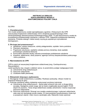 INSTRUKCJA OBSŁUGI SZKOLENIOWEGO MODELU ANATOMICZNEGO POŁOWY CIAŁA GLORIA 1. Charakterystyka Ten model anatomiczny został zaprojektowany zgodnie z Wytycznymi dla CPR (resuscytacji krążeniowo-oddechowej) i ECC (krążenia pozaustrojowego) AHA (Amerykańskiego Stowarzyszenia Kardiologicznego) 2005. To jest ekonomiczny model do prowadzenia podstawowego szkolenia z zakresu CPR. Zapewnia podstawowe elementy szkolenia. Prostota obsługi i niskie koszty czynią go popularnym symulatorem treningowym.. 2. Dla kogo jest przeznaczony? a. Akademie i szkoły medyczne, szkoły pielęgniarskie, szpitale i temu podobne b. Placówki oświatowe c. Pogotowie ratunkowe, szpitalne odziały pomocy doraźnej, duże szpitale prowadzące szkolenia kliniczne d. Komunalne placówki służby zdrowia prowadzące podstawowe szkolenia e. Kopalnie, elektrownie, straż pożarna, agencje ochrony bezpieczeństwa publicznego i temu podobne. 3. Wprowadzenie do CPR CPR to skrót od resuscytacji krążeniowo-oddechowej (ang. Cardiopulmonary Resuscitation). Jeżeli spotkamy się u kogoś z atakiem serca, to powinniśmy podjąć następujące kroki: a) Udrożnienie dróg oddechowych b) Sztuczne oddychanie c) Uciskanie klatki piersiowej 4. Wskazówki dotyczące użytkowania a. Wyciągnąć model anatomiczny z pudełka. Rozłożyć poduszkę. Ułożyć model na poduszce twarzą do góry. b. Podczas szkolenia należy dokładnie wykonywać poniższe instrukcje: a) Udrożnienie dróg oddechowych.: Jedną rękę uchwycić tyłu szyi, a drugą dolną szczękę. Następnie unieść szyję, tak by twarz znajdowała się pod kątem 70-90 stopni do poziomu. Teraz drogi oddechowe zostały udrożnione i można rozpocząć sztuczne oddychanie. b) Sztuczne oddychanie: Ścisnąć nos modelu anatomicznego i wykonać oddychanie usta-usta lub wentylację worek-maska. W rzeczywistości poszkodowany może być w poważnym stanie i mieć mocno zaciśnięte usta. Ratownik może wykonać wentylację usta-nos. Gdy uczniowie ćwiczą wdmuchiwanie usta powinny zostać zamknięte hermetycznie. Objętość wdychanego powietrza winna być w zakresie 500 do 600 mm. Należy unikać zbyt dużych lub zbyt silnych oddechów. Takie oddechy nie są potrzebne i mogą wywołać wzdęcia i związane z tym komplikacje. Wielkość oddechu można oceniać na podstawie podnoszenia się i opadania klatki piersiowej. c) Uciskanie klatki piersiowej: Znajdź prawidłowe miejsce ucisku. Jest to środkowy punkt między brodawkami sutkowymi. Ułóż dłonie jedna na drugiej, użyj nasady dłoni do uciskania; gdy wciśniesz klatkę piersiową 4 – 5 cm usłyszysz dźwięk wydawany przez uciskany mostek. c. Wybór trybu treningowego. Jest to trening mający podstawowe znaczenie przy CPR. Najpierw przygotuj się do ćwiczeń., następnie udrożnij drogi oddechowe, wykonaj ucisk klatki piersiowej, a na końcu sztuczne oddychanie usta-usta. d. Uwagi a) Podczas ćwiczenia oddychania usta-usta proszę używać jednorazowej maski CPR na twarz, po jednej dla każdego ucznia, celem zapobiegania szerzeniu się infekcji. b) Uczniowie winni wymyć ręce przed ćwiczeniami. Jeżeli ćwiczą kobiety, to winny usunąć szminkę, aby nie zabrudzić skóry modelu. 5. Przechowywanie i konserwacja a. Po użyciu proszę wyczyścić i wysterylizować powierzchnię modelu środkiem czyszczącym, włączając w to twarz, usta, nos, klatkę piersiową i rurkę wentylacyjną. Następnie zanurzyć w środku dezynfekującym zawierającym 75% alkoholu. b. Stosowanie części zapasowych (a) Jeżeli twarz ulegnie uszkodzeniu, należy ją wymienić na nową. Najpierw odśrubować obie strony umocowane śrubami na głowie i ściągnąć. Następnie założyć nową i przykręcić śrubami. (b) Jeżeli uległ uszkodzeniu worek płucny, to należy go wymienić na nowy. Otworzyć klatkę piersiową, odśrubować łącznik i wyciągnąć uszkodzony worek płucny. Następnie umieścić łącznik w wężu falistym nowego worka płucnego i mocno przyśrubować. (c) Jeżeli model nie będzie przez dłuższy czas używany, to proszę go najpierw wyczyścić, a następnie umieścić w chłodnym i suchym miejscu, unikając bezpośredniego działania promieni słonecznych. Producent: Ningbo Junwei Industrial & Trading Co.,Ltd. No. 12 Xiangzhou xiao zhu, Ningbo National Hi-tech Zone, Ningbo, Chiny