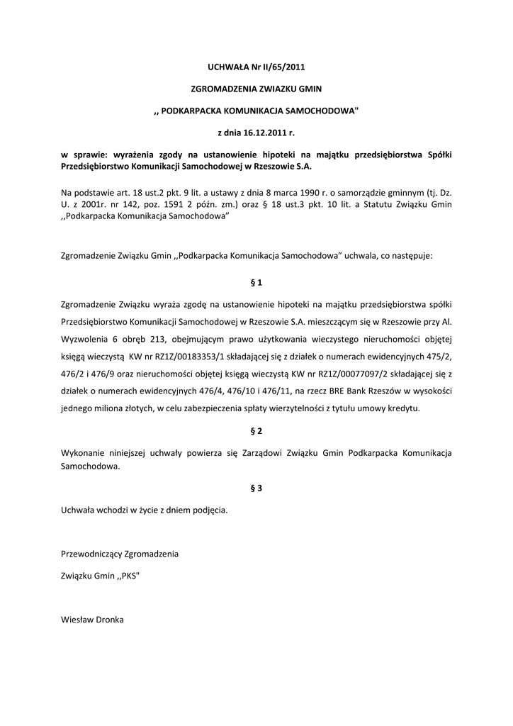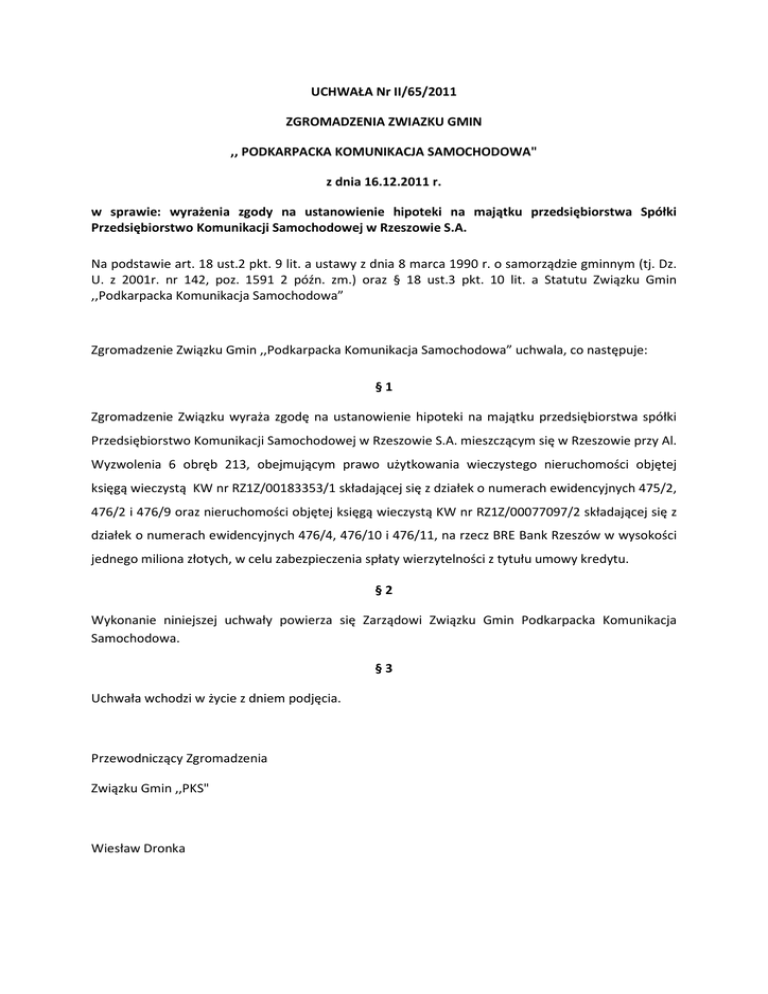 UCHWAŁA Nr II/65/2011 ZGROMADZENIA ZWIAZKU GMIN ,, PODKARPACKA KOMUNIKACJA SAMOCHODOWA" z dnia 16.12.2011 r. w sprawie: wyrażenia zgody na ustanowienie hipoteki na majątku przedsiębiorstwa Spółki Przedsiębiorstwo Komunikacji Samochodowej w Rzeszowie S.A. Na podstawie art. 18 ust.2 pkt. 9 lit. a ustawy z dnia 8 marca 1990 r. o samorządzie gminnym (tj. Dz. U. z 2001r. nr 142, poz. 1591 2 późn. zm.) oraz § 18 ust.3 pkt. 10 lit. a Statutu Związku Gmin ,,Podkarpacka Komunikacja Samochodowa” Zgromadzenie Związku Gmin ,,Podkarpacka Komunikacja Samochodowa” uchwala, co następuje: §1 Zgromadzenie Związku wyraża zgodę na ustanowienie hipoteki na majątku przedsiębiorstwa spółki Przedsiębiorstwo Komunikacji Samochodowej w Rzeszowie S.A. mieszczącym się w Rzeszowie przy Al. Wyzwolenia 6 obręb 213, obejmującym prawo użytkowania wieczystego nieruchomości objętej księgą wieczystą KW nr RZ1Z/00183353/1 składającej się z działek o numerach ewidencyjnych 475/2, 476/2 i 476/9 oraz nieruchomości objętej księgą wieczystą KW nr RZ1Z/00077097/2 składającej się z działek o numerach ewidencyjnych 476/4, 476/10 i 476/11, na rzecz BRE Bank Rzeszów w wysokości jednego miliona złotych, w celu zabezpieczenia spłaty wierzytelności z tytułu umowy kredytu. §2 Wykonanie niniejszej uchwały powierza się Zarządowi Związku Gmin Podkarpacka Komunikacja Samochodowa. §3 Uchwała wchodzi w życie z dniem podjęcia. Przewodniczący Zgromadzenia Związku Gmin ,,PKS" Wiesław Dronka