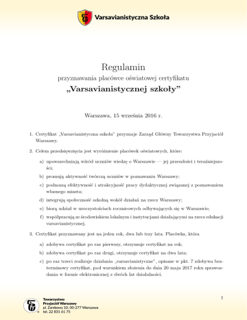 Regulamin przyznawania placówce oświatowej certyfikatu „Varsavianistycznej szkoły” Warszawa, 15 września 2016 r. 1. Certyfikat „Varsavianistyczna szkoła” przyznaje Zarząd Główny Towarzystwa Przyjaciół Warszawy. 2. Celem przedsięwzięcia jest wyróżnienie placówek oświatowych, które: a) upowszechniają wśród uczniów wiedzę o Warszawie — jej przeszłości i teraźniejszości; b) promują aktywność twórczą uczniów w poznawaniu Warszawy; c) podnoszą efektywność i atrakcyjność pracy dydaktycznej związanej z poznawaniem własnego miasta; d) integrują społeczność szkolną wokół działań na rzecz Warszawy; e) biorą udział w uroczystościach rocznicowych odbywających się w Warszawie; f) współpracują ze środowiskiem lokalnym i instytucjami działającymi na rzecz edukacji varsavianistycznej. 3. Certyfikat przyznawany jest na jeden rok, dwa lub trzy lata. Placówka, która a) zdobywa certyfikat po raz pierwszy, otrzymuje certyfikat na rok; b) zdobywa certyfikat po raz drugi, otrzymuje certyfikat na dwa lata; c) po raz trzeci realizuje działania „varsavianistyczne”, opisane w pkt. 7 zdobywa bezterminowy certyfikat, pod warunkiem złożenia do dnia 20 maja 2017 roku sprawozdania w formie elektronicznej z dwóch lat działalności. 1 4. O certyfikat mogą się ubiegać placówki oświatowe z terenu Warszawy. 5. Oceny placówek oświatowych dokonuje Kapituła Konkursu złożona z: — Prezesa Zarządu Głównego Towarzystwa Przyjaciół Warszawy; — Przewodniczącego Komisji Młodzieżowej ZG TPW; — pięciu niezależnych ekspertów powołanych przez Zarząd Główny TPW. 6. W celu otrzymania certyfikatu placówki oświatowe są zobowiązane do realizacji następujących działań: a) przeprowadzenie w swojej placówce cyklu co najmniej 10 zajęć (w ramach lekcji lub zajęć pozalekcyjnych) na temat Warszawy — jej przeszłości i teraźniejszości, przybliżających uczniom jej historię, obiekty zabytkowe, parki i rezerwaty przyrody, powojenną odbudowę i rozbudowę miasta oraz czasy współczesne, realizowanych przez różnych nauczycieli; b) przygotowanie przez uczniów „gazetki” o tematyce warszawskiej i umieszczenie jej na tablicy szkolnej lub na stronie internetowej placówki oświatowej. Placówki, które wydają gazetkę szkolną mogą publikować w niej artykuły o tematyce varsavianistycznej. Spełnieniem tego warunku jest także inna publikacja o tematyce varsavianistycznej, dokumentująca pracę uczniów i nauczycieli; c) przeprowadzenie minimum pięciu wycieczek po Warszawie (mogą to być np. klasyczne wycieczki szkolne, ale także rajdy, gry terenowe, spacery z przewodnikami, wyjścia do muzeów itd. Wycieczki mogą być zorganizowane przez placówkę uczestniczącą w zdobywaniu certyfikatu lub inną placówkę, organizację lub stowarzyszenie. Przy ocenianiu placówek szkolnych mile widziane są wycieczki organizowane w czasie wolnym od nauki; d) uczestnictwo uczniów w co najmniej dwóch uroczystościach rocznicowych odbywających się w Warszawie (nie dotyczy przedszkoli); e) zorganizowanie i przeprowadzenie co najmniej jednego konkursu o tematyce warszawskiej, np. plastycznego, fotograficznego, konkursu wiedzy itd. lub udział w konkursie „warszawskim” przygotowanym przez inną placówkę; f) zorganizowanie w swojej placówce co najmniej dwóch spotkań z ciekawymi postaciami związanymi z Warszawą. Mogą być to np. spotkania z kombatantami, przedstawicielami samorządu lokalnego, autorem książki o tematyce warszawskiej, znanym 2 varsavianistą, np. członkiem Towarzystwa Przyjaciół Warszawy itd. Nie zalicza się tu spotkań nie związanych tematycznie z Warszawą, np. z policją czy strażą miejską na temat bezpieczeństwa, rodzicami o ich pracy itd.; g) zdobycie na terenie Warszawy przez co najmniej 15 uczniów odznak (w dowolnym stopniu), np. nadawanej przez Towarzystwo Przyjaciół Warszawy odznaki Młody Przyjaciel Warszawy lub Mały Przyjaciel Warszawy. Regulaminy zdobywania odznak znajdują się na stronie www.tpw.org.pl (nie dotyczy przedszkoli); h) zorganizowanie i zrealizowanie akcji „Pracuję na rzecz środowiska lokalnego”; i) udział przedstawicieli społeczności szkolnej (nauczycieli, rodziców, uczniów) co najmniej 5 działaniach organizowanych przez TPW, np. spacerach z przewodnikami, spotkaniach historycznych, szkoleniach, salonach przewodnickich, grach miejskich itd. Bieżące informacje o nich ukazują się systematycznie na stronie Towarzystwa Przyjaciół Warszawy — www.tpw.org.pl; udział ten jest dokumentowany. 7. Wyżej wymienione działania mogą być łączone w większe projekty i uzupełniane o własne pomysły. 8. Placówki zdobywające certyfikat zobowiązane są przekazać do dnia 20 maja drogą elektroniczną poprzez stronę internetową www.tpw.org.pl; sprawozdania z realizacji projektu. Po 20 maja system będzie zamknięty i nie będzie możliwości późniejszego składania sprawozdania. Po przesłaniu sprawozdania nie będzie możliwości dokonywania w nim zmian. 9. Placówka zaangażowana w zdobywanie certyfikatu, która samodzielnie nie organizowała wycieczek i konkursów lecz brała udział w działaniach organizowanych przez inne placówki, organizacje lub stowarzyszenia zobowiązana jest do podania w sprawozdaniu nazwy organizatora. 10. W czasie oceniania kolejnych działań premiowane są te, które zostały zorganizowane przez placówkę zdobywającą certyfikat we współudziale z innymi placówkami i/lub instytucjami. 11. Przesłanie sprawozdań ze zdjęciami uczniów i/lub ich nazwiskami oraz prac plastycznych uczniów oznacza wyrażenie zgody przez rodziców na udostępnienie zdjęć dzieci dla potrzeb zdobywania certyfikatu i publikację sprawozdań ze zdjęciami i nazwiskami uczniów na stronie Towarzystwa Przyjaciół Warszawy. Zgody na publikację wizerunków/nazwisk dzieci przechowują szkoły i udostępniają je TPW na żądanie. Uczniowie d