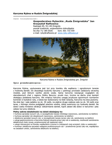 Karczma Rybna w Rudzie Żmigrodzkiej Dane teleadresowe: Gospodarstwo Rybackie „Ruda Żmigrodzka” Jan Krzysztof Raftowicz Radziądz 85, 55-140 Żmigród, powiat trzebnicki, województwo dolnośląskie tel./fax 71/ 385 6026 kom. 601 733 559 e-mail: [email protected] www.ryby.raftowicz.pl Karczma Rybna w Rudzie Żmigrodzkiej gm. Żmigród Opis przedsięwzięcia: Karczma Rybna, usytuowana jest tuż przy łowisku dla wędkarzy i ogrodzonym terenie z hodowlą danieli. Do okazałego budynku karczmy z parkingu prowadzi zadaszony strzechą mostek, pod którym wartko płynie woda. Sama karczma nawiązuje wyglądem do starodawnych chat z regionu Doliny Baryczy: pruski mur, trzcina na dachu oraz kamień okalający podstawę karczmy. We wnętrzu karczmy uwagę przykuwa ogromnych rozmiarów kominek w kształcie ryby, a także bar stylizowany na łódź rybacką. Karczma ma dwa poziomy. Na dole bar i sala jadalna na ok. 30 osób, na piętrze druga większa sala na ok. 50 osób oraz taras, z którego można podglądać ptactwo wodne, dziką zwierzynę czy hodowlę danieli. Na dzieci czeka mnóstwo atrakcji: dokarmianie danieli, kącik zabaw dla dzieci w karczmie i plac zabaw tuż przy obiekcie. Pełny zakres działalności na dzień dzisiejszy to: • hurtowa sprzedaż żywych ryb, w szczególności karpia milickiego (sezonowo, zamówienia na telefon) • hurtowa sprzedaż ryb obsadowych (sezonowo, zamówienia na telefon) • detaliczna sprzedaż żywych ryb, w szczególności karpia (przez cały rok, zamówienia na telefon) • usługi gastronomiczne w Karczmie Rybnej (otwarta przez cały rok w weekendy, możliwość zamówienia detalicznych ilości żywej, przetworzonej lub wędzonej ryby) • usługi rekreacyjne na łowisku wędkarskim (czynne w miesiącach maj-wrzesień, tylko w weekendy) • hurtowa i detaliczna sprzedaż wstępnie przetworzonych ryb – przetwórnia (przez cały rok, współpraca na zasadach umów, zamówienia detaliczne na telefon). Poza stawami na terenie Gospodarstwa Rybackiego „Ruda Żmigrodzka” znajdują się: • Karczma Rybna z wędzarnią (otwarta w weekendy), • łowisko dla wędkarzy (czynne w weekendy), • przetwórnia rybna oferująca wstępnie przetworzone ryby (dzwonka, płaty, filety), • tarliska (miejsca rozrodu i wylęgu ryb), • magazyny z wodą przepływową do przechowywania żywej ryby, • magazyn na zboże, • odłówka (płuczka) ułatwiająca odłów ryb przeznaczonych do sprzedaży, • budynek rybakówki (docelowo ma stanowić bazę noclegową), • ogrodzony teren, na którym prowadzona jest hodowla danieli. Rolnik korzystał z dotacji jakie oferuje Unia Europejska w ramach Programu Operacyjnego „Zrównoważony rozwój sektora rybołówstwa i nadbrzeżnych obszarów rybackich 2007-2013”. Operacje jakie zostały wdrożone w gospodarstwie, współfinansowane przez Unię Europejską ze środków finansowych Europejskiego Funduszu Rybackiego, zapewniające zrównoważony rozwój gospodarczy to: 1. Mini-przetwórnia ryb Projekt: „Rozwój sprzedaży bezpośredniej gospodarstwa Ruda Żmigrodzka poprzez budowę i wyposażenie patroszarni ryb” 2. Hodowla danieli Projekt: „Dywersyfikacja działalności gospodarstwa dla uzyskania zintegrowanej produkcji karpia milickiego” 3. Zabezpieczenia przed bobrami Projekt: „Zabezpieczenie grobli stawowych przed bobrami na terenie Gospodarstwa Rybackiego – Ruda Żmigrodzka, obszarem objętym Natura 2000” 4. Społeczna Straż Rybacka Projekt: „Zakup sprzętu i wyposażenia dla Społecznej Straży Rybackiej przy gospodarstwie rybackim Ruda Żmigrodzka Jan Krzysztof Raftowicz” 5. Budowa Karczmy Rybnej Projekt: „Utworzenie gastronomiczno-noclegowej bazy turystycznej w celu reorientacji działalności gospodarczej oraz dywersyfikacji zatrudnienia osób mających pracę związaną z sektorem rybactwa 6. Modernizacja łowiska Projekt: „Przebudowa stawu na potrzeby łowiska dla wędkarzy, budynku płuczki oraz zagospodarowanie działki w celu stworzenia oferty turystycznej bazującej na tradycjach rybackich regionu” 7. Budowa suszarni do zboża 8. Budowa płuczki z odłówką 9. Budowa stawu „Renia” 10. Zakup sprzętu do prowadzenia gospodarski rybackiej (używana koparka i spychacz Catepilar, ciągnik John Deere, przyczepy, samochód z basenem do przewozu ryb, 3 łodzie paszowe, silnik zaburtowe) 11. Remont stawu „Krzysztof Górny” (odmulenie, usypanie wyspy) Galeria zdjęć: