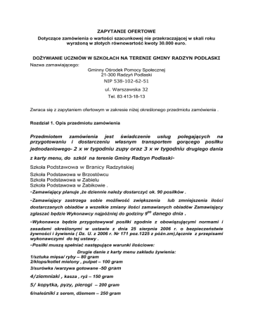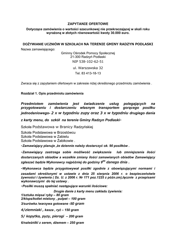 ZAPYTANIE OFERTOWE Dotyczące zamówienia o wartości szacunkowej nie przekraczającej w skali roku wyrażoną w złotych równowartość kwoty 30.000 euro. DOŻYWIANIE UCZNIÓW W SZKOŁACH NA TERENIE GMINY RADZYN PODLASKI Nazwa zamawiającego: Gminny Ośrodek Pomocy Społecznej 21-300 Radzyń Podlaski NIP 538-102-62-51 ul. Warszawska 32 Tel. 83 413-18-13 Zwraca się z zapytaniem ofertowym w zakresie niżej określonego przedmiotu zamówienia . Rozdział 1. Opis przedmiotu zamówienia Przedmiotem zamówienia jest świadczenie usług przygotowaniu i dostarczeniu własnym transportem polegających na gorącego posiłku jednodaniowego- 2 x w tygodniu zupy oraz 3 x w tygodniu drugiego dania z karty menu, do szkół na terenie Gminy Radzyn PodlaskiSzkoła Podstawowa w Branicy Radzyńskiej Szkoła Podstawowa w Brzostówcu Szkoła Podstawowa w Zabielu Szkoła Podstawowa w Żabikowie . -Zamawiający planuje ,że dziennie należy dostarczyć ok. 90 posiłków . -Zamawiający zastrzega sobie możliwość zwiększenia lub zmniejszenia ilości dostarczanych obiadów a wszelkie zmiany ilości zamawianych obiadów Zamawiający zgłaszać będzie Wykonawcy najpóźniej do godziny 900 danego dnia . -Wykonawca będzie przygotowywał posiłki zgodnie z obowiązującymi normami i zasadami określonymi w ustawie z dnia 25 sierpnia 2006 r. o bezpieczeństwie żywności i żywienia ( Dz. U. z 2006 r. Nr 171 poz.1225 z późn.zm),łącznie z przepisami wykonawczymi do tej ustawy . -Posiłki muszą spełniać następujące warunki ilościowe: Drugie danie z karty menu zakładu żywienia: 1/sztuka mięsa/ ryby – 80 gram 2/klops/kotlet mielony , pulpet – 100 gram 3/surówka /warzywa gotowane -50 gram 4/ziemniaki , kasza , ryż – 150 gram 5/ kopytka, pyzy, pierogi – 200 gram 6/naleśniki z serem, dżemem – 250 gram 7/ makaron z owocami , serem- 250 gram Zupy z karty menu zakładu żywienia: 1/ zupa/ z makaronem, ryżem lub ziemniakami – 0,5 l Posiłki muszą spełniać następujące warunki jakościowe: 1/jadłospis powinien być urozmaicony ; rodzaj potraw nie może się powtarzać w tym samym tygodniu 2/potrawy powinny być lekkostrawne, przygotowane z surowców wysokiej jakości ,świeżych, naturalnych, z ograniczoną ilością substancji dodatkowych - konserwujących, zagęszczających, barwiących lub sztucznie aromatyzowanych 3/w jadłospisie powinny przeważać potrawy gotowane , pieczone i duszone 4/ ważna jest estetyka potraw Wykonawca będzie przygotowywał i dostarczał posiłki zachowując wymogi sanitarnoepidemiologiczne w zakresie personelu i warunków produkcji oraz weźmie odpowiedzialność za ich przestrzeganie . Transport posiłków powinien odbywać się w termosach zapewniających właściwą ochronę i temperaturę oraz jakość przewożonych potraw środkami transportu przystosowanymi do przewozu żywności. Dostarczanie posiłków z miejsca produkcji do pomieszczeń dystrybucji w szkole realizowane będzie przez Wykonawcę na jego koszt . Zamawiający posiada własne naczynia – talerze , sztućce Zamawiający przyjmuje na siebie wszelkie sprawy organizacyjne związane z bezpośrednim wydawaniem posiłków dzieciom. Koszt związany z wydawaniem posiłków, myciem naczyń i sprzątaniem stołówki ponosić będzie zamawiający. WARUNEK Stworzyć możliwość odpłatnego zakupu obiadów dla pozostałych uczniów w danej szkole . Rozdział 2 . Termin realizacji zamówienia Dożywianie uczniów odbywać się będzie od poniedziałku do piątku w dni nauki szkolnej w okresie od 14 września 2015 r. do 20 czerwca 2016 r. tj. w roku szkolnym 2015/2016 z uwzględnieniem przerw w nauce zgodnie z Rozporządzeniem Ministra Edukacji Narodowej w sprawach organizacji roku szkolnego . Rozdział 3. Opis sposobu przygotowania oferty. 1. Wykonawca może złożyć tylko jedna ofertę 2. Zamawiający nie dopuszcza składania ofert częściowych 3. Ofertę stanowi wypełniony formularz będący załącznikiem do zapytania ofertowego. 4. Wykonawca złoży referencje co najmniej z 2 szkół /placówek , w których dostarczał posiłki dla dzieci/uczniów z okresu 2 lat poprzedzających złożoną ofertę . 5. Ofertę należy składać w kopertach , koperta zewnętrzna winna być zaadresowana i opisana w następujący sposób: Gminny Ośrodek Pomocy Społecznej w Radzyniu Podlaskim Zapytanie ofertowe na ,,Dożywianie dzieci w szkołach z terenu Gminy Radzyń Podlaski’’ Rozdział 4. Miejsce oraz termin składania oferty 1. Ofertę należy składać na adres Gminny Ośrodek Pomocy Społecznej w Radzyniu Podlaskim ul. Warszawska 32 pok. Nr 208 nie później niż do dnia 24 sierpnia 2015 r. godz. 1400. 2. Otwarcie złożonych ofert nastąpi w dniu 24 sierpnia 2014 r. o godz. 14 30. Rozdział 5. Opis kryteriów, którymi zamawiający będzie się kierował przy wyborze oferty. Przy wyborze najkorzystniejszej oferty, Zamawiający stosować będzie kryterium ceny oraz złożone referencje. Jeżeli nie będzie można dokonać wyboru oferty najkorzystniejszej ze względu na to, że zostały złożone oferty o takiej samej cenie i podobnych referencji Zamawiający wezwie Wykonawców, którzy złożyli oferty, do złożenia w wyznaczonym terminie ofert dodatkowych. Wykonawcy w ofertach dodatkowych nie mogą zaoferować cen wyższych niż zaoferowane w złożonych ofertach . Zamawiający udzieli zamówienia Wykonawcy, który spełni wszelkie warunki postawione w niniejszym zapytaniu o cenę . Niezwłocznie po wyborze najkorzystniejszej oferty Zamawiający zawiadomi wyłonionego Wykonawcę , z którym zawarta zostanie umowa Maria Tarnowska-Kierownik GOPS w Radzyniu Podlaskim Załącznik 1 OFERTA Pieczęć wykonawcy ……………………………….. Gminny Ośrodek Pomocy Społecznej 21-300 Radzyń Podlaski Ul. Warszawska 32 Zawiązując do zapytania ofertowego ,, Dożywianie dzieci w szkołach na terenie Gminy Radzyń Podlaski’’ ……………………………. Nazwa wykonawcy i adres Osoba wyznac