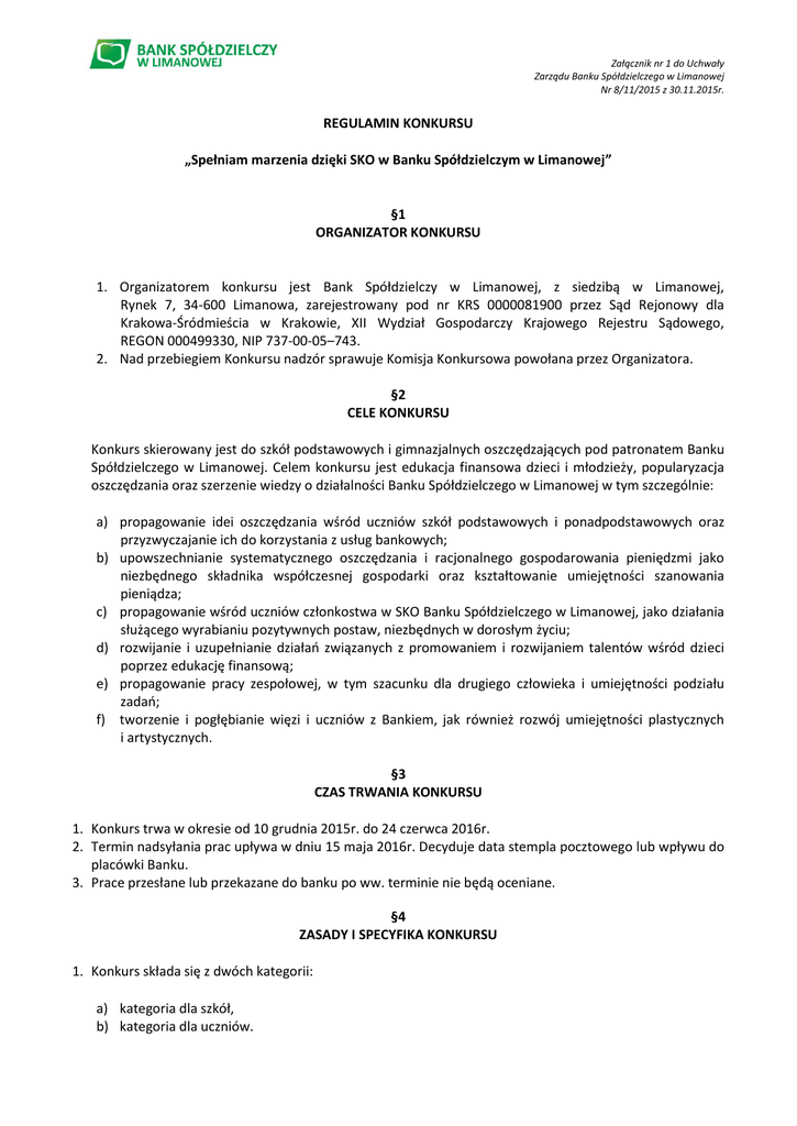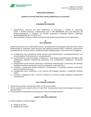 Załącznik nr 1 do Uchwały Zarządu Banku Spółdzielczego w Limanowej Nr 8/11/2015 z 30.11.2015r. REGULAMIN KONKURSU „Spełniam marzenia dzięki SKO w Banku Spółdzielczym w Limanowej” §1 ORGANIZATOR KONKURSU 1. Organizatorem konkursu jest Bank Spółdzielczy w Limanowej, z siedzibą w Limanowej, Rynek 7, 34-600 Limanowa, zarejestrowany pod nr KRS 0000081900 przez Sąd Rejonowy dla Krakowa-Śródmieścia w Krakowie, XII Wydział Gospodarczy Krajowego Rejestru Sądowego, REGON 000499330, NIP 737-00-05–743. 2. Nad przebiegiem Konkursu nadzór sprawuje Komisja Konkursowa powołana przez Organizatora. §2 CELE KONKURSU Konkurs skierowany jest do szkół podstawowych i gimnazjalnych oszczędzających pod patronatem Banku Spółdzielczego w Limanowej. Celem konkursu jest edukacja finansowa dzieci i młodzieży, popularyzacja oszczędzania oraz szerzenie wiedzy o działalności Banku Spółdzielczego w Limanowej w tym szczególnie: a) propagowanie idei oszczędzania wśród uczniów szkół podstawowych i ponadpodstawowych oraz przyzwyczajanie ich do korzystania z usług bankowych; b) upowszechnianie systematycznego oszczędzania i racjonalnego gospodarowania pieniędzmi jako niezbędnego składnika współczesnej gospodarki oraz kształtowanie umiejętności szanowania pieniądza; c) propagowanie wśród uczniów członkostwa w SKO Banku Spółdzielczego w Limanowej, jako działania służącego wyrabianiu pozytywnych postaw, niezbędnych w dorosłym życiu; d) rozwijanie i uzupełnianie działań związanych z promowaniem i rozwijaniem talentów wśród dzieci poprzez edukację finansową; e) propagowanie pracy zespołowej, w tym szacunku dla drugiego człowieka i umiejętności podziału zadań; f) tworzenie i pogłębianie więzi i uczniów z Bankiem, jak również rozwój umiejętności plastycznych i artystycznych. §3 CZAS TRWANIA KONKURSU 1. Konkurs trwa w okresie od 10 grudnia 2015r. do 24 czerwca 2016r. 2. Termin nadsyłania prac upływa w dniu 15 maja 2016r. Decyduje data stempla pocztowego lub wpływu do placówki Banku. 3. Prace przesłane lub przekazane do banku po ww. terminie nie będą oceniane. §4 ZASADY I SPECYFIKA KONKURSU 1. Konkurs składa się z dwóch kategorii: a) kategoria dla szkół, b) kategoria dla uczniów. 2. Przedmiotem konkursu w kategorii dla szkół są: a) wyniki działalności SKO, b) udział członków SKO w popularyzacji oszczędzania. 3. Przedmiotem konkursu w kategorii dla uczniów jest wykonanie przez ucznia pracy plastycznej przedstawiającej sposób realizacji marzeń dzięki SKO, które wyznacza hasło Konkursu: „Spełniam marzenia dzięki SKO w Banku Spółdzielczym w Limanowej”. Prace konkursowe muszą uwzględniać następujące kryteria: a) b) c) d) sposób przygotowania: praca musi być wykonana odręcznie i być wynikiem osobistej twórczości ucznia; technika pracy: dowolna technika plastyczna; materiały: dowolne np. ołówek, farby, kredki itp.; format pracy: od A4 do A3. 4. Zasady przygotowania i oznakowania prac uczniów: każdy uczeń może przygotować jedną, własnoręcznie przygotowaną pracę; dozwolone są wyłącznie prace indywidualne; nie przyjmujemy prac przestrzennych; przyjmujemy prace bez oprawy; prosimy o odpowiednie zabezpieczenia prac rysunkowych; prace zrolowane nie będą klasyfikowane; na odwrocie każdej pracy należy przykleić czytelnie wypełnione oświadczenie stanowiące załącznik nr 1 do niniejszego regulaminu; prace w placówce Banku składa Opiekun SKO w zwartym opakowaniu zbiorczym; opakowanie zbiorcze powinno zawierać dodatkowo listę z nazwiskami i liczbą złożonych prac. §5. ZASADY OCENY KONKURSU 1. Ocenie Komisji konkursowej w kategorii dla szkół podlegają następujące obszary: a) Wyniki działalności SKO: liczba uczniów−członków SKO w dniu zakończenia Konkursu, tj. w dniu 15 maja − za każdy 1% uczniów należących do SKO, w stosunku do ogólnej liczby uczniów: 0,1 pkt. Łącznie za tę kategorię można uzyskać od 0 do 10 pkt; liczba uczniów−członków SKO, systematycznie oszczędzających (wnoszących wpłaty na książeczki SKO, co najmniej raz w miesiącu w czasie trwania Konkursu), w stosunku do ogólnej liczby członków SKO: za każdy 1 % − 0,1 pkt. Łącznie za tę kategorię można uzyskać do 0 do 10 pkt; wzrost wartości środków zgromadzonych przez SKO (od 1 września 2015r. do 15 maja 2016r.). Łącznie za tę kategorię można uzyskać od 0 do 10 pkt; wyniki współzawodnictwa między klasami. Łącznie za tę kategorię można uzyskać od 0 do 10 pkt. b) Udział członków SKO w popularyzacji oszczędzania: za zorganizowanie i podsumowanie udokumentowanego, międzyklasowego współzawodnictwa – konkursu o oszczędzaniu o zasięgu ogólnoszkolnym w zakresie działalności SKO - 30 pkt.; za zorganizowanie udokumentowanej imprezy o zasięgu ogólnoszkolnym na temat oszczędzania w SKO lub w Banku Spółdzielczym w Limanowej – 5 pkt. za każdą formę imprezy - max. 25 pkt.; za zorganizowanie przedstawienia przez uczniów o tematyce oszczędzania – 10 pkt. za każde przedstawienie - max. 30 pkt.; za zorganizowanie udokumentowanej zbiórki pieniędzy o zasięgu ogólnoszkolnym na określony cel – 5 pkt. za każdą zbiórkę - max. 15 pkt.; 2 za zorganizowanie wystawy na temat oszczędzania w SKO – 5 pkt. za każdy rodzaj wystawy max. 20 pkt.; za prowadzenie promocji działalności SKO na stronie Banku Spółdzielczego w Limanowej – artykuły publikowane pod adresem www.bs.limanowa.pl/sko - do 10 pkt. Punkty przyznaje Komisja konkursowa, w przypadku braku artykułów Komisja konkursowa nie przyznaje punków za to zadanie; za udokumentowaną organizację konkursów na temat oszczędzania w SKO i w Banku Spółdzielczym w Limanowej - 5 pkt. za każdą formę – max. 25 pkt.; za zorganizowanie quizu o charakterze ogólnoszkolnym w tematach: form oszczędzania, wiedzy o spółdzielczości bankowej, o Banku Spółdzielczym w Limanowej - 5 pkt. 