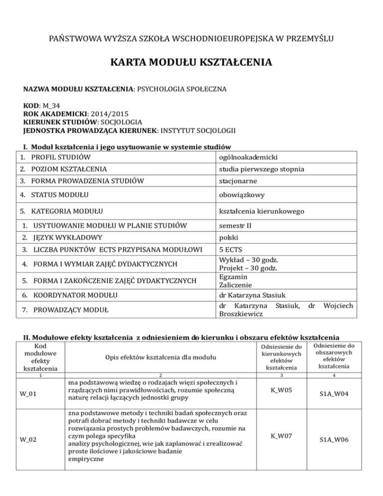 PAŃSTWOWA WYŻSZA SZKOŁA WSCHODNIOEUROPEJSKA W PRZEMYŚLU KARTA MODUŁU KSZTAŁCENIA NAZWA MODUŁU KSZTAŁCENIA: PSYCHOLOGIA SPOŁECZNA KOD: M_34 ROK AKADEMICKI: 2014/2015 KIERUNEK STUDIÓW: SOCJOLOGIA JEDNOSTKA PROWADZĄCA KIERUNEK: INSTYTUT SOCJOLOGII I. Moduł kształcenia i jego usytuowanie w systemie studiów 1. PROFIL STUDIÓW ogólnoakademicki 2. POZIOM KSZTAŁCENIA studia pierwszego stopnia 3. FORMA PROWADZENIA STUDIÓW stacjonarne 4. STATUS MODUŁU obowiązkowy 5. KATEGORIA MODUŁU kształcenia kierunkowego 1. USYTUOWANIE MODUŁU W PLANIE STUDIÓW semestr II 2. JĘZYK WYKŁADOWY polski 3. LICZBA PUNKTÓW ECTS PRZYPISANA MODUŁOWI 5 ECTS Wykład – 30 godz. Projekt – 30 godz. Egzamin Zaliczenie dr Katarzyna Stasiuk dr Katarzyna Stasiuk, Broszkiewicz 4. FORMA I WYMIAR ZAJĘĆ DYDAKTYCZNYCH 5. FORMA I ZAKOŃCZENIE ZAJĘĆ DYDAKTYCZNYCH 6. KOORDYNATOR MODUŁU 7. PROWADZĄCY MODUŁ dr Wojciech II. Modułowe efekty kształcenia z odniesieniem do kierunku i obszaru efektów kształcenia Kod modułowe efekty kształcenia 1 W_01 W_02 Opis efektów kształcenia dla modułu Odniesienie do kierunkowych efektów kształcenia Odniesienie do obszarowych efektów kształcenia 2 3 4 ma podstawową wiedzę o rodzajach więzi społecznych i rządzących nimi prawidłowościach, rozumie społeczną naturę relacji łączących jednostki grupy K_W05 zna podstawowe metody i techniki badań społecznych oraz potrafi dobrać metody i techniki badawcze w celu rozwiązania prostych problemów badawczych, rozumie na czym polega specyfika analizy psychologicznej, wie jak zaplanować i zrealizować proste ilościowe i jakościowe badanie empiryczne K_W07 S1A_W04 S1A_W06 potrafi prawidłowo rejestrować i interpretować zjawiska społeczne przy pomocy pojęć i teorii psychologicznych w oparciu o zasady metodologii U_01 posiada podstawową psychologiczną umiejętność rozumienia i analizowania zjawisk społecznych U_02 potrafi skutecznie komunikować się z otoczeniem społecznym, wspołdziałać w grupie, pracować w zespole zadaniowym przyjmując w nich różne role, K_01 K_U01 S1A_U01 K_U08 S1A_U08 K_K02 S1A_K02 III. Treści kształcenia – oddzielnie dla każdej formy zajęć dydaktycznych (W – wykład; C - ćwiczenia; K – konwersatorium; L - laboratorium; PR – projekt, PKZ - praktyka zawodowa) Kod form zajęć dydaktyczny ch Szczegółowy opis treści realizowanych w ramach zajęć wg form zajęć dydaktycznych Liczba godzin 2 3 1 W1 W2 W3 W4 W5 W6 W7 wykłady Czym zajmuje się psychologia społeczna - główne perspektywy teoretyczne (poznawcza, motywacyjna, społeczno – kulturowa, ewolucyjna) Poznanie społeczne - schematy, skrypty - heurystyki wydawania sądów - złudzenia, które pozwalają żyć Samowiedza - jak tworzy się pojęcie Ja? - motywy związane z Ja - model utrzymywania samooceny - autowaloryzacja Konformizm - przyczyny konformizmu - konformizm informacyjny - konformizm normatywny - psychoza tłumu - indukowanie emocji Posłuszeństwo - skąd się biorą autorytety - źródła posłuszeństwa - bezrefleksyjne posłuszeństwo - eksperyment Stanleya Milgrama - projekcja filmu Quiet Rage - analiza przebiegu i wyników „Stanford Prison Experiment” Agresja - różne rodzaje agresji - hipoteza frustracji – agresji - płeć i agresja - projekcja filmu „Korzenie zła” Stereotypy i uprzedzenia - komponenty uprzedzeń 3 4 4 4 4 4 4 - przyczyny uprzedzeń - zmniejszenie uprzedzeń - projekcja filmu „Anatomia uprzedzeń” W8 C1 C2 C3 C4 C5 C6 C7 C8 Razem Globalne dylematy społeczne - dylemat więźnia - problem „wspólnego pastwiska” - jak zmieniać postawy społeczne Ćwiczenia Główne metody badań psychologii społecznej - stawianie pytań i formułowanie hipotez - rodzaje zmiennych - metody korelacyjne - badania eksperymentalne Postawy i zmiana postaw - czym są postawy - skuteczna perswazja - modele zmiany postaw Wpływ społeczny - reguła wzajemności, zaangażowanie i konsekwencja, niedostępność, społeczny dowód słuszności, huśtawka emocji - techniki wpływu wykorzystywane w sektach Procesy grupowe - facylitacja społeczna - próżniactwo społeczne - wpływ mniejszości i myślenie grupowe Atrakcyjność interpersonalna - socjobiologiczna teoria atrakcyjności społecznej - koncepcje przywiązania - etapy miłości Zachowania prospołeczne - typy zachowań prospołecznych - cele działań prospołecznych - socjobiologia i pomaganie innym - norma pomagania Stosowana psychologia społeczna - marketing - postawy wobec zdrowia i choroby - ekologia Kolokwium zaliczeniowe 3 4 4 4 4 4 4 4 2 60 IV. Literatura obowiązująca do zaliczenia modułu 1. 2. 3. 4. 5. 6. 7. 8. 9. Aronson E., Wilson T, Akert R. (1997) Psychologia Społeczna. Poznań: Zysk i s-ka Wydawnictwo s.c. Cialdini R. (1994). Wywieranie wpływu na ludzi: teoria i praktyka. Gdańsk: GWP. Cialdini R., Kenrick, D., Neuberg S. (2002). Psychologia społeczna. Rozwiązane tajemnice. Gdańsk: GWP. Aronson, E. i Wieczorkowska, G. (2001). Kontrola naszych myśli i uczuć. Warszawa: Jacek Santorski & Co Wydawnictwo. Kofta M., Szustrowa T. (1991) Złudzenia, które pozwalają żyć. Szkice z psychologii społecznej. Warszawa PWN. Maison, D., Wasilewski, W. (red.). Propaganda dobrych serc czyli rzecz o reklamie społecznej. WarszawaKraków: Agencja Wasilewski Pratkanis A., Aronson, E. (2004). Wiek propagandy. Używanie i nadużywanie perswazji na co dzień. Warszawa: PWN. Stephan, W., Stephan, C. (1999) Wywieranie wpływu przez grupy. Gdańsk: GWP Wojciszke, B. (2002). Człowiek wśród ludzi. Warszawa: Wydawnictwo Naukowe Scholar