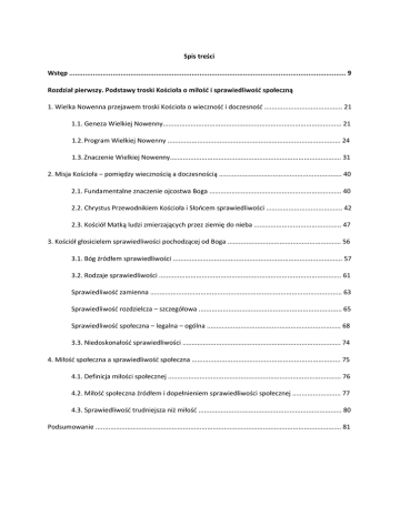 Spis treści Wstęp ............................................................................................................................................ 9 Rozdział pierwszy. Podstawy troski Kościoła o miłość i sprawiedliwość społeczną 1. Wielka Nowenna przejawem troski Kościoła o wieczność i doczesność .......................................... 21 1.1. Geneza Wielkiej Nowenny................................................................................................ 21 1.2. Program Wielkiej Nowenny ............................................................................................. 24 1.3. Znaczenie Wielkiej Nowenny............................................................................................ 31 2. Misja Kościoła ‒ pomiędzy wiecznością a doczesnością .................................................................. 40 2.1. Fundamentalne znaczenie ojcostwa Boga ....................................................................... 40 2.2. Chrystus Przewodnikiem Kościoła i Słońcem sprawiedliwości ......................................... 42 2.3. Kościół Matką ludzi zmierzających przez ziemię do nieba ............................................... 47 3. Kościół głosicielem sprawiedliwości pochodzącej od Boga ............................................................. 56 3.1. Bóg źródłem sprawiedliwości ........................................................................................... 57 3.2. Rodzaje sprawiedliwości .................................................................................................. 61 Sprawiedliwość zamienna ....................................................................................................... 63 Sprawiedliwość rozdzielcza ‒ szczegółowa ............................................................................. 65 Sprawiedliwość społeczna ‒ legalna ‒ ogólna ........................................................................ 68 3.3. Niedoskonałość sprawiedliwości ..................................................................................... 74 4. Miłość społeczna a sprawiedliwość społeczna ................................................................................ 75 4.1. Definicja miłości społecznej ............................................................................................. 76 4.2. Miłość społeczna źródłem i dopełnieniem sprawiedliwości społecznej .......................... 77 4.3. Sprawiedliwość trudniejsza niż miłość ............................................................................. 80 Podsumowanie .................................................................................................................................... 81 Rozdział drugi. Troska Kościoła o miłość i sprawiedliwość społeczną wobec człowieka 1. Godność człowieka wezwaniem do miłości i sprawiedliwości wobec osoby ludzkiej …................... 85 1.1. Kościół nauczycielem i stróżem godności człowieka ........................................................ 85 1.2. Osoba ludzka podmiotem praw i obowiązków ................................................................ 92 1.3. Wychowanie człowieka do miłości i sprawiedliwości .................................................... 100 2. Maryja człowiekiem miłującym i sprawiedliwym ........................................................................... 104 2.1. Maryja „Zwierciadłem sprawiedliwości” Boga i „Matką pięknej miłości” …................... 104 2.2. Magnificat manifestem miłości i sprawiedliwości społecznej ....................................... 109 3. Człowiek miłujący i sprawiedliwy ................................................................................................... 118 3.1. Cechy człowieka miłującego i sprawiedliwego ............................................................... 118 3.2. Przykłady osób miłujących i sprawiedliwych .................................................................. 126 św. Józef Rzemieślnik ............................................................................................................ 126 św. Franciszek z Asyżu i jego duchowe córki ‒ św. Klara i bł. Jolanta ................................... 130 św. Stanisław Kostka ............................................................................................................. 132 św. Paweł Pustelnik ............................................................................................................... 133 bł. Władysław z Gielniowa .................................................................................................... 135 bp Stanisław Adamski ........................................................................................................... 136 Zofia Szczuka ......................................................................................................................... 138 Podsumowanie .................................................................................................................................. 140 Rozdział trzeci. Troska Kościoła o miłość i sprawiedliwość społeczną w rodzinie 1. Boży zamysł rodziny ....................................................................................................................... 143 1.1. Prymat rodziny w życiu społecznym .............................................................................. 144 1.2. Prawa rodziny ................................................................................................................ 148 1.3. Rodzina Bogiem silna ..................................................................................................... 154 1.4. Święta rodzina wzorem Bogiem silnej ........................................................................... 159 2. Zobowiązania spoczywające na rodz