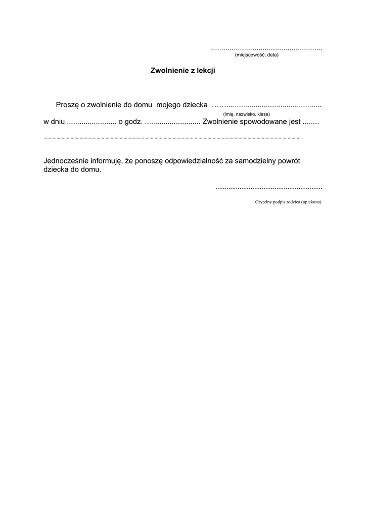 ...................................................... (miejscowość, data) Zwolnienie z lekcji Proszę o zwolnienie do domu mojego dziecka …….............................................. (imię, nazwisko, klasa) w dniu ........................ o godz. ........................... Zwolnienie spowodowane jest ........ ........................................................................................................................................................................................................ Jednocześnie informuję, że ponoszę odpowiedzialność za samodzielny powrót dziecka do domu. .......................................................... Czytelny podpis rodzica (opiekuna)