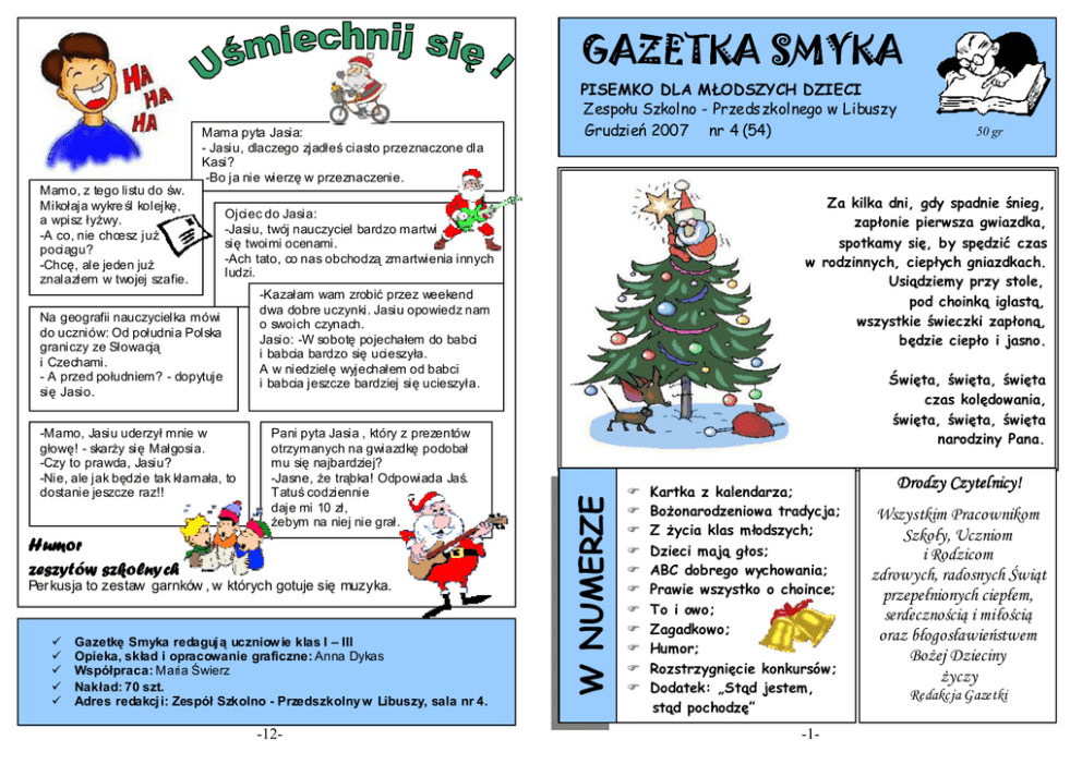 GAZETKA SMYKA Mama pyta Jasia: - Jasiu, dlaczego zjadłeś ciasto przeznaczone dla Kasi? -Bo ja nie wierzę w przeznaczenie. Na geografii nauczycielka mówi do uczniów: Od południa Polska graniczy ze Słowacją i Czechami. - A przed południem? - dopytuje się Jasio. -Mamo, Jasiu uderzył mnie w głowę! - skarŜy się Małgosia. -Czy to prawda, Jasiu? -Nie, ale jak będzie tak kłamała, to dostanie jeszcze raz!! -Kazałam wam zrobić przez weekend dwa dobre uczynki. Jasiu opowiedz nam o swoich czynach. Jasio: -W sobotę pojechałem do babci i babcia bardzo się ucieszyła. A w niedzielę wyjechałem od babci i babcia jeszcze bardziej się ucieszyła. Pani pyta Jasia , który z prezentów otrzymanych na gwiazdkę podobał mu się najbardziej? -Jasne, Ŝe trąbka! Odpowiada Jaś. Tatuś codziennie daje mi 10 zł, Ŝebym na niej nie grał. Humor zeszytów szkolnych Per kusja to zestaw garnków , w których gotuje się muzyka. Gazetkę Smyka redaguj ą uczniow ie klas I – III Opieka, skład i opracowanie graficzne: Anna Dykas Współpraca: Maria Świerz Nakład: 70 szt. Adres redakcj i: Zespół Szkolno - Przedszkolny w Libuszy, sala nr 4. -12- 50 gr Za kilka dni, gdy spadnie śnieg, zapłonie pierwsza gwiazdka, spotkamy się, by spędzić czas w rodzinnych, ciepłych gniazdkach. Usiądziemy przy stole, pod choinką iglastą, wszystkie świeczki zapłoną, będzie ciepło i jasno. Ojciec do Jasia: -Jasiu, twój nauczyciel bardzo martwi się twoimi ocenami. -Ach tato, co nas obchodzą zmartwienia innych ludzi. Święta, święta, święta czas kolędowania, święta, święta, święta narodziny Pana. W NUMERZE Mamo, z tego listu do św. Mikołaja wykre śl kolejkę, a wpisz łyŜwy. -A co, nie chcesz juŜ pociągu? -Chcę, ale jeden juŜ znalazłem w twojej szafie. PISEMKO DLA MŁODSZYCH DZIECI Zespołu Szkolno - Przedszkolnego w Libuszy Grudzień 2007 nr 4 (54) Kartka z kalendarza; BoŜonarodzeniowa tradycja; Z Ŝycia klas młodszych; Dzieci mają głos; ABC dobrego wychowania; Prawie wszystko o choince; To i owo; Zagadkowo; Humor; Rozstrzygnięcie konkursów; Dodatek: „Stąd jestem, stąd pochodzę” -1- Drodzy Czytelnicy! Czytelnicy! Wszystkim Pracownikom Szkoły, Uczniom i Rodzicom zdrowych, radosnych Świąt przepełnionych ciepłem, serdecznością i miłością oraz błogosławieństwem BoŜej Dzieciny Ŝyczy Redakcja Gazetki Kartka z kalendarza Grudzień 4 XII - Dzień Górnika, Barbórka 6 XII - Św. Mikołaja 13 XII - Rocznica wprowadzenia stanu wojennego w Polsce 20 XII - Dzień Ryby 22 XII - Początek zimy 24 XII - Wigilia Świąt BoŜego Narodzenia 25 XII - BoŜe Narodzenie 26 XII - Drugi dzień Świąt BoŜego Narodzenia, Świętej Rodziny 28 XII - Międzynarodowy Dzień Pocałunku 31 XII - Sylwester RozwiąŜ krzyŜówkę. Z zaznaczonych pól odczytaj hasło, zapisz je na kartce, przyklej kupon, podpisz się. Karteczkę z rozwiązaniem wrzuć do skrzynki Smyka w sali nr 4 do 10 stycznia 2008r. Dlacze go jest Świę to BoŜego Narodzenia? Dlacze go wpatrujemy się w gwiaz dę na nie bie? Dlacze go śpie wamy kolę dy? Dlate go, Ŝeby się uczyć miłości od Pana Jezusa. Dlate go, Ŝeby podawać sobie rę ce . Dlate go, Ŝeby się uśmie chać do sie bie . Dlate go, Ŝeby sobie prze baczać. Jan Twardowski Jak co roku w szyscy w ysyłam y do swoich bliskich kartki z Ŝyczeniam i, wszyscy ubieram y choinki. Zaw ieszamy na nich kolorow e lampki, błyszczące bombki, łańcuchy. W domu panuje niepow tarzalny nastrój. Czujem y zapach postnych potraw i ciast. Na stole królują: karp, barszcz, uszka z grzybami, Ŝurek, pierniczki, kompot z suszu. Łączy nas opłatek i w igilijna kolacja. Otw ieramy prezenty, śpiew am y kolędy. I tak postępujemy co roku, bo to jest nasza tradycja. I my zabierzemy ją w przyszłe lata! -2- 1. Dzień przed BoŜ ym Narodzeniem. 2. W Wigilię mówi ą ludz kim głosem. 3. MoŜe być biał y albo cz erwony. 4. Śpiewamy je od Wigilii. 5. Dzielimy si ę ni m i składamy Ŝ yczenia. 6. Podtrz ymujemy ją. 7. Zostawiamy je dla niespodziewanego gościa. 8. Str oimy ją w Wigilię. 9. Przed wieczerz ą czytamy Pismo ... . 10. Podajemy w niej zupy, np. barszcz. 11. Cias tko, moŜe być w kształcie serdusz ka. 12. N a dachu i podcz as Wigilii. 13. Z najdujemy je pod choi nką. KUPON Prawidłowe rozwiązanie łamigłówki z numeru 3 brzmi: Wyprawa po skarb. Nagrody wylosowali: Sławek Lewek, Szczepan Rządca, Anna Świerz, Kuba Gorzkowicz, Adrian Leszczynski, Natalia Ćmiech, Sylwia Pudlik, Natalia Furmanek, Agnieszka Sikora, Filip Niziołek, Katarzyna Gasior, Klaudia śegleń, Magdalena Huk, Sabina Skoczeń, Kacper Basista. -11- dobrego wychowania Snuje się po domu zapach cynamonu, gotowanych warzyw, maku, co się parzy, igliwia, wanilii – to zapach Wigilii... Na stole biały obrus, opłatek, postne potrawy, a przy stole cała rodzina. Panuje podniosły, świąteczny nastrój. Wieczerza wigilijna ma charakter uroczysty i powaŜny. Przy stole naleŜy zachowywać się kulturalnie. Zasady zachowania przy stole : Jedz cicho, nie wypada mlaskać ani siorbać. Jedz wolno, nabieraj małe kęsy. Nie moŜna rozmawiać z pełnymi ustami ani dmuchać na zbyt gorące potrawy. Nie naleŜy upominać się o następne danie, jeŜeli niektórzy jeszcze jedzą poprzednie. Nie wypada wymachiwać rękami jeŜeli trzymamy w nich sztućce. Nie oblizujemy palców, nie liŜemy talerza. Nie dzwonimy sztućcami o talerz. Nie wycieramy buzi rękawem, do tego słuŜą serwetki. Nie wiercimy się na krześle i nie wstajemy niepotrzebnie od stołu. Nie przekrzykujemy się nawzajem. Jak nakrywać stół? KaŜdej potrawy naleŜy spróbować choć troszeczkę. Inaczej w nadchodzącym roku będzie nam czegoś brakowało. Po wieczerzy wigilijnej śpiewamy kolędy. Są to pieśni opowiadające o narodzinach Jezusa. -10- Na wigilijnym stole nie moŜe zabraknąć opłatka, dodatkowego nakrycia dla nieoczekiwanego gościa, sianka pod obrusem. Wieczerzę wigilijną rozpoczynamy, gdy 