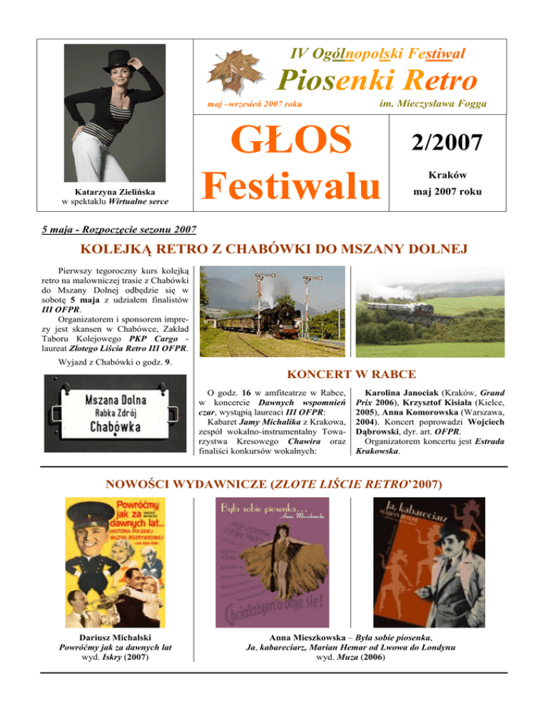 IV Ogólnopolski Festiwal Piosenki Retro maj –wrzesień 2007 roku im. Mieczysława Fogga 2/2007 Kraków maj 2007 roku Katarzyna Zielińska w spektaklu Wirtualne serce 5 maja - Rozpoczęcie sezonu 2007 KOLEJKĄ RETRO Z CHABÓWKI DO MSZANY DOLNEJ Pierwszy tegoroczny kurs kolejką retro na malowniczej trasie z Chabówki do Mszany Dolnej odbędzie się w sobotę 5 maja z udziałem finalistów III OFPR. Organizatorem i sponsorem imprezy jest skansen w Chabówce, Zakład Taboru Kolejowego PKP Cargo laureat Złotego Liścia Retro III OFPR. Wyjazd z Chabówki o godz. 9. KONCERT W RABCE O godz. 16 w amfiteatrze w Rabce, w koncercie Dawnych wspomnień czar, wystąpią laureaci III OFPR: Kabaret Jamy Michalika z Krakowa, zespół wokalno-instrumentalny Towarzystwa Kresowego Chawira oraz finaliści konkursów wokalnych: Karolina Janociak (Kraków, Grand Prix 2006), Krzysztof Kisiała (Kielce, 2005), Anna Komorowska (Warszawa, 2004). Koncert poprowadzi Wojciech Dąbrowski, dyr. art. OFPR. Organizatorem koncertu jest Estrada Krakowska. NOWOŚCI WYDAWNICZE (ZŁOTE LIŚCIE RETRO’2007) Dariusz Michalski Powróćmy jak za dawnych lat wyd. Iskry (2007) Anna Mieszkowska – Była sobie piosenka, Ja, kabareciarz, Marian Hemar od Lwowa do Londynu wyd. Muza (2006) Głos Festiwalu, nr 2/2007, Kraków, kwiecień 2007 roku Str. 2 Premiera w warszawskim teatrze Syrena WIRTUALNE SERCE (ZŁOTY LIŚĆ RETRO’2007) Wirtualne serce, Teatr Syrena, Warszawa, premiera 18 marca 2007 roku. Opieka reż. Zuzanna Dobrucka-Mendyk. Najbliższe spektakle: 6, 20 maja Katarzyna Zielińska jest kobietą sukcesu. Zaledwie 4 lata temu skończyła krakowską PWST, a już zdążyła zaliczyć udział w paru filmach, kilka znaczących premier teatralnych w Kwadracie i Rampie, zgarnęła kilka nagród na Przeglądzie Piosenki Aktorskiej we Wrocławiu i Festiwalu im. Agnieszki Osieckiej, nagrała płytę. Jest kobietą zabieganą i zapracowaną. Na spotkanie umówiła się w przelocie, między nagraniem w studiu radiowym, a wizytą na planie kolejnego odcinka telewizyjnego Klanu. Podczas rozmowy odebrała kilka rozmów telefonicznych od producenta, menagera i zaprzyjaźnionego kompozytora, dopinając swój wieczorny występ w Harendzie. Młodzieżowa grupa Cinq G nagrała płytę Fogga Ragga, na której znalazły się piosenki Mieczysława Fogga, utrzymane w stylistyce reggae, dancehall, ragga. Nowej interpretacji doczekały się m.in. piosenki Na uliczce mojej, Odpukaj pan, To Ostatnia Niedziela. Płyta jest hołdem złożonym największemu bardowi Warszawy i stanowi kolejny dowód jego nieprzemijającej popularności. (Złoty Liść Retro’2007). Jest kobietą niespokojną i przebojową, jeszcze nie ochłonęła po premierze najnowszego spektaklu w teatrze Syrena, a już ma głowę pełną pomysłów i projektów na przyszłość. Typowa „współczesna kobieta, poruszająca się pewnie w dzisiejszym świecie, zarówno realnym, jak i wirtualnym, korzystająca ze wszystkich zdobyczy techniki, takich jak komórka czy internet, szukająca swojego miejsca w otaczającej ją rzeczywistości”. Tak opisuje w programie bohaterkę swojego widowiska muzycznego Wirtualne serce, a w gruncie rzeczy przedstawia samą siebie. I oto ta atrakcyjna kobieta, wyzwolona i samodzielna w każdym calu businesswoman, wydawałoby się zimna i wyrachowana, tęskni za chwilą spokoju, ciepłem domowego ogniska, staroświeckim stylem życia, odrobiną szczęścia w miłości. To wszystko odnajduje w starych, przedwojennych piosenkach. Okazuje się, że świat pędzi naprzód, ale człowiek w głębi duszy pozostał taki sam. I swoje uczucia może dziś równie szczerze wyrazić tekstami i melodiami naszych babć sprzed lat 70. Kasia Zielińska trafnie dobrała piosenki swojego recitalu, spośród tych, które lubi najbardziej, zgodnie ze swym charakterem i temperamentem. Jak sama twierdzi, dojrzała właśnie do tych piosenek. Jest przez to przekonująca i wiarygodna w tym co mówi i śpiewa, umiejętnie kontrastując współczesną polszczyznę swych monologów (autorstwa Moniki Szwaji) z nostalgią i nieco staroświeckim wdziękiem. Zaskakuje interpretacją piosenek i wyglądem (kilkakrotnie zmienia swój sceniczny image), jest urocza, ma przy tym znakomity kontakt z publicznością, jest dowcipna i melancholijna zarazem. Dzięki niej, odkurzone piosenki stają się znów aktualne i modne. Towarzyszy jej zespół muzyczny w składzie: Andrzej Perkman (fortepian), Mariusz Praśniewski (gitara basowa, Jerzy Markuszewski (perkusja), brzmiący nowocześnie, ale zachowujący klimat tamtej epoki. Tyle miłości, reż. Janusz Józefowicz (Złoty Liść Retro 2004) Teatr Buffo, Warszawa, piątek, 18 maja, godz. 19 Organizacja Festiwalu: Estrada Krakowska www.estrada.net.pl Dyrektor artystyczny: Wojciech Dąbrowski, tel. 0-600 630 952 Zapraszamy na strony: www.spotkaniazpiosenka.org, www.fogg.pl Redakcja i opracowanie Gazety Festiwalowej: Wojciech Dąbrowski