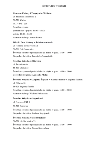 ŚWIETLICE WIEJSKIE Centrum Kultury i Turystyki w Walimiu ul. Tadeusza Kościuszki 2 58-320 Walim tel. 74 8457 230 Świetlica czynna: poniedziałek – piątek: 11:00 – 19:00 sobota: 10:00 – 14:00 Animator kultury: Joanna Rubka Wiejski Dom Kultury w Dziećmorowicach ul. Henryka Sienkiewicza 75 58-308 Dziećmorowice Świetlica czynna od poniedziałku do piątku w godz. 15:00 – 19:00 Gospodarz świetlicy: Franciszka Szczeciniak Świetlica Wiejska w Olszyńcu ul. Świdnicka 4a 58-330 Olszyniec Świetlica czynna od poniedziałku do piątku w godz. 16:00 – 20:00 Gospodarz świetlicy: Agnieszka Madej Świetlica Wiejska w Zagórzu Śląskim w Klubie Strażaka w Zagórzu Śląskim ul. Główna 10 58-321 Zagórze Śląskie Świetlica czynna od poniedziałku do piątku w godz. 16:00 – 20:00 Animator kultury: Wioletta Pańczyszak Świetlica Wiejska w Jugowicach ul. Dworzec PKP 1 58-321 Jugowice Świetlica czynna od poniedziałku do piątku w godz. 15:00 – 19:00 Gospodarz świetlicy: Barbara Kręciproch Świetlica Wiejska w Niedźwiedzicy 58-321 Niedźwiedzica 33 Świetlica czynna od poniedziałku do piątku w godz. 15:00 – 19:00 Gospodarz świetlicy: Teresa Sobczyńska