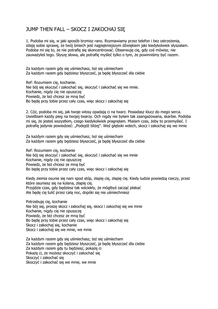 JUMP THEN FALL – SKOCZ I ZAKOCHAJ SIĘ 1. Podoba mi się, w jaki sposób brzmisz rano. Rozmawiamy przez telefon i bez ostrzeżenia, zdaję sobie sprawę, że twój śmiech jest najpiękniejszym dźwiękiem jaki kiedykolwiek słyszałam. Podoba mi się to, że nie potrafię się skoncentrować. Obserwuję cię, gdy coś mówisz, nie zauważyłeś tego. Słyszę słowa, ale potrafię myśleć tylko o tym, że powinniśmy być razem. Za każdym razem gdy się uśmiechasz, też się uśmiecham Za każdym razem gdy będziesz błyszczeć, ja będę błyszczeć dla ciebie Ref: Rozumiem cię, kochanie. Nie bój się skoczyć i zakochać się, skoczyć i zakochać się we mnie. Kochanie, nigdy cię nie opuszczę Powiedz, że też chcesz ze mną być Bo będę przy tobie przez cały czas, więc skocz i zakochaj się 2. Cóż, podoba mi się, jak twoje włosy opadają ci na twarz. Posiadasz klucz do mego serca. Uwielbiam każdy pieg na twojej twarzy. Och nigdy nie byłam tak zaangażowana, skarbie. Podoba mi się, że jesteś wszystkim, czego kiedykolwiek pragnęłam. Miałam czas, żeby to przemyśleć. I potrafię jedynie powiedzieć: „Podejdź bliżej”. Weź głęboki wdech, skocz i zakochaj się we mnie Za każdym razem gdy się uśmiechasz, też się uśmiecham Za każdym razem gdy będziesz błyszczeć, ja będę błyszczeć dla ciebie Ref: Rozumiem cię, kochanie Nie bój się skoczyć i zakochać się, skoczyć i zakochać się we mnie Kochanie, nigdy cię nie opuszczę Powiedz, że też chcesz ze mną być Bo będę przy tobie przez cały czas, więc skocz i zakochaj się Kiedy ziemia osunie się nam spod stóp, złapię cię, złapię cię. Kiedy ludzie powiedzą rzeczy, przez które osuniesz się na kolana, złapię cię. Przyjdzie czas, gdy będziesz tak wściekły, że mógłbyś zacząć płakać Ale będę cię tulić przez całą noc, dopóki się nie uśmiechniesz Potrzebuję cię, kochanie Nie bój się, proszę skocz i zakochaj się, skocz i zakochaj się we mnie Kochanie, nigdy cię nie opuszczę Powiedz, że też chcesz ze mną być Bo będę przy tobie przez cały czas, więc skocz i zakochaj się Skocz i zakochaj się, kochanie Skocz i zakochaj się we mnie, we mnie Za każdym razem gdy się uśmiechasz, też się uśmiecham Za każdym razem gdy będziesz błyszczeć, ja będę błyszczeć dla ciebie Za każdym razem gdy tu będziesz, pokażę ci Pokażę ci, że możesz skoczyć i zakochać się Skoczyć i zakochać się Skoczyć i zakochać się we mnie, we mnie NIEOSIĄGALNY - UNTOUCHABLE 1. Nieosiągalny jak odległe diamentowe niebo. Sięgam ku tobie, ale nie potrafię powiedzieć ci czemu. Zadurzyłam się w tobie, zadurzyłam się w tobie Nieosiągalny, płoniesz jaśniej niż słońce. I kiedy jesteś blisko, czuję, jakbym się rozpadała. Ref: W środku nocy, kiedy jestem w tym śnie To jakby milion małych gwiazd układały Twoje imię Musisz się pospieszyć, pospieszyć Powiedz, że będziemy razem Dalej, dalej... skosztujmy odrobiny nieba 2. Jest późno, a ja nie chcę tutaj czekać cały dzień. Wiem, że mówisz, iż byłbyś tu tak czy inaczej. Ale jesteś nieosiągalny, płoniesz jaśniej niż słońce. Teraz, kiedy jesteś blisko, czuję, jakbym się rozpadała. Ref: W środku nocy, kiedy jestem w tym śnie To jakby milion małych gwiazd układały Twoje imię Musisz się pospieszyć, pospieszyć Powiedz, że będziemy razem Dalej, dalej, oh W środku nocy, moglibyśmy stworzyć ten sen Chcę Cię czuć po mojej stronie, stojącego obok mnie Musisz się pospieszyć, pospieszyć Powiedzieć, że będziemy razem Dalej, dalej... skosztujmy odrobiny nieba Zadurzyłam się w Tobie, oh, oh Ale jesteś nieosiągalny, płoniesz jaśniej niż słońce. Teraz, kiedy jesteś blisko, czuję, jakbym się rozpadała. W środku nocy, kiedy jestem w tym śnie To jakby milion małych gwiazd układały Twoje imię Musisz się pospieszyć, pospieszyć Powiedz, że będziemy razem Dalej, dalej, oh W środku nocy, kiedy jestem w tym śnie To jakby milion małych gwiazd układały Twoje imię Musisz się pospieszyć, pospieszyć Powiedz, że będziemy razem Dalej, dalej Dalej W środku nocy, moglibyśmy stworzyć ten sen Chcę Cię czuć po mojej stronie, stojącego obok mnie Musisz się pospieszyć, pospieszyć Powiedzieć, że będziemy razem Dalej, dalej... Skosztujmy odrobiny nieba W środku nocy, kiedy jestem w tym śnie To jakby milion małych gwiazd układały Twoje imię Musisz się pospieszyć, pospieszyć Powiedz, że będziemy razem Dalej, dalej Dalej, dalej, oh oh oh To jakby milion małych gwiazd układały Twoje imię Układały Twoje imię, oh COME IN WITH THE RAIN - PRZYJDŹ Z DESZCZEM 1. Mogłabym wrócić do każdego uśmiechu Ale nie chcę tam iść nigdy więcej I znam drogę do twoich drzwi Ale nie chcę tam iść nigdy więcej Porozmawiaj z wiatrem, porozmawiaj z niebem Porozmawiaj z kimś, kto wie dlaczego I daj mi znać czego się dowiesz Ref: Zostawię otwarte okno Bo w nocy jestem zbyt zmęczona, żeby wołać twoje imię Wiedz tylko, że jestem tu z nadzieją Że wejdziesz z deszczem 2. Mogłabym wstać i zaśpiewać ci piosenkę Ale nie chcę posunąć się tak daleko I znam, znam cię dobrze Znam cię na pamięć, a ty nawet nie wiesz gdzie zaczynam Porozmawiaj ze sobą, porozmawiaj z łzami Porozmawiaj z kimś, kto cię tu zesłał I nie czekaj aż niebo się przejaśni Ref: Zostawię otwarte okno Bo w nocy jestem zbyt zmęczona, żeby wołać twoje imię Wiedz tylko, że jestem tu z nadzieją Że wejdziesz z deszczem Obserwowałam cię bardzo długo, wołałam twoje imię Nie wiem co jeszcze mogę powiedzieć Ale zostawię otwarte okno Bo w nocy jestem zbyt zmęczona na te gry Wiedz tylko, że jestem tu z nadzieją Że wejdziesz z deszczem Mogłabym wrócić do każdego uśmiechu Ale nie chcę już tam iść SUPERSTAR – SUPER GWIAZDA 1. To źle, ale nie potrafię nic na to poradzić i ciągle czuję, że nie ma nic słuszniejszego, kochani