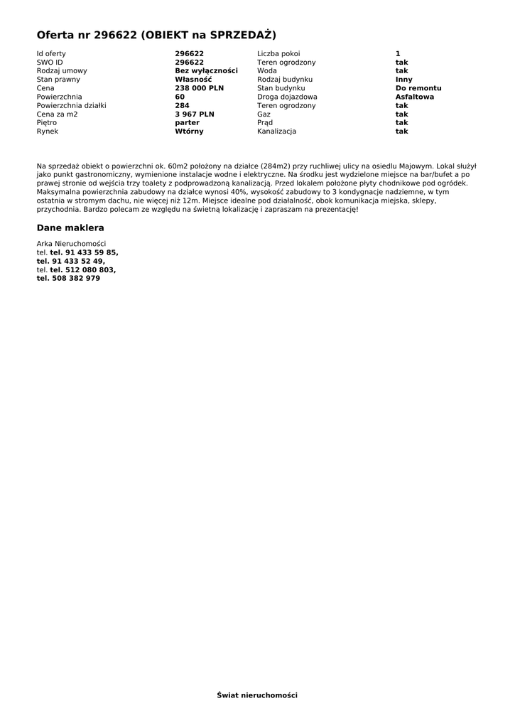 Oferta nr 296622 (OBIEKT na SPRZEDAŻ)