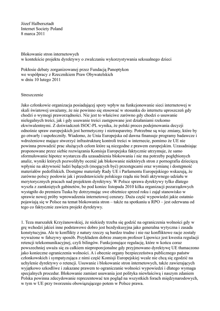 Józef Halbersztadt Internet Society Poland 8 marca 2011 Blokowanie stron internetowych w kontekście projektu dyrektywy o zwalczaniu wykorzystywania seksualnego dzieci Pokłosie debaty zorganizowanej przez Fundacją Panoptykon we współpracy z Rzecznikiem Praw Obywatelskich w dniu 10 lutego 2011 Streszczenie Jako członkowie organizacja posiadającej spory wpływ na funkcjonowanie sieci internetowej w skali światowej uważamy, że nie powinno się stosować w stosunku do internetu uproszczeń gdy chodzi o wymogi praworządności. Nie jest to właściwe zarówno gdy chodzi o usuwanie nielegalnych treści, jak i gdy usuwanie treści zastępowane jest działaniami rzekomo ekwiwalentnymi. Z doświadczeń ISOC-PL wynika, że polski proces podejmowania decyzji odnośnie spraw europejskich jest hermetyczny i nietrasparetny. Potrzebne są więc zmiany, które by go otwarły i uspołeczniły. Wiadomo, że Unia Europejska od dawna finansuje programy badawcze i wdrożeniowe mające stworzyć infrastrukturę kontroli treści w internecie, pomimo że UE nie powinna prowadzić prac służących celom które są niezgodne z prawem europejskim. Uzasadniając proponowane przez siebie rozwiązania Komisja Europejska faktycznie utrzymuje, że samo sformułowanie hipotez wystarcza dla uzasadnienia blokowania i nie ma potrzeby pogłębionych analiz, wyniki których pozwoliłyby ocenić jak blokowanie niektórych stron z pornografia dziecięcą wpłynie na aktywność ludzi będących (mogących być) przestępcami oraz wymianę i dostępność materiałów pedofilskich. Dostępne materiały Rady UE i Parlamentu Europejskiego wskazują, że zarówno polscy posłowie jak i przedstawiciele polskiego rządu nie brali aktywnego udziału w merytorycznych pracach nad projektem dyrektywy. W Polsce sprawa dyrektywy tylko dlatego wyszła z zamkniętych gabinetów, bo pod koniec listopada 2010 kilka organizacji pozarządowych wystąpiło do premiera Tuska by dotrzymując swe obietnice sprzed roku i zajął stanowisko w sprawie nowej próby wprowadzenia internetowej cenzury. Duża część wypowiedzi jakie ostatnio pojawiają się w Polsce na temat blokowania stron – także na spotkaniu u RPO – jest oderwana od tego co faktycznie zawiera projekt dyrektywy. 1. Teza marszałek Krzyżanowskiej, że niekiedy trzeba się godzić na ograniczenia wolności gdy w grę wchodzi jakieś inne podstawowe dobro jest bezdyskusyjna jako generalna wytyczna i zasada konstytucyjna. Ale te konflikty z natury rzeczy są bardzo trudne i nie raz konfliktowe racje zostały wyważone w fałszywy sposób. Przykładem dobrze znanym profesor Lipowicz jest kwestia regulacji retencji telekomunikacyjnej, czyli bilingów. Funkcjonujące regulację, które w końcu coraz powszechniej uważa się za całkiem nieproporcjonalne gdy przyjmowano dyrektywę UE tłumaczono jako konieczne ograniczenia wolności. A i obecnie organy bezpieczeństwa publicznego państw członkowskich i sympatyzująca z nimi część Komisji Europejskiej wcale nie chcą się zgodzić na uchylenie dyrektywy o retencji. Usuwanie i blokowanie stron internetowych, także zawierających wyjątkowo szkodliwe i zakazane prawem to ograniczanie wolności wypowiedzi i dlatego wymaga specjalnych procedur. Blokowanie zamiast usuwania jest polityka niewłaściwą i naszym zdaniem Polska powinna zdecydowanie reprezentować ten pogląd na wszystkich forach międzynarodowych, w tym w UE przy tworzeniu obowiązującego potem w Polsce prawa. 2. O tym jak rozstrzygać konflikty o podstawowe wartości mówią odpowiednie przepisy konstytucji. Problem polega na tym, że właśnie te zasady konstytucyjne polska władza rządowa ma za nic. Gdy zajmujemy się blokowaniem stron internetowych mówimy o konkretnej dyrektywie Unii Europejskiej w określony sposób sformułowanymi zapisami i konkretnej procedurze jej stanowienia. W tym kontekście organy polskiego państwa zawiodły nasze oczekiwania i sprzeniewierzyły się swojej roli. Jednakże ta dyrektywa nie jest jeszcze przyjęta, więc Polska jako jej organa państwowe będzie miała jeszcze nie jedną okazję realizowania woli aktywnej części polskiego społeczeństwa. 3. Internet Society Poland uczestniczył już w takiej zmianie stanowiska Polski. Chodziło dyrektywę o patentowalności oprogramowania komputerowego. 11 maja 2004 ISOC-PL z pomocą sprzyjających nam parlamentarzystów zorganizował w sali Kolumnowej Sejmu całodniową międzynarodową konferencję na ten temat. Jej przebieg był jednoznaczny, nie było wypowiedzi za patentowalnością oprogramowania. Pomimo tego, w tydzień później, 18 mają 2004, polski minister nie sprzeciwił się zaakceptowaniu przez Radę UE w drugim czytaniu tej dyrektywy. Potem nastąpiła zmiana odpowiedzialnego ministra i 17 listopada po posiedzeniu Rady Ministrów rząd RP ogłosił, że nie popiera dyrektywy. Od listopada przedstawiciele rządu powtarzali parę razy, że Polska już nie popiera dyrektywy w kształcie z 18 maja, a ostatnim etapem było głosowanie w Parlamencie Europejskim 6 lipca 2005, w którym rola Jerzego Buzka w doprowadzeniu do sytuacji że dyrektywa była odrzucona niemal jednomyślnie była bardzo znaczna. 4. Podobnie i w przypadku istotnych dla nas przepisów dyrektywy o zapobieganiu wykorzystywania dzieci widzimy racje i powody, które powinny doprowadzić do zasadniczego przeformułowania polskiego stanowiska. 5. Na podstawie naszych doświadczeń uważamy, że nie jest to jedynie kwestia jednostkowej zmiany. Potrzebne są zmiany instytucjonalnych, które tak skorygują tryb określania polskiego stanowiska w Radzie UE. Nie powinno to być woluntarystyczne zdanie pojedynczych i do tego nieznanych opinii publicznej osób. Skoro dyrektywa UE ma takie konsekwencje jak ustawa to w ramach przyjętego trybu postępowania udział Sejmu, a za jego pośrednictwem zainteresowanych środowisk nie może pozostawać formalnością. 6. Decyzje legislacyjne nie są w Unii Europejski