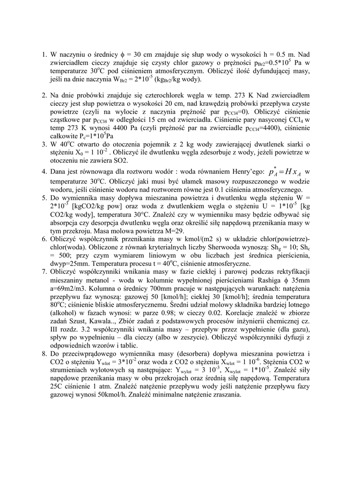 1. W naczyniu o średnicy = 30 cm znajduje się słup wody o wysokości h = 0.5 m. Nad zwierciadłem cieczy znajduje się czysty chlor gazowy o prężności pBr2=0.5*105 Pa w temperaturze 30oC pod ciśnieniem atmosferycznym. Obliczyć ilość dyfundującej masy, jeśli na dnie naczynia WBr2 = 2*10-5 (kgBr2/kg wody). 2. Na dnie probówki znajduje się czterochlorek węgla w temp. 273 K Nad zwierciadłem cieczy jest słup powietrza o wysokości 20 cm, nad krawędzią probówki przepływa czyste powietrze (czyli na wylocie z naczynia prężność par pCCl4=0). Obliczyć ciśnienie cząstkowe par pCCl4 w odległości 15 cm od zwierciadła. Ciśnienie pary nasyconej CCl 4 w temp 273 K wynosi 4400 Pa (czyli prężność par na zwierciadle pCCl4=4400), ciśnienie całkowite Pc=1*105Pa 3. W 40oC otwarto do otoczenia pojemnik z 2 kg wody zawierającej dwutlenek siarki o stężeniu X0 = 1 10-2 . Obliczyć ile dwutlenku węgla zdesorbuje z wody, jeżeli powietrze w otoczeniu nie zawiera SO2. * 4. Dana jest równowaga dla roztworu wodór : woda równaniem Henry’ego: p A H x A w temperaturze 30oC. Obliczyć jaki musi być ułamek masowy rozpuszczonego w wodzie wodoru, jeśli ciśnienie wodoru nad roztworem równe jest 0.1 ciśnienia atmosferycznego. 5. Do wymiennika masy dopływa mieszanina powietrza i dwutlenku węgla stężeniu W = 2*10-3 [kgCO2/kg pow] oraz woda z dwutlenkiem węgla o stężeniu U = 1*10-5 [kg CO2/kg wody], temperatura 30C. Znaleźć czy w wymienniku masy będzie odbywać się absorpcja czy desorpcja dwutlenku węgla oraz określić siłę napędową przenikania masy w tym przekroju. Masa molowa powietrza M=29. 6. Obliczyć współczynnik przenikania masy w kmol/(m2 s) w układzie chlor(powietrze)chlor(woda). Obliczone z równań kryterialnych liczby Sherwooda wynoszą: Shg = 10; Shc = 500; przy czym wymiarem liniowym w obu liczbach jest średnica pierścienia, dwyp=25mm. Temperatura procesu t = 40oC, ciśnienie atmosferyczne. 7. Obliczyć współczynniki wnikania masy w fazie ciekłej i parowej podczas rektyfikacji mieszaniny metanol - woda w kolumnie wypełnionej pierścieniami Rashiga 35mm a=69m2/m3. Kolumna o średnicy 700mm pracuje w następujących warunkach: natężenia przepływu faz wynoszą: gazowej 50 [kmol/h]; ciekłej 30 [kmol/h]; średnia temperatura 80oC; ciśnienie bliskie atmosferycznemu. Średni udział molowy składnika bardziej lotnego (alkohol) w fazach wynosi: w parze 0.98; w cieczy 0.02. Korelacje znaleźć w zbiorze zadań Szust, Kawala.., Zbiór zadań z podstawowych procesów inżynierii chemicznej cz. III rozdz. 3.2 współczynniki wnikania masy – przepływ przez wypełnienie (dla gazu), spływ po wypełnieniu – dla cieczy (albo w zeszycie). Obliczyć współczynniki dyfuzji z odpowiednich wzorów i tablic. 8. Do przeciwprądowego wymiennika masy (desorbera) dopływa mieszanina powietrza i CO2 o stężeniu Ywlot = 3*10-2 oraz woda z CO2 o stężeniu Xwlot = 1 10-6. Stężenia CO2 w strumieniach wylotowych są następujące: Ywylot = 3 10-3, Xwylot = 1*10-5. Znaleźć siły napędowe przenikania masy w obu przekrojach oraz średnią siłę napędową. Temperatura 25C ciśnienie 1 atm. Znaleźć natężenie przepływu wody jeśli natężenie przepływu fazy gazowej wynosi 50kmol/h. Znaleźć minimalne natężenie zraszania.