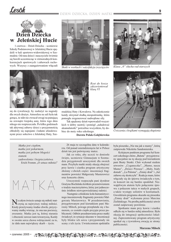 9 dzień dziecka, dzień matki Dzień Dziecka w Jeleńskiej Hucie 1 czerwca – Dzień Dziecka – uczniowie Szkoły Podstawowej w Jeleńskiej Hucie spędzili w hali sportowo-widowiskowej w Szemudzie. Od rana dzieci i nauczyciele świetnie się bawili uczestnicząc w różnorodnych konkurencjach sportowych i zabawach ruchowych. Wszyscy z zaangażowaniem włączali Skoki w workach i satysfakcja zwycięzców Klasa „0” słucha rad starszych Rzut do kosza zdezorientował klasę VI się do rywalizacji, by zasłużyć na nagrody dla swych drużyn. Atmosfera na sali była tak gorąca, że nikt nie zwracał uwagi na panującą na zewnątrz kiepską aurę, która tego dnia nikogo nie rozpieszczała. Po kilku godzinach tak aktywnej zabawy dzieci z przyjemnością chłodziły się napojami i lodami ufundowanymi przez sołectwo z Jeleńskiej Huty, Sze- Matka jest ciepłem, matka jest pokarmem, matka jest pełnym błogości stanem zadowolenia i bezpieczeństwa. Erich Fromm „O sztuce miłości” M AT K A N a całym świecie uznaje się miłość matczyną za najwyższy rodzaj miłości. Kiedy przeżywamy trudne chwile, przyzywamy matkę wierząc, że ona nas pocieszy, zrozumie. Matka jest tą, której starania i obecność zawsze nam towarzyszą. Każdy w swoim sercu chowa wdzięczność za to, że dała nam największy skarb – życie. mudzkiej Huty i Kowalewa. Na zakończenie każdy otrzymał słodką niespodziankę, która pomogła zregenerować nadwątlone siły. Tak spędzony dzień wprowadził wszystkich w dobry nastrój i pomógł „naładować akumulatorki” potrzebne wszystkim, by dobiec do mety roku szkolnego. Ćwiczenia z krążkami wymagają skupienia Dorota Polak-Gołębiewska 26 maja to szczególna data w kalendarzu. Od ponad osiemdziesięciu lat w Polsce dzień ten jest poświęcony matce. Jak co roku, aby uczcić to doniosłe święto, uczniowie Gimnazjum w Szemudzie przygotowali uroczystość dla swoich mam. Przybyłe matki miały okazję obejrzeć przy kawie i ciastku program artystyczny złożony z dwóch części: inscenizacji fragmentów powieści Małgorzaty Musierowicz oraz koncertu chóru. Uroczystość rozpoczęła pani dyrektor Grażyna Bochińska krótkim przemówieniem o trudzie macierzyństwa, który jest jednocześnie źródłem niewypowiedzianej radości. Następnie członkinie koła humanistycznego inscenizowały fragmenty powieści Małgorzaty Musierowicz. W przedstawieniu, przygotowanym pod kierunkiem pani Marzeny Miloch, powaga przeplatała się z humorem, co zostało ciepło przyjęte przez publiczność. Odbiór przedstawienia przez matki świadczył, że sytuacje ukazane w inscenizacji były bliskie ich sercu i przypominały im sceny z ich życia. Uwieńczeniem spektaklu była piosenka „Nie ma jak u mamy”, którą zaśpiewała Nikoletta Sandomierska. Kolejnym punktem programu był koncert szkolnego chóru „Batuta” przygotowany specjalnie na tę okazję pod kierunkiem pani Beaty Stenki. Chór wykonał siedem utworów: „Cyganeczka”, „Mamo, nasza Mamo”, „Dzieci Pireusu”, „Mały, biały domek”, „La Paloma”, „Zimny drań” i „Już zabawa się skończyła”. Reakcja mam, które włączały się do śpiewu świadczyła o tym, że koncert im się bardzo spodobał. Niewątpliwym atutem było połączenie śpiewu z pokazem tańca w małych grupach, a także występy solistów w kostiumach. Gwoździem programu okazała się piosenka „Zimny drań” wykonana przez Marcina Zielińskiego. Na prośbę publiczności utwór został zaśpiewany powtórnie. Spotkanie mam przy kawie i ciastku odbyło się w bardzo miłej atmosferze. Było okazją do integracji społeczności lokalnej. Zaprezentowany program artystyczny spotkał się z żywiołową owacją ze strony publiczności. Marzena Miloch • czerwiec 2005 • 10 dzień matki C iągle istnieją wśród nas Anioły. Nie mają wprawdzie skrzydeł, lecz ich serce jest bezpiecznym portem dla wszystkich, którzy są w potrzebie. Matka-Anioł – ktoś, kto zawsze pomoże, wysłucha, zrozumie, wybaczy. Które dziecko właśnie tak nie myśli o swojej mamie? Jest to myślenie jak najbardziej słuszne, bo przecież każdy z nas bez względu na to, ile ma lat, wiele matce zawdzięcza. Również dzieci z SP w Kielnie 24 maja wyraziły swoją wdzięczność ukochanym mamom. Na uroczystość przybyło bardzo dużo pań, za co uczniowie i nauczyciele serdecznie im dziękują. Program spotkania był bogaty i prawie każda mama mogła zobaczyć i usłyszeć swoje dziecko. Jako pierwsi wystąpili uczniowie z kółka teatralnego i przedstawili ,,Szewczyka Dratewkę”. Uczniowie z klasy IVa w ciepłych słowach wyrazili swoje uczucia do mam, a najmłodsi zaprezentowali piękne układy taneczne i zaśpiewali dla mam kilka piosenek. Całość uświetnił chór szkoły podstawowej i gimnazjum. Niejedna łezka zakręciła się w oku każdej mamy, gdy usłyszała jak jej syn czy córka Matka – najpiękniejsze słowo świata dziękują za pracę i poświęcenie. Tym bardziej, że uczniowie od dawna przygotowywali się do tego święta. Razem ze swoimi nauczycielami własnoręcznie wykonali prezenty dla mam, które wręczyli na zakończenie uroczystości. Chciałabym podziękować wszystkim uczniom, nauczycielom a także paniom z Rady Rodziców za pracę włożoną w przygotowanie akademii. Anetta Langa Czy wiecie, że... Dzień Matki – historia Dzień Matki to święto obchodzone corocznie (w Polsce 26 maja) jako wyraz szacunku wobec matek. W tym dniu są one zwykle obdarowywane laurkami, kwiatami i prezentami przez własne dzieci, rzadziej inne osoby. Początki tego święta sięgają czasów starożytnych Greków i Rzymian. Kultem otaczano wtedy Matki-Boginie – symbole płodności i urodzaju. Zwyczaj powrócił w XVII do Anglii pod nazwą „Niedziela u Matki” (Mothering Sunday). Dzień, w którym obchodzono to święto był wolny od pracy. Do tradycji należało składanie matce podarunków, g