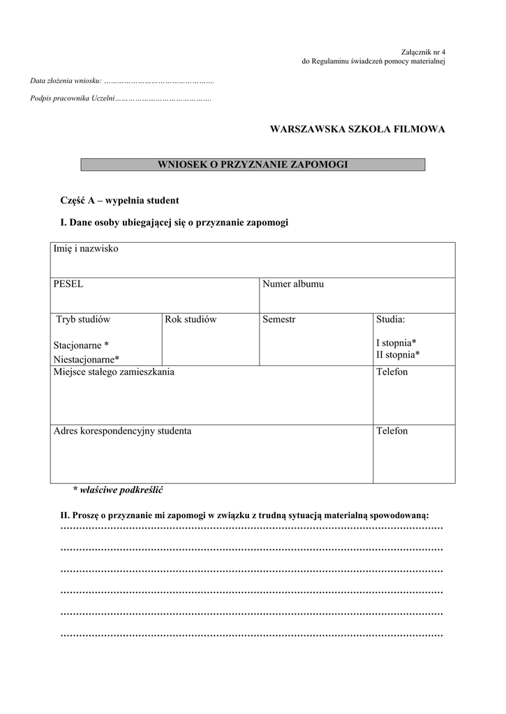 Załącznik nr 4 do Regulaminu świadczeń pomocy materialnej Data złożenia wniosku: …………………………………………. Podpis pracownika Uczelni……………………………………. WARSZAWSKA SZKOŁA FILMOWA WNIOSEK O PRZYZNANIE ZAPOMOGI Część A – wypełnia student I. Dane osoby ubiegającej się o przyznanie zapomogi Imię i nazwisko PESEL Tryb studiów Numer albumu Rok studiów Semestr Studia: Stacjonarne * Niestacjonarne* Miejsce stałego zamieszkania I stopnia* II stopnia* Adres korespondencyjny studenta Telefon Telefon * właściwe podkreślić II. Proszę o przyznanie mi zapomogi w związku z trudną sytuacją materialną spowodowaną: …………………………………………………………………………………………………………… …………………………………………………………………………………………………………… …………………………………………………………………………………………………………… …………………………………………………………………………………………………………… …………………………………………………………………………………………………………… …………………………………………………………………………………………………………… Świadomy/a odpowiedzialności za podanie nieprawdziwych danych oświadczam, że: *) □ubiegam się o pomoc materialną tylko na w/w kierunku studiów, □miesięczny dochód na osobę w mojej rodzinie wynosi ............................. zł netto, □wnioskowana zapomoga jest pierwszą zapomogą w bieżącym roku akademickim, □wnioskowana zapomoga jest drugą zapomogą w bieżącym roku akademickim, □ukończyłem dotychczas: □ studia pierwszego stopnia, □ studia drugiego stopnia, □ jednolite studia magisterskie, □nie ukończyłem dotychczas żadnych studiów wyższych, □po ukończeniu w roku ……………………….…….. studiów pierwszego stopnia kontynuuję naukę w celu uzyskania tytułu zawodowego magistra. *) proszę postawić znak X w kwadracie przy właściwym stwierdzeniu i uzupełnić brakujące informacje .................................................................................................... data i podpis studenta III. W przypadku przyznania świadczeń*): □ proszę o dokonanie przelewu na moje konto: Nazwa i oddział Banku ......................................................................................................................... Nr konta: □ proszę o przelanie kwot przyznanych mi świadczeń pomocy materialnej na pokrycie kosztów czesnego. *) proszę postawić znak X w kwadracie przy wybranej opcji i uzupełnić brakujące informacje .................................................................................................... data i podpis studenta IV. Załączniki: 1) Oświadczenie o niepobieraniu świadczeń pomocy materialnej 2) Oświadczenie o dochodach 3) Dokumenty potwierdzające trudną sytuację materialną: - ……………………………………………………………….……………………………….. - ……………………………………………………………….……………………………….. - ……………………………………………………………….……………………………….. - ……………………………………………………………….……………………………….. - ……………………………………………………………….……………………………….. Świadomy/a odpowiedzialności karnej za podanie nieprawdziwych danych, w tym odpowiedzialności dyscyplinarnej, oświadczam, że wniosek i wszystkie załączone do niego dokumenty oraz dane w nich zawarte, dotyczące rodzajów i wysokości dochodów mojej rodziny, żyjącej we wspólnym gospodarstwie domowym, są kompletne i zgodne ze stanem faktycznym. Wyrażam zgodę na przetwarzanie moich danych osobowych zawartych we wniosku dla potrzeb niezbędnych do realizacji przez Warszawską Szkołę Filmową procesu rozpatrywania i przyznawania zapomogi, zgodnie z ustawą z dnia 29 sierpnia 1997 r. o ochronie danych osobowych (Dz.U. z 2002 r. Nr 101, poz.926 ze zm.) Wiem, że przysługuje mi prawo wglądu do swoich danych oraz ich poprawiania. .................................................................................................... data i podpis studenta Część B- wypełnia Uczelnia Decyzja o przyznaniu świadczeń z funduszu pomocy materialnej Przyznaje się zapomogę w kwocie ........................................................................... zł ….................................................................................. data i podpis Rektora/ Przewodniczącego Komisji Stypendialnej ----------------------------------------------------------------------------------------------------------------- Nie przyznaje się zapomogi ………….......................................................................... data i podpis Rektora/ Przewodniczącego Komisji Stypendialnej Załącznik nr 1 do wniosku o zapomogę ………………………………………….. imię i nazwisko studenta WARSZAWSKA SZKOŁA FILMOWA Oświadczenie o niepobieraniu świadczeń pomocy materialnej na więcej niż jednym kierunku na rok akademicki …………………………. Ja, …………………………………………………………………………………………………. (imię i nazwisko) oświadczam, że nie będę pobierał/a świadczeń pomocy materialnej na innym kierunku niż …………………………………………………………………………………………….. (nazwa kierunku, forma i stopień studiów) Oświadczam również, że nie będę pobierał/a świadczeń pomocy materialnej na innej uczeln