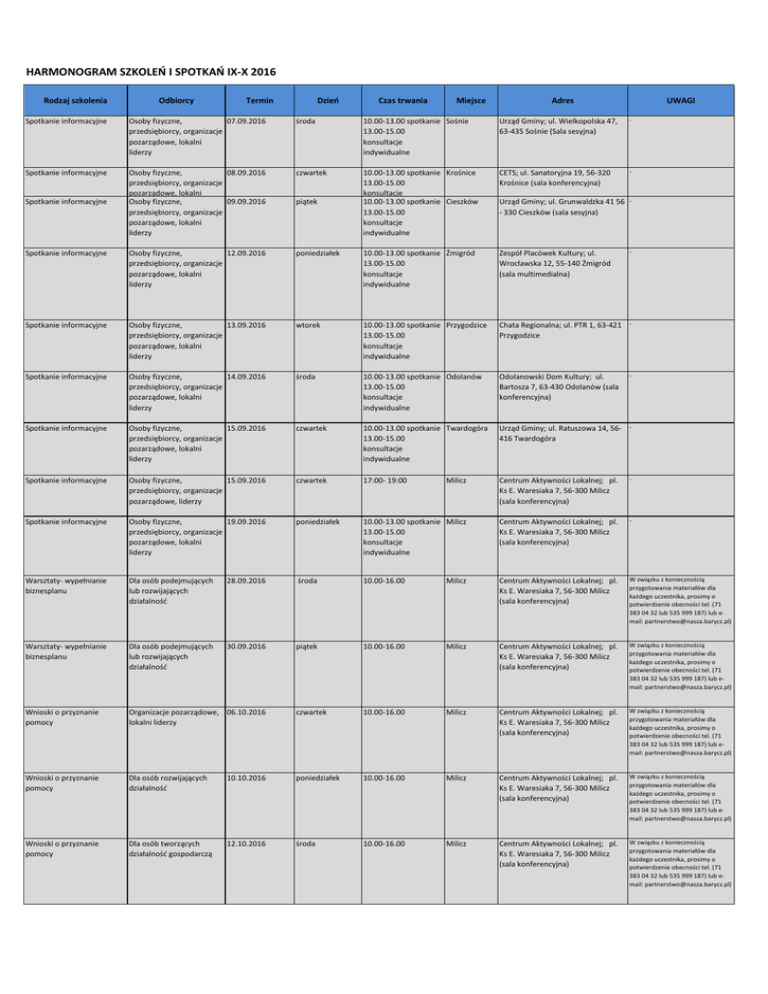 HARMONOGRAM SZKOLEŃ I SPOTKAŃ IX-X 2016 Rodzaj szkolenia Odbiorcy Termin Dzień Czas trwania Miejsce Adres UWAGI Spotkanie informacyjne Osoby fizyczne, 07.09.2016 przedsiębiorcy, organizacje pozarządowe, lokalni liderzy środa 10.00-13.00 spotkanie Sośnie 13.00-15.00 konsultacje indywidualne Urząd Gminy; ul. Wielkopolska 47, 63-435 Sośnie (Sala sesyjna) - Spotkanie informacyjne Osoby fizyczne, 08.09.2016 przedsiębiorcy, organizacje pozarządowe, lokalni Osoby fizyczne, 09.09.2016 przedsiębiorcy, organizacje pozarządowe, lokalni liderzy czwartek 10.00-13.00 spotkanie Krośnice 13.00-15.00 konsultacje 10.00-13.00 spotkanie Cieszków 13.00-15.00 konsultacje indywidualne CETS; ul. Sanatoryjna 19, 56-320 Krośnice (sala konferencyjna) - Spotkanie informacyjne Osoby fizyczne, 12.09.2016 przedsiębiorcy, organizacje pozarządowe, lokalni liderzy poniedziałek 10.00-13.00 spotkanie Żmigród 13.00-15.00 konsultacje indywidualne Zespół Placówek Kultury; ul. Wrocławska 12, 55-140 Żmigród (sala multimedialna) Spotkanie informacyjne Osoby fizyczne, 13.09.2016 przedsiębiorcy, organizacje pozarządowe, lokalni liderzy wtorek 10.00-13.00 spotkanie Przygodzice 13.00-15.00 konsultacje indywidualne Chata Regionalna; ul. PTR 1, 63-421 Przygodzice Spotkanie informacyjne Osoby fizyczne, 14.09.2016 przedsiębiorcy, organizacje pozarządowe, lokalni liderzy środa 10.00-13.00 spotkanie Odolanów 13.00-15.00 konsultacje indywidualne Odolanowski Dom Kultury; ul. Bartosza 7, 63-430 Odolanów (sala konferencyjna) Spotkanie informacyjne Osoby fizyczne, 15.09.2016 przedsiębiorcy, organizacje pozarządowe, lokalni liderzy czwartek 10.00-13.00 spotkanie Twardogóra 13.00-15.00 konsultacje indywidualne Urząd Gminy; ul. Ratuszowa 14, 56- 416 Twardogóra Spotkanie informacyjne Osoby fizyczne, 15.09.2016 przedsiębiorcy, organizacje pozarządowe, liderzy czwartek 17:00- 19:00 Milicz Centrum Aktywności Lokalnej; pl. Ks E. Waresiaka 7, 56-300 Milicz (sala konferencyjna) - Spotkanie informacyjne Osoby fizyczne, 19.09.2016 przedsiębiorcy, organizacje pozarządowe, lokalni liderzy poniedziałek 10.00-13.00 spotkanie Milicz 13.00-15.00 konsultacje indywidualne Centrum Aktywności Lokalnej; pl. Ks E. Waresiaka 7, 56-300 Milicz (sala konferencyjna) - Warsztaty- wypełnianie biznesplanu Dla osób podejmujących lub rozwijających działalność 28.09.2016 środa 10.00-16.00 Milicz Centrum Aktywności Lokalnej; pl. Ks E. Waresiaka 7, 56-300 Milicz (sala konferencyjna) W związku z koniecznością przygotowania materiałów dla każdego uczestnika, prosimy o potwierdzenie obecności tel. (71 383 04 32 lub 535 999 187) lub email: [email protected]) Warsztaty- wypełnianie biznesplanu Dla osób podejmujących lub rozwijających działalność 30.09.2016 piątek 10.00-16.00 Milicz Centrum Aktywności Lokalnej; pl. Ks E. Waresiaka 7, 56-300 Milicz (sala konferencyjna) W związku z koniecznością przygotowania materiałów dla każdego uczestnika, prosimy o potwierdzenie obecności tel. (71 383 04 32 lub 535 999 187) lub email: [email protected]) Wnioski o przyznanie pomocy Organizacje pozarządowe, 06.10.2016 lokalni liderzy czwartek 10.00-16.00 Milicz Centrum Aktywności Lokalnej; pl. Ks E. Waresiaka 7, 56-300 Milicz (sala konferencyjna) W związku z koniecznością przygotowania materiałów dla każdego uczestnika, prosimy o potwierdzenie obecności tel. (71 383 04 32 lub 535 999 187) lub email: [email protected]) Wnioski o przyznanie pomocy Dla osób rozwijających działalność 10.10.2016 poniedziałek 10.00-16.00 Milicz Centrum Aktywności Lokalnej; pl. Ks E. Waresiaka 7, 56-300 Milicz (sala konferencyjna) W związku z koniecznością przygotowania materiałów dla każdego uczestnika, prosimy o potwierdzenie obecności tel. (71 383 04 32 lub 535 999 187) lub email: [email protected]) Wnioski o przyznanie pomocy Dla osób tworzących działalność gospodarczą 12.10.2016 środa 10.00-16.00 Milicz Centrum Aktywności Lokalnej; pl. Ks E. Waresiaka 7, 56-300 Milicz (sala konferencyjna) W związku z koniecznością przygotowania materiałów dla każdego uczestnika, prosimy o potwierdzenie obecności tel. (71 383 04 32 lub 535 999 187) lub email: [email protected]) Spotkanie informacyjne piątek Urząd Gminy; ul. Grunwaldzka 41 56 - 330 Cieszków (sala sesyjna) - -