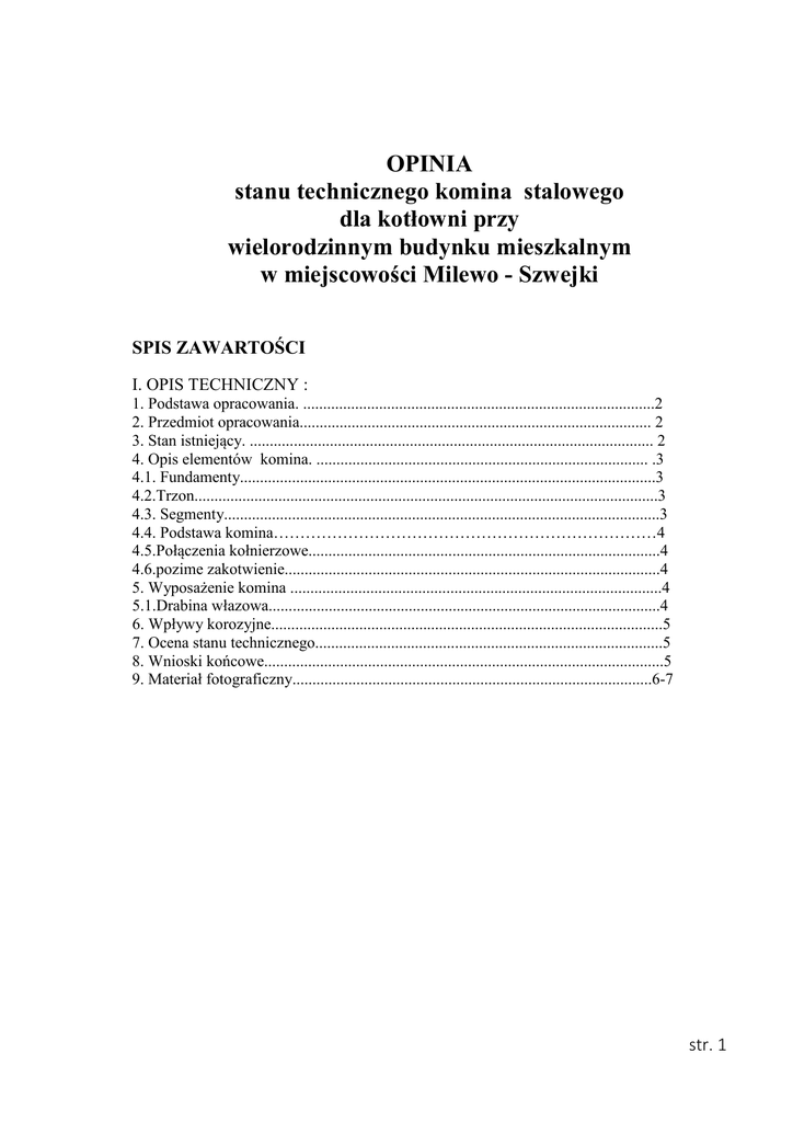 OPINIA stanu technicznego komina stalowego dla kotłowni przy wielorodzinnym budynku mieszkalnym w miejscowości Milewo - Szwejki SPIS ZAWARTOŚCI I. OPIS TECHNICZNY : 1. Podstawa opracowania. ........................................................................................2 2. Przedmiot opracowania........................................................................................ 2 3. Stan istniejący. ..................................................................................................... 2 4. Opis elementów komina. ................................................................................... .3 4.1. Fundamenty........................................................................................................3 4.2.Trzon....................................................................................................................3 4.3. Segmenty.............................................................................................................3 4.4. Podstawa komina………………………………………………………………4 4.5.Połączenia kołnierzowe........................................................................................4 4.6.pozime zakotwienie..............................................................................................4 5. Wyposażenie komina .............................................................................................4 5.1.Drabina włazowa..................................................................................................4 6. Wpływy korozyjne..................................................................................................5 7. Ocena stanu technicznego.......................................................................................5 8. Wnioski końcowe....................................................................................................5 9. Materiał fotograficzny..........................................................................................6-7 str. 1 OPIS TECHNICZNY 1. Podstawa opracowania. 1.1. Zlecenie Zamawiającego, 1.2. Oględziny i pomiary inwentaryzacyjne własne, 1.3. Informacje i uzgodnienia z Zamawiającym, 1.4. Przedmiotowa literatura techniczna i normy projektowania. 2. Przedmiot opracowania. Przedmiotem opracowania jest opinia w sprawie stanu technicznego konstrukcji komina stalowego, jednoprzewodowego, wolnostojącego, dla kotłowni przy budynku mieszkalnym wielorodzinnym w miejscowości Milewo - Szwejki Przedmiotowy komin stalowy o wysokości 21,0 m (Fot. 1, 2 i 3) składa się z 3 segmentów o średnicy wewnętrznej D = 600 mm. Komin wykonano z blachy ze stali St3SX. Przewód komina składa się z segmentów połączonych kołnierzowo na śruby, utwierdzony jest w fundamencie (Fot. 2) przy pomocy śrub fundamentowych zabetonowanych w cokole fundamentu, do których nakrętkami zamocowana jest płyta podstawy. 3. Stan istniejący. Na wstępie należy zaznaczyć, że przedmiotowy komin stalowy był eksploatowany przez innego użytkownika przez okres około 5 lat, następnie zdemontowany i złożony na placu przeleżał około 15 lat. Dla potrzeb kotłowni przy budynku mieszkalnym wielorodzinnym w Milewie - Szwejkach zamontowany został 3 lata temu (2012 r.). Inwestor nie posiada żadnej dokumentacji istniejącego komina. Na podstawie informacji uzyskanych od przedstawiciela użytkownika, terminu wykonania komina, oraz literatury technicznej przyjęto, że komin wykonano ze stali St3SX, z rur o średnicy 600 mm, grubości ścianki 8,0 mm. Dla trzonów kominów stalowych jednopowłokowych, wolnostojących lub z odciągiem minimalna grubość ścianki wynosi t ≥ 6 mm. Komin posadowiony jest na fundamencie wyprowadzonym około 50,0cm ponad dach kotłowni, oraz oddalony jest około 60 cm od zewnętrznego lica ściany szczytowej budynku mieszkalnego fot. 1, 2, i 3. str. 2 Trzon nośny komina oparty jest dołem na fundamencie, a wyżej, w poziomie stropu nad I piętrem, podparty poziomo na zamocowanych w wieńcu ściany szczytowej budynku mieszkalnego wspornikach fot 2 i 3. 4. Opis elementów komina. 4.1. Fundament. Pod komin wykonano fundament w postaci bloku żelbetowego wyprowadzonego około 50 cm powyżej poziomu dachu kotłowni fot. 2. W trzonie fundamentu wykonany jest pionowy przewód oraz boczny otwór dla zamocowania czopucha i odprowadzenia spalin od kotłów. Stan techniczny bloku fundamentowego ocenia się jako średni, nie stwierdzono występowania widocznych rys czy pęknięć, stwierdzono niewielkie uszkodzenia zewnętrznych płaszczyzn. 4.2. Trzon komina. Trzon komina jest jednopowłokowy, bez izolacji termicznej i składa się z 3 segmentów, o długości około 8,0, 7,0 i 6,0 m, wykonanych ze stali St3SX o grubości 8 mm fot. 1, 3. Poszczególne elementy trzonu połączone są ze sobą za pomocą śrub w tzw. połączeniu kołnierzowym. 4.3. Segmenty komina. Segment dolny komina o długości ~ 8,0 m u góry zakończony jest kołnierzem stalowym do połączeń śrubowych, dołem przyspawany jest do płyty podstawy. Kołnierz stalowy i płyta podstawy do połączenia z fundamentem, wzmocnione są pionowymi żebrami przyspawanymi do płaszcza segmentu i odpowiednio do kołnierza i płyty podstawy. Segment dolny, na wysokości około 6,0 m posiada otwór wykorzystywany u poprzedniego użytkownika, do podłączenia czopucha. W ramach przystosowania do aktualnych warunków odcięto żebra wzmacniające otwór i zaspawano go wyprofilowanym elementem z blachy. Segmenty pośredni i górny o długości ~ 7,0 i 6,0 m zakończone są przyspawanymi kołnierzami do połączeń śrubowych. Stan techniczny segmentów komina ocenia się jako niżej średni – dla segmentu dolnego i średni dla pozostałych, stwierdzono widoczne skorodowanie zewnętrznej płaszczyzny oraz strefy połączeń. Niezależnie od powyższego niewłaściwie zabezpieczono spoiny przyspawanego elementu w miejscu otworu dla podł