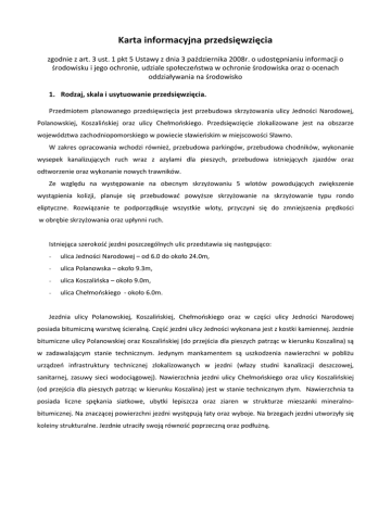 Karta informacyjna przedsięwzięcia zgodnie z art. 3 ust. 1 pkt 5 Ustawy z dnia 3 października 2008r. o udostępnianiu informacji o środowisku i jego ochronie, udziale społeczeństwa w ochronie środowiska oraz o ocenach oddziaływania na środowisko 1. Rodzaj, skala i usytuowanie przedsięwzięcia. Przedmiotem planowanego przedsięwzięcia jest przebudowa skrzyżowania ulicy Jedności Narodowej, Polanowskiej, Koszalińskiej oraz ulicy Chełmońskiego. Przedsięwzięcie zlokalizowane jest na obszarze województwa zachodniopomorskiego w powiecie sławieńskim w miejscowości Sławno. W zakres opracowania wchodzi również, przebudowa parkingów, przebudowa chodników, wykonanie wysepek kanalizujących ruch wraz z azylami dla pieszych, przebudowa istniejących zjazdów oraz odtworzenie oraz wykonanie nowych trawników. Ze względu na występowanie na obecnym skrzyżowaniu 5 wlotów powodujących zwiększenie wystąpienia kolizji, planuje się przebudować powyższe skrzyżowanie na skrzyżowanie typu rondo eliptyczne. Rozwiązanie te podporządkuje wszystkie wloty, przyczyni się do zmniejszenia prędkości w obrębie skrzyżowania oraz upłynni ruch. Istniejąca szerokość jezdni poszczególnych ulic przedstawia się następująco: - ulica Jedności Narodowej – od 6.0 do około 24.0m, - ulica Polanowska – około 9.3m, - ulica Koszalińska – około 9.0m, - ulica Chełmońskiego - około 6.0m. Jezdnia ulicy Polanowskiej, Koszalińskiej, Chełmońskiego oraz w części ulicy Jedności Narodowej posiada bitumiczną warstwę ścieralną. Część jezdni ulicy Jedności wykonana jest z kostki kamiennej. Jezdnie bitumiczne ulicy Polanowskiej oraz Koszalińskiej (do przejścia dla pieszych patrząc w kierunku Koszalina) są w zadawalającym stanie technicznym. Jedynym mankamentem są uszkodzenia nawierzchni w pobliżu urządzeń infrastruktury technicznej zlokalizowanych w jezdni (włazy studni kanalizacji deszczowej, sanitarnej, zasuwy sieci wodociągowej). Nawierzchnia jezdni ulicy Chełmońskiego oraz ulicy Koszalińskiej (od przejścia dla pieszych patrząc w kierunku Koszalina) jest w stanie technicznym złym. Nawierzchnia ta posiada liczne spękania siatkowe, ubytki lepiszcza oraz ziaren w strukturze mieszanki mineralnobitumicznej. Na znaczącej powierzchni jezdni występują łaty oraz wyboje. Na brzegach jezdni utworzyły się koleiny strukturalne. Jezdnie utraciły swoją równość poprzeczną oraz podłużną. Numery działek ewidencyjnych, na którym planuje się przebudowę skrzyżowania: Dz. nr 694, 948, 859/12, 845/2, 889/6, 890/2, 891/1, 949/1, 904/1, 904/2, 1361, obręb 002 m. Sławno. Zakres przedsięwzięcia obejmuje: Na terenie przebudowywanego skrzyżowania przewiduje się następujący zakres robót: - rozbiórkę istniejącej nawierzchni jezdni, chodników, parkingów, - wycinka drzew, - wykonanie pełnej konstrukcji jezdni ronda oraz wlotów poszczególnych ulic, - przebudowa zjazdów, - przebudowa chodników, - wykonanie wysepek kanalizujących wraz z azylami dla pieszych, - wykonanie trawników, - wykonanie pierścienia ronda, - wykonanie oznakowania poziomego i pionowego, - przebudowa kanalizacji deszczowej, - usunięcie kolizji z siecią infrastruktury technicznej. 2. Powierzchnia zajmowanej nieruchomości, a także obiektu budowlanego oraz dotychczasowym sposobie ich wykorzystywania i pokrycie nieruchomości szatą roślinną. Powierzchnie nieruchomości Poniżej zestawiono przewidywane utwardzone powierzchnie poszczególnych elementów drogi z przewidywanym rodzajem nawierzchni: jezdnia - nawierzchnia bitumiczna: 994 m2 jezdnia - nawierzchnia z kostki kamiennej 507 m2 chodnik - nawierzchnia z kostki betonowej: 1653 m2 zatoki postojowe- nawierzchnia z kostki kamiennej: 202 m2 zieleń: 736 m2 Przedmiotowe skrzyżowanie w/w ulic zlokalizowane jest w liniach rozgraniczających dróg publicznych. Ze względu na nieczytelny układ komunikacyjny, sprzyjający powstawaniu kolizji oraz stan technicznych dróg wlotowych zachodzi konieczność przebudowy skrzyżowania. W chwili obecnej skrzyżowane stanowi połączenie dróg o charakterze tranzytowym (ul. Polanowska oraz Koszalińska na kierunku Polanów - Darłowo - Słupsk) oraz o charakterze lokalnym (ul. Jedności Narodowej i ul. Chełmońskiego). Skrzyżowanie to pełni funkcję komunikacyjną dla ruchu pojazdów i pieszych. Istniejące wloty dróg krzyżujący się na całym odcinku, objętym inwestycją, posiada nawierzchnię utwardzoną. Jej stan techniczny jest niedostateczny. Liczne zapadnięcia, wyboje, dziury znacznie utrudniają ruch, a nawet mogą być niebezpieczne, dla użytkowników drogi. Powierzchnia drogi jest nierówna i zdeformowana , a spadki są nieregularne. Zły stan nawierzchni niekorzystnie wpływa również na komfort jazdy i walory estetyczne miejsca sąsiadującego do skrzyżowania. Zjazdy na pobliskie działki i na posesje wykonane są z kostki betonowej ich stan można określić jako zadawalający. W pasie drogowym występuje zadrzewienie, zlokalizowane na wysepce centralnej skrzyżowania oraz na terenach zielonych. Poza tym w obrębie projektowanego przedsięwzięcia mamy do czynienia raczej z roślinnością niską (trawy oraz żywopłoty). W trakcie realizacji planowanego przedsięwzięcia przewiduje się wycinkę drzew przydrożnych, kolidujących z planowaną przebudową oraz zagrażających ruchowi drogowemu, z uwagi na skrajnię i widoczność, a także ze względu na niszczenie konstrukcji jezdni przez system korzeniowy drzew. Konieczna będzie również wycinka krzewów. Przed przystąpieniem do prac budowlanych wykonawca robót zobligowany zostanie chronić pozostały drzewostan przed uszkodzeniem w czasie robót. 3. Rodzaj technologii Inwestycja polegać będzie na przebudowie istniejącego skrzyżowania ulicy Polanowskiej, Koszalińskiej, Jedności Narodowej oraz Chełmońskiego. W zdecydowanej większości inwestycja będzie miała charakter przebudowy w pasie drogowym. 