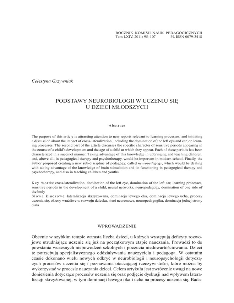ROCZNIK KOMISJI NAUK PEDAGOGICZNYCH Tom LXIV, 2011: 95–107 PL ISSN 0079-3418 Celestyna Grzywniak PODSTAWY NEUROBIOLOGII W UCZENIU SIĘ U DZIECI MŁODSZYCH Abstract The purpose of this article is attracting attention to new reports relevant to learning processes, and initiating a discussion about the impact of cross-lateralization, including the domination of the left eye and ear, on learning processes. The second part of the article discusses the specific character of sensitive periods appearing in the course of a child’s development and the age of a child at which they appear. Each of these periods has been characterized in a succinct manner. Taking advantage of this knowledge in upbringing and teaching children, and, above all, in pedagogical therapy and psychotherapy, would be important in modern school. Finally, the author proposed creating a new sub-discipline of pedagogy, called neuropedagogy, which would be dealing with taking advantage of the knowledge of brain stimulation and its functioning in pedagogical therapy and psychotherapy, and also in teaching children and youths. K e y w o r d s: cross-lateralization, domination of the left eye, domination of the left ear, learning processes, sensitive periods in the development of a child, neural networks, neuropedagogy, domination of one side of the body S ł o w a k l u c z o w e: lateralizacja skrzyżowana, dominacja lewego oka, dominacja lewego ucha, procesy uczenia się, okresy wrażliwe w rozwoju dziecka, sieci neuronowe, neuropedagogika, dominacja jednej strony ciała WPROWADZENIE Obecnie w szybkim tempie wzrasta liczba dzieci, u których występują deficyty rozwojowe utrudniające uczenie się już na początkowym etapie nauczania. Prowadzi to do powstania wczesnych niepowodzeń szkolnych i poczucia niedowartościowania. Dzieci te potrzebują specjalistycznego oddziaływania nauczyciela i pedagoga. W ostatnim czasie dokonano wielu nowych odkryć w neurobiologii i neuropsychologii dotyczących procesów uczenia się i poznawania otaczającej rzeczywistości, które można by wykorzystać w procesie nauczania dzieci. Celem artykułu jest zwrócenie uwagi na nowe doniesienia dotyczące procesów uczenia się oraz podjęcie dyskusji nad wpływem lateralizacji skrzyżowanej, w tym dominacji lewego oka i ucha na procesy uczenia się. Bada- 96 Celestyna Grzywniak nia A. Tomatisa i K. Johansena pokazują, że dominacja ucha pełni ważną rolę w nauce pisania, czytania, koncentracji i rozwoju mowy oraz emocji. W drugiej części artykułu omówione zostaną okresy wrażliwe w rozwoju dziecka, podana zostanie ich definicja, specyfika i wiek dziecka, w jakim się pojawiają. Wykorzystanie tej wiedzy w wychowaniu i uczeniu dzieci, a przede wszystkim w terapii pedagogicznej i psychoterapii byłoby ważne w nowoczesnej szkole. Na zakończenie autorka proponuje utworzenie nowej subdyscypliny w pedagogice zwanej neuropedagogiką, która zajmowałaby się wykorzystywaniem wiedzy o stymulacji mózgu i jego funkcjonowaniu w terapii pedagogicznej i psychoterapii oraz w nauczaniu dzieci i młodzieży. 1. ROLA LATERALIZACJI JEDNORODNEJ I SKRZYŻOWANEJ W PROCESIE UCZENIA SIĘ Problem lateralizacji opisał już w swojej koncepcji A. Łuria. Lateralizacja — inaczej „stronność” — to asymetria czynnościowa prawej i lewej strony ciała ludzkiego, która wynika z różnic w budowie i funkcjach obu półkul mózgowych. Wyraża się np. większą sprawnością ruchową prawych kończyn od lewych, a także rejestrowaniem przez mózg większej liczby bodźców zmysłowych z prawej strony ciała. Dziecko przychodzi na świat z pewnym przekazem genetycznym dotyczącym między innymi lateralizacji. Dziedziczy pewien typ dominacji po rodzicach lub dziadkach zgodnie z prawem Mendla. Lateralizacja ujawnia się stopniowo i jest postępującym procesem, kształtującym się wraz z wiekiem i ogólnym rozwojem ruchowym dziecka. Za określoną stronność ciała odpowiada przeciwległa półkula mózgowa. Wiedza na ten temat została rozwinięta poprzez liczne eksperymenty różnych naukowców, a zwłaszcza przez R. Sperego i jego zespół. Pomiędzy półkulami mózgowymi występuje niewielkie zróżnicowanie strukturalne i anatomiczne, ale półkule różnią się pod względem pełnionych funkcji. Względem siebie pełnią rolę dopełniającą i uzupełniającą. Półkula lewa u 96% osób praworęcznych zawiera ośrodki mowy, rozumienia mowy i jej nadawania i jest dominująca. Ma związek ze świadomością i logiką, dokonuje analiz, prostych obliczeń matematycznych. Daje bezzwłoczne odpowiedzi słowne i kontroluje funkcje wykonawcze. Lewa półkula odbiera i odpowiada na jeden bodziec. Półkula niedominująca jest związana głównie z wyobraźnią przestrzenną, postrzeganiem trójwymiarowym i wyobraźnią niewerbalną wykorzystywaną podczas malowania, tworzenia muzyki i poezji. Prawa półkula nie wykazuje związku ze świadomością, a poprzez większe połączenia z układem limbicznym specjalizuje się również w emocjach oraz działaniach potrzebnych do przeżycia w stanach zagrożenia, lustruje otoczenie i decyduje, kiedy przenieść uwagę na bodziec, który stał się ważny. Rozpoznaje także nastrój oraz melodię i ton emocjonalny zawarty w głosie. Często lewa półkula nazywana jest półkulą językową, komunikatywną, racjonalną, czyli opiera się na logicznym myśleniu, analityczną i linijną co znaczy, że dokonuje analizy dostarczonego materiału krok po kroku, podczas gdy prawa jest artystyczna, emocjonalna, przestrzenna, holistyczna, a więc ujmuje bodźce w pewną całość, dokonuje wglądu oraz przebiegają w niej procesy intuicji1. Dominacji podlega także zmysł wzroku, słuchu oraz motoryka A. K ę d z i a, Budowa i funkcje układu nerwowego, [w:] Neurokinezjologiczna diagnostyka i terapia dzieci z zaburzeniami rozwoju psychoruchowego, red. L. Sadowska, Wydawnictwo AWF, Wrocław 2001; 1 Podstawy neurobiologii