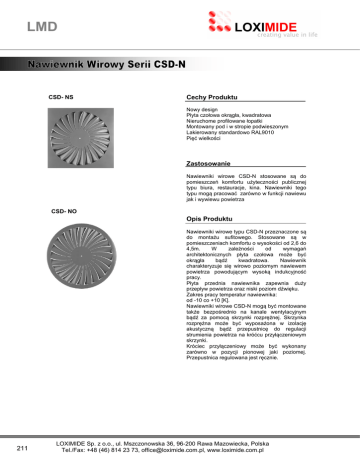 LMD CSD- NS Cechy Produktu Nowy design Płyta czołowa okrągła, kwadratowa Nieruchome profilowane łopatki Montowany pod i w stropie podwieszonym Lakierowany standardowo RAL9010 Pięć wielkości Zastosowanie Nawiewniki wirowe CSD-N stosowane są do pomieszczeń komfortu użyteczności publicznej typu biura, restauracje, kina. Nawiewniki tego typu mogą pracować zarówno w funkcji nawiewu jak i wywiewu powietrza CSD- NO Opis Produktu Nawiewniki wirowe typu CSD-N przeznaczone są do montażu sufitowego. Stosowane są w pomieszczeniach komfortu o wysokości od 2,6 do 4,5m. W zależności od wymagań architektonicznych płyta czołowa może być okrągła bądź kwadratowa. Nawiewnik charakteryzuje się wirowo poziomym nawiewem powietrza powodującym wysoką indukcyjność pracy. Płyta przednia nawiewnika zapewnia duży przepływ powietrza oraz niski poziom dźwięku. Zakres pracy temperatur nawiewnika: od -10 co +10 [K]. Nawiewniki wirowe CSD-N mogą być montowane także bezpośrednio na kanale wentylacyjnym bądź za pomocą skrzynki rozprężnej. Skrzynka rozprężna może być wyposażona w izolację akustyczną bądź przepustnicę do regulacji strumienia powietrza na króćcu przyłączeniowym skrzynki. Króciec przyłączeniowy może być wykonany zarówno w pozycji pionowej jaki poziomej. Przepustnica regulowana jest ręcznie. 211 LOXIMIDE Sp. z o.o., ul. Mszczonowska 36, 96-200 Rawa Mazowiecka, Polska Tel./Fax: +48 (46) 814 23 73, [email protected], www.loximide.com.pl 211 LMD Materiał, Wykończenie CSD - NS Panel nawiewnika CSD-N wykonany jest z blachy stalowej, pomalowanej metodą proszkową. Skrzynka rozprężna i przepustnica wykonane są z blachy stalowej ocynkowanej. Opcjonalnie istnieje możliwość wykonania z blachy nierdzewnej lub aluminiowej. Płyta czołowa nawiewnika standardowo malowana jest na kolor biały RAL9010 jednakże może być wykonana w dowolnym kolorze z palety RAL. CSD - NO Instalacja, Konserwacja Nawiewniki wirowe CSD-N mogą być montowane do skrzynek rozprężnych za pomocą czterech śrub na obwodzie nawiewnika, bądź za pomocą jednej centralnej śruby po środku. Jednakże w przypadku montażu dużych rozmiarów płyt nawiewnika zalecany jest montaż przy użyciu czterech śrub. Przepustnica na króćcu przyłączeniowym regulowana jest od zewnątrz. Skrzynka rozprężna montowana jest do sufitu za pomocą prętów i w przypadku wersji izolowanej, jest izolowana od wewnątrz. Zaleca się konserwacje i czyszczenia nawiewnika kawałkiem materiału bądź odkurzaczem. Wielkość 300 400 500 600 625 212 ∅A [mm] 260 340 440 530 530 BxB [mm] 298 398 498 598 623 ∅B [mm] 298 398 498 598 623 H [mm] 12 12 12 12 12 Aeff 2 [m ] 0,0108 0.0193 0,0280 0,0400 0,0400 LOXIMIDE Sp. z o.o., ul. Mszczonowska 36, 96-200 Rawa Mazowiecka, Polska Tel./Fax: +48 (46) 814 23 73, [email protected], www.loximide.com.pl 212 LMD Szybki Dobór Dobór Szczegółowy 3 Strumień powietrza [m /h], zasięg strumienia [m], spadek ciśnienia [Pa], poziom hałasu [dB(A)] Wielkość 3 VQ [m /h] 300 400 500 600 625 Vmin Vmax Vmin Vmax Vmin Vmax Vmin Vmax Vmin Vmax [m3/h] [m3/h] [m3/h] [m3/h] [m3/h] [m3/h] [m3/h] [m3/h] [m3/h] [m3/h] 110 350 140 540 250 640 360 900 360 900 ∆Pa LWA [Pa] 7 68 8 59 8 50 8 54 8 54 [dB(A)] <20 50 <20 46 <20 46 20 48 20 48 L0,2 [m] 1,5 4,2 1,2 4,6 1,8 4,5 2,5 5,4 2,5 5,4 - dane dla nawiewnika z skrzynką rozprężną 213 LOXIMIDE Sp. z o.o., ul. Mszczonowska 36, 96-200 Rawa Mazowiecka, Polska Tel./Fax: +48 (46) 814 23 73, [email protected], www.loximide.com.pl 213 LMD Dobór Szczegółowy 3 Strumień powietrza [m /h], spadek ciśnienia [Pa], poziom hałasu [dB(A)] CSD-N 300 CSD-N 400 214 LOXIMIDE Sp. z o.o., ul. Mszczonowska 36, 96-200 Rawa Mazowiecka, Polska Tel./Fax: +48 (46) 814 23 73, [email protected], www.loximide.com.pl 214 LMD Dobór Szczegółowy 3 Strumień powietrza [m /h], spadek ciśnienia [Pa], poziom hałasu [dB(A)] CSD-N 300 CSD-N 600, 625 215 LOXIMIDE Sp. z o.o., ul. Mszczonowska 36, 96-200 Rawa Mazowiecka, Polska Tel./Fax: +48 (46) 814 23 73, [email protected], www.loximide.com.pl 215 LMD Wymiary skrzynki dla CSD-N PB(T) Model LxL [mm] SxS [mm] H [mm] ØS [mm] PB(T) 400x400 360x360 390x390 300 198 PB(T) 500x500 460x460 490x490 300 198 PB(T) 600x600 560x560 590x590 350 248 PB(T) 625x625 585x585 615x615 350 248 PB(S) 400x400 360x360 390x390 300 198 PB(S) 500x500 460x460 490x490 300 198 PB(S) 600x600 560x560 590x590 350 248 PB(S) 625x625 585x585 615x615 350 248 PB(S) SxS – wymiar uwzględniający izolację BxB – wymiar nawiewnika - patrz nawiewnik OZNACZENIA 3 Q – strumień powietrza [m /h] Vf – prędkość strumienia na nawiewniku L0,2 – zasięg poziomy strumienia [m] Lw – poziom mocy akustycznej [dB(A)] ∆P – spadek ciśnienia [Pa] 216 LOXIMIDE Sp. z o.o., ul. Mszczonowska 36, 96-200 Rawa Mazowiecka, Polska Tel./Fax: +48 (46) 814 23 73, [email protected], www.loximide.com.pl 216 LMD KOD ZAMÓWIENIA Nawiewnik CSD-N - aa - bbb - ccc Typ -S -O Wymiar 300 400 500 600 625 Kolor RAL9010 Skrzynka rozprężna PB - a - bbb - c - d - e Typ S – kwadratowy O - okrągła Wymiar króćca (100…..315) Typ króćca T - górny, S - boczny Przepustnica O - bez przepustnicy, D - z przepustnicą Izolacja O - bez izolacji, I - z izolacją PRZYKŁAD ZAMÓWIENIA 217 CSD-NS 500-RAL9016 PB-S-250-O-O LOXIMIDE Sp. z o.o., ul. Mszczonowska 36, 96-200 Rawa Mazowiecka, Polska Tel./Fax: +48 (46) 814 23 73, [email protected], www.loximide.com.pl 217