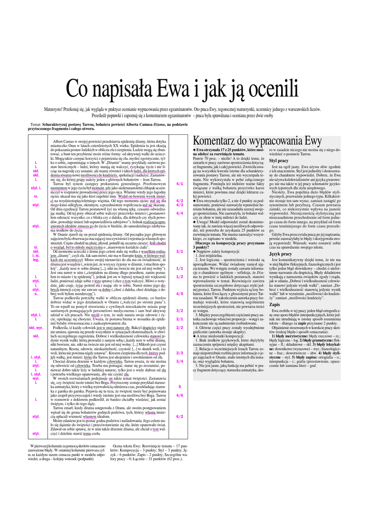 Co napisała Ewa i jak ją ocenili Maturzysto! Przekonaj się, jak wygląda w praktyce ocenianie wypracowania przez egzaminatorów. Oto praca Ewy, tegorocznej maturzystki, uczennicy jednego z warszawskich liceów. Prześledź poprawki i zapoznaj się z komentarzem egzaminatorów – praca była sprawdzana i oceniana przez dwie osoby Temat: Scharakteryzuj postawę Tarrou, bohatera powieści Alberta Camusa Dżuma, na podstawie przytoczonego fragmentu i całego utworu. i. i. skł. skł. i. styl. i. rz. styl. styl. rz. skł. i. rz. log. i. styl. i. styl. o. styl. i. i. skł. wyr. skł. i. styl. i. styl. i. i. styl. wyr. i. i. styl. styl. Albert Camus w swojej powieści przedstawia epidemię dżumy, która dotyka miasteczko Oran w latach czterdziestych XX wieku. Epidemia ta jest okazją do pokazania postaw ludzkich w obliczu zła i cierpienia. Ludzie mogą się zbuntować, a bunt ten przybierać może różne formy: od aktywnej walki do ucieczki. Mogą także czerpać korzyści z pojawienia się zła, myśleć egoistycznie, tylko o sobie, zapominając o innych. W „Dżumie” mamy przykłady zarówno postaw heroicznych – ludzi, którzy starają się walczyć, ryzykując życie i nie licząc na nagrodę czy uznanie, ale mamy również i takich ludzi, dla których epidemia stwarza nowe możliwości do kradzieży, spekulacji i nadużyć. Zastanówmy się, do której grupy należy jeden z głównych bohaterów – Jean Tarrou. Tarrou był synem zastępcy prokuratora generalnego. Przełomowym momentem w jego życiu był moment, gdy jako siedemnastoletni chłopak uczestniczył w rozprawie prowadzonej przez jego ojca. Właśnie wtedy jego łagodny ojciec ukazał mu się jako ktoś zupełnie inny. Wydał on bowiem wyrok śmierci na trzydziestopięcioletniego więźnia. Od tego momentu ojciec stał się dla niego kimś odległym, okrutnym, a przedmiotem współczucia stał się skazany. Od dnia egzekucji Tarrou postanowił żyć na własną rękę, czasami odwiedzając matkę. Od tej pory obiecał sobie walczyć przeciwko śmierci („postanowiłem odrzucić wszystko, co z bliska czy z daleka, dla dobrych czy złych powodów, powoduje śmierć lub usprawiedliwia zabójstwo”). Jednak realizacja upragnionych ideałów zmusza go do życia w biedzie, do samodzielnego zdobywania środków do życia. W Oranie zjawił się on przed epidemią dżumy. Od początku jego głównym zajęciem była obserwacja otaczającej rzeczywistości i rejestracja własnych spostrzeżeń. Często chodził na plażę, pływał, potrafił się szczerze cieszyć. Jeśli chodzi o wygląd, był to młody mężczyzna o „masywnym kształcie ciała”. Od momentu ucieczki z domu jego celem stała się walka z wszelkim rodzajem „dżumy”, czyli zła. Jak sam mówi, nie ma w Europie kraju, w którego walkach nie uczestniczył. Mimo swojej nienawiści do zła ma on świadomość, że dżuma jest wszędzie („wiem już, że wszyscy żyjemy w dżumie, i straciłem spokój”, „każdy nosi w sobie dżumę […], nikt na świecie nie jest od niej wolny”). Jest ona nawet w nim („cierpiałem na dżumę długo przedtem, zanim poznałem to miasto i tę epidemię”), jednak jest on w lepszej sytuacji niż większość ludzi, ponieważ zdaje sobie z tego sprawę i chce z tym walczyć. Mówi o wstydzie, jaki czuje, żyjąc pośród zła i mając zło w sobie. Nawet mimo jego dobrych intencji czyny nie zawsze są dobre („choć z daleka, choć działając z dobrej woli byłem mordercom”). Tarrou podkreśla potrzebę walki w obliczu epidemii dżumy, co bardzo dobrze widać w jego działaniach w Oranie („walczyć po stronie pana”). To on wpadł na pomysł stworzenia z cywilnych mieszkańców miasta grup sanitarnych pomagających personelowi medycznemu i sam brał aktywny udział w ich pracach. Nie myśli o tym, że stale naraża swoje zdrowie i życie, opiekując się chorymi. Uważa, że postawa bierna w stosunku do epidemii byłaby równoznaczna z zaakceptowaniem zła. Podkreśla, iż każdy człowiek jest w swej naturze zły. Bakcyl drapieżcy nigdy nie umiera, ujawnia się przede wszystkim w sytuacjach ekstremalnych, w chwilach szczególnego zagrożenia. Dobroć i wielkoduszność człowieka stanowi jedynie wynik walki, którą prowadzi z samym sobą („każdy nosi w sobie dżumę, nikt bowiem, nie, nikt na świecie nie jest od niej wolny. […] Mikrob jest czymś naturalnym. Reszta, zdrowie, nieskazitelność, czystość [...] to skutek woli, i to woli, która nie powinna nigdy ustawać”. Kresem cierpienia dla tych, którzy podjęli walkę, jest śmierć, która dla Tarrou jest ukojeniem i uwolnieniem od zła. Chociaż dżuma drzemie w każdym człowieku, Tarrou uważa, że nie można się odwrócić od człowieka. Trzeba mu pomagać, starać się go zrozumieć, ponieważ dobro także leży w ludzkiej naturze, tylko jest o wiele słabsze od zła i potrzeba wielkiego opanowania, aby nie czynić zła. W swoich rozważaniach podejmuje on także temat świętości. Zastanawia się, czy świętość może istnieć bez Boga. Przytoczony zostaje przykład staruszka astmatyka, który z wielką wytrwałością odmierza czas, przekładając ziarenka z garnka do garnka. Pojawia się tu teza, że świętość może być pojmowana jako zespół przyzwyczajeń i wtedy istotnie jest ona możliwa bez Boga. Tarrou w rozmowie z doktorem podkreślił, że bardzo chciałby wiedzieć, jak zostać świętym, i tylko do tego dąży. Tarrou zmarł, kiedy dżuma ustępowała z Oranu, ale swoim postępowaniem wpisał się do grona bohaterów godnych podziwu, tych, którzy własną śmiercią opłacali wierność własnym ideałom. Moim zdaniem jest to postać godna podziwu i naśladowania. Jego celem stało się dążenie do świętości i przeciwstawienie się złu, które opanowało świat. Zdawał on sobie sprawę, że w nim także drzemie dżuma, ale chciał z tym walczyć i dzielnie stawić temu czoła. W pierwszej kolumnie za pomocą skr