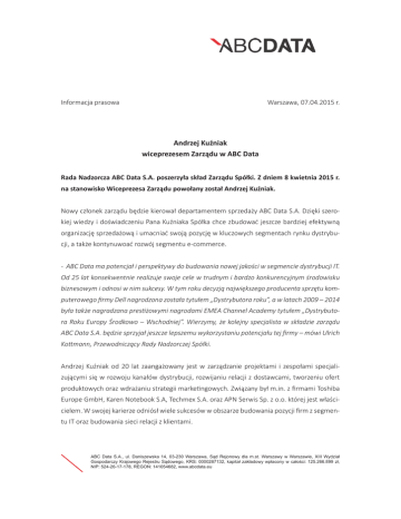 Informacja prasowa Warszawa, 07.04.2015 r. Andrzej Kuźniak wiceprezesem Zarządu w ABC Data Rada Nadzorcza ABC Data S.A. poszerzyła skład Zarządu Spółki. Z dniem 8 kwietnia 2015 r. na stanowisko Wiceprezesa Zarządu powołany został Andrzej Kuźniak. Nowy członek zarządu będzie kierował departamentem sprzedaży ABC Data S.A. Dzięki szerokiej wiedzy i doświadczeniu Pana Kuźniaka Spółka chce zbudować jeszcze bardziej efektywną organizację sprzedażową i umacniać swoją pozycję w kluczowych segmentach rynku dystrybucji, a także kontynuwoać rozwój segmentu e-commerce. - ABC Data ma potencjał i perspektywy do budowania nowej jakości w segmencie dystrybucji IT. Od 25 lat konsekwentnie realizuje swoje cele w trudnym i bardzo konkurencyjnym środowisku biznesowym i odnosi w nim sukcesy. W tym roku decyzją największego producenta sprzętu komputerowego firmy Dell nagrodzona została tytułem „Dystrybutora roku”, a w latach 2009 – 2014 była także nagradzana prestiżowymi nagrodami EMEA Channel Academy tytułem „Dystrybutora Roku Europy Środkowo – Wschodniej”. Wierzymy, że kolejny specjalista w składzie zarządu ABC Data S.A. będzie sprzyjał jeszcze lepszemu wykorzystaniu potencjału tej firmy – mówi Ulrich Kottmann, Przewodniczący Rady Nadzorczej Spółki. Andrzej Kuźniak od 20 lat zaangażowany jest w zarządzanie projektami i zespołami specjalizującymi się w rozwoju kanałów dystrybucji, rozwijaniu relacji z dostawcami, tworzeniu ofert produktowych oraz wdrażaniu strategii marketingowych. Związany był m.in. z firmami Toshiba Europe GmbH, Karen Notebook S.A, Techmex S.A. oraz APN Serwis Sp. z o.o. której jest właścicielem. W swojej karierze odniósł wiele sukcesów w obszarze budowania pozycji firm z segmentu IT oraz budowania sieci relacji z klientami. ABC Data S.A., ul. Daniszewska 14, 03-230 Warszawa, Sąd Rejonowy dla m.st. Warszawy w Warszawie, XIII Wydział Gospodarczy Krajowego Rejestru Sądowego, KRS: 0000287132, kapitał zakładowy wpłacony w całości: 125.266.899 zł, NIP: 524-26-17-178, REGON: 141054682, www.abcdata.eu - Zarząd Spółki ABC Data w nowym składzie działa od początku br. Postawiliśmy sobie wiele ambitnych celów. Pracujemy nad pozyskaniem nowych partnerów i wzbogaceniem naszej oferty o nowe marki. Budowanie długotrwałych relacji z Vendorami i Resellerami oparte jest na reputacji firmy, ale także na doskonałych umiejętnościach ludzi zaangażowanych w ten proces. Bardzo cenimy sobie nasz zespół, mamy pewność, że pod opieką kogoś tak doświadczonego jak Pan Andrzej Kuźniak będzie on jeszcze skuteczniejszy. Serdecznie witamy go w naszym gronie. Nasza wspólna praca będzie pełna wyzwań, ale także zapewni wiele powodów do satysfakcji – powiedziała Ilona Weiss, Prezes Zarządu ABC Data. Andrzej Kuźniak od 2012 roku zarządzał spółką APN Serwis, której jest także właścicielem, przez sześć lat do 2011 roku był Regional General Managerem w firmie Toshiba Europe GmbH rozwijając dział biznesowy firmy i odpowiadając zarówno za rozwój struktur w Polsce, Czechach, Węgrzech i Słowacji, a potem także na Litwie, Łotwie i w Estonii. W latach 2002-2005 pełnił funkcję Dyrektora Sprzedaży, a później Prezesa Zarządu Karen Notebook S.A. rozwijając sieć sklepów i wewnętrznych systemów zarządzania firmy. Od 1995 r. do 2002 r. związany był z Techmex S.A. zajmując się m.in. rozwojem kanałów dilerów i pozyskiwaniem nowych dostawców produktów w sektorze dystrybucji komputerów przenośnych w Polsce. Jest absolwentem Wydziału Górnictwa i Geologii Politechniki Śląskiej. Osoba do kontaktu: Agnieszka Forasińska ABC Data S.A. [email protected] +48 22 591 67 83 ABC Data S.A., ul. Daniszewska 14, 03-230 Warszawa, Sąd Rejonowy dla m.st. Warszawy w Warszawie, XIII Wydział Gospodarczy Krajowego Rejestru Sądowego, KRS: 0000287132, kapitał zakładowy wpłacony w całości: 125.266.899 zł, NIP: 524-26-17-178, REGON: 141054682, www.abcdata.eu