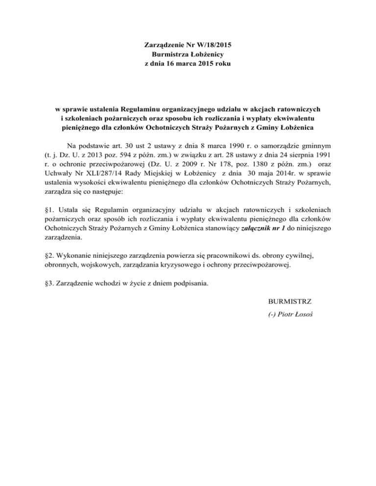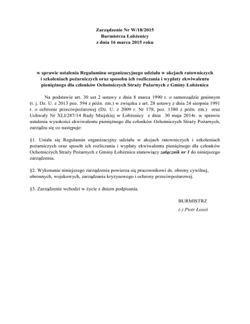 Zarządzenie Nr W/18/2015 Burmistrza Łobżenicy z dnia 16 marca 2015 roku w sprawie ustalenia Regulaminu organizacyjnego udziału w akcjach ratowniczych i szkoleniach pożarniczych oraz sposobu ich rozliczania i wypłaty ekwiwalentu pieniężnego dla członków Ochotniczych Straży Pożarnych z Gminy Łobżenica Na podstawie art. 30 ust 2 ustawy z dnia 8 marca 1990 r. o samorządzie gminnym (t. j. Dz. U. z 2013 poz. 594 z późn. zm.) w związku z art. 28 ustawy z dnia 24 sierpnia 1991 r. o ochronie przeciwpożarowej (Dz. U. z 2009 r. Nr 178, poz. 1380 z późn. zm.) oraz Uchwały Nr XLI/287/14 Rady Miejskiej w Łobżenicy z dnia 30 maja 2014r. w sprawie ustalenia wysokości ekwiwalentu pieniężnego dla członków Ochotniczych Straży Pożarnych, zarządza się co następuje: §1. Ustala się Regulamin organizacyjny udziału w akcjach ratowniczych i szkoleniach pożarniczych oraz sposób ich rozliczania i wypłaty ekwiwalentu pieniężnego dla członków Ochotniczych Straży Pożarnych z Gminy Łobżenica stanowiący załącznik nr 1 do niniejszego zarządzenia. §2. Wykonanie niniejszego zarządzenia powierza się pracownikowi ds. obrony cywilnej, obronnych, wojskowych, zarządzania kryzysowego i ochrony przeciwpożarowej. §3. Zarządzenie wchodzi w życie z dniem podpisania. BURMISTRZ (-) Piotr Łosoś Załącznik Nr 1 do Zarządzenia Nr W/18/2015 Burmistrza Łobżenicy z dnia 16 marca 2015 roku Regulamin organizacyjny udziału w akcjach ratowniczych i szkoleniach pożarniczych oraz sposób ich rozliczania i wypłaty ekwiwalentu pieniężnego dla członków Ochotniczych Straży Pożarnych z Gminy Łobżenica I. Definicje pojęć 1. Działanie ratownicze – to każda czynność podjęta w celu ochrony życia, zdrowia, mienia lub środowiska naturalnego. Polega na likwidacji przyczyn i usuwaniu skutków nagłych zdarzeń takich jak: pożary, klęski żywiołowe, wypadki oraz innych zagrożeń wynikających z rozwoju cywilizacyjnego i naturalnych praw środowiska naturalnego, nie będących pożarem ani klęską żywiołową, a stwarzające zagrożenie dla życia, zdrowia, mienia lub środowiska (art. 2 ust. 2 i 3 ustawy o ochronie przeciwpożarowej). 2. Szkolenie pożarnicze – jest to proces ciągłego i systematycznego podnoszenia poziomu wyszkolenia teoretycznego i praktycznego w zakresie realizacji działań ratowniczych jak również podnoszenia wiedzy ogólnej oraz sprawności fizycznej członków Ochotniczych Straży Pożarnych. Jest ono realizowane poprzez: a) Udział w zorganizowanych kursach podstawowych, dowódczych, specjalistycznych oraz doskonalących organizowanych przez Państwową Straż Pożarną lub gminę. b) Udział w ćwiczeniach na obiektach organizowanych przez Państwową Straż Pożarną, gminę, podczas których ćwiczone są różne warianty działań ratowniczych, np.: gaszenie pożaru, pomoc poszkodowanym w wypadkach drogowych, ewakuacja z zagrożonego budynku itp. II. Uczestnicy działań ratowniczych i szkoleń 1. W działaniach ratowniczych mogą brać udział wyłącznie członkowie OSP, którzy: a) Ukończyli 18 lat i nie przekroczyli 65 roku życia, b) Posiadają aktualne badania lekarskie dopuszczające do udziału w działaniach ratowniczych oraz odbyli szkolenie pożarnicze. c) Ubezpieczeni są od następstw nieszczęśliwych wypadków w instytucji ubezpieczeniowej. 2. Członkowie OSP, którzy biorą udział w działaniach ratowniczych, szkoleniach pożarniczych muszą bezwzględnie przestrzegać przepisów bezpieczeństwa i higieny pracy. 3. Nie mogą brać udziału w działaniach ratowniczych, szkoleniach pożarniczych strażacy, którzy są pod wpływem alkoholu lub innych środków odurzających. 4. Obowiązek nadzoru w tym zakresie spoczywa na dowódcy zastępu lub na kierowcy pojazdu jadącego do akcji ratowniczej 5. W działaniach ratowniczych mogą brać udział zastępy pożarnicze z poszczególnych jednostek Ochotniczych Straży Pożarnych. 6. Ilość osób zastępu nie może być większa niż ilość miejsc w pojeździe pożarniczym, zgodnie z zapisem w dowodzie rejestracyjnym, którym zastęp udał się do działań ratowniczych. III. Ewidencja działań ratowniczych i szkoleń 1. Każde działanie ratownicze, szkolenie pożarnicze musi być ewidencjonowane w jednostce Ochotniczej Straży Pożarnej. Ewidencje prowadzą: a) Kierowca, który dokonuje odpowiedniego zapisu w karcie drogowej pojazdu oraz karcie pracy sprzętu silnikowego w zakresie dokładnej godziny wyjazdu i przyjazdu z akcji ratowniczej. b) Dowódca zastępu, który odpowiada za dobór obsady wozu bojowego z podziału danej jednostki Ochotniczej Straży Pożarnej w chwili wyjazdu do działań ratowniczych. Każdorazowo zgłasza wyjazd zastępu do działań i jego powrót do remizy, na Stanowisko Kierowania w Komendzie Powiatowej Państwowej Straży Pożarnej w Pile. Podpisuje kartę drogową pojazdu oraz kartę pracy sprzętu silnikowego. 2. Każdy zapis ewidencyjny działania ratowniczego, szkolenia powinien odzwierciedlać rzeczywisty czas udziału członka OSP w akcji, szkoleniu. IV. Sposób rozliczania udziału w akcji ratowniczej, szkoleniu 1. Za udział w działaniu ratowniczym lub szkoleniu pożarniczym organizowanym przez Państwową Straż Pożarną lub gminę członkowie OSP otrzymują ekwiwalent pieniężny. 2. Ekwiwalent za udział w działaniu ratowniczym lub szkoleniu pożarniczym zostanie wypłacony członkowi OSP, który nie zachował wynagrodzenia w związku z nieobecnością w pracy spowodowanej udziałem w działaniu ratowniczym lub szkoleniu pożarniczym z zastrzeżeniem określonym w punkcie 3. 3. Ekwiwalent pieniężny nie należy się członkowi OSP, który uczestnicząc w działaniach ratowniczych nie spełnia wymogów zawartych w rozdziale II punkcie 1. 4. Podstawą wypłaty ekwiwalentu pieniężnego za udział w działaniu ratowniczym, szkoleniu jest złożenie przez członka OSP indywidualnego wniosku o wypłatę ekwiwalentu za udział w dz