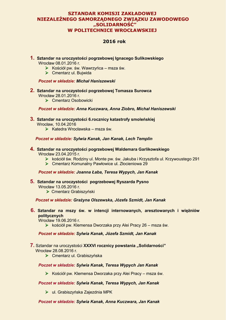 SZTANDAR KOMISJI ZAKŁADOWEJ NIEZALEŻNEGO SAMORZĄDNEGO ZWIĄZKU ZAWODOWEGO „SOLIDARNOŚĆ” W POLITECHNICE WROCŁAWSKIEJ 2016 rok 1. Sztandar na uroczystości pogrzebowej Ignacego Sulikowskiego Wrocław 08.01.2016 r. Kościół pw. św. Wawrzyńca – msza św. Cmentarz ul. Bujwida Poczet w składzie: Michał Haniszewski 2. Sztandar na uroczystości pogrzebowej Tomasza Surowca Wrocław 28.01.2016 r. Cmentarz Osobowicki Poczet w składzie: Anna Kuczwara, Anna Ziobro, Michał Haniszewski 3. Sztandar na uroczystości 6.rocznicy katastrofy smoleńskiej Wrocław, 10.04.2016 Katedra Wrocławska – msza św. Poczet w składzie: Sylwia Kanak, Jan Kanak, Lech Templin 4. Sztandar na uroczystości pogrzebowej Waldemara Garlikowskiego Wrocław 23.04.2015 r. kościół św. Rodziny ul. Monte pw. św. Jakuba i Krzysztofa ul. Krzywoustego 291 Cmentarz Komunalny Pawłowice ul. Złocieniowa 29 Poczet w składzie: Joanna Łaba, Teresa Wypych, Jan Kanak 5. Sztandar na uroczystości pogrzebowej Ryszarda Pysno Wrocław 13.05.2016 r. Cmentarz Grabiszyński Poczet w składzie: Grażyna Olszewska, Józefa Szmidt, Jan Kanak 6. Sztandar na mszy św. w intencji internowanych, aresztowanych i więźniów politycznych Wrocław 19.06.2016 r. kościół pw. Klemensa Dworzaka przy Alei Pracy 26 – msza św. Poczet w składzie: Sylwia Kanak, Józefa Szmidt, Jan Kanak 7. Sztandar na uroczystości XXXVI rocznicy powstania „Solidarności” Wrocław 28.08.2016 r. Cmentarz ul. Grabiszyńska Poczet w składzie: Sylwia Kanak, Teresa Wypych Jan Kanak Kościół pw. Klemensa Dworzaka przy Alei Pracy – msza św. Poczet w składzie: Sylwia Kanak, Teresa Wypych, Jan Kanak ul. Grabiszyńska Zajezdnia MPK Poczet w składzie: Sylwia Kanak, Anna Kuczwara, Jan Kanak 8. Sztandar na uroczystości XXXII rocznicy śmierci bł. ks. Jerzego Popiełuszki – Wrocław 16.10.2016 r. cmentarz ul. Smętna – złożenie kwiatów pod pomnikiem ks. Jerzego i pomordowanych kapłanów kościół pw. Świętej Rodziny przy ul. Monte Cassino 68 – msza św. Poczet w składzie: Teresa Wypych, Lech Templin, Tadeusz Wojtkowiak 9. Sztandar na uroczystości XXXVI rocznicy głodówki kolejarzy Wrocław 23.10.2016 r. Stara Lokomotywownia – ul. Paczkowska – msza św. Poczet w składzie: Grażyna Olszewska, Józefa Szmidt, Jan Kanak, 10. Sztandar na uroczystości XXXV rocznicy wprowadzenia stanu wojennego Wrocław, 09.12.2016 Msza św. i koncert na hali produkcyjnej Whirlpool Polar S.A. w rocznicę pacyfikacji zakładu Poczet w składzie: Sylwia Kanak, Jan Kanak Wrocław 13.12.2016 r. kościół pw. Najświętszego Serca Pana Jezusa pl. Grunwaldzki 3 - msza św.; tablica śp. Tadeusza Huskowskiego, pl. Grunwaldzki 9 bud. D-2; pomnik – obelisk poświęcony „Wszystkim współtwórcom, obrońcom i bohaterom „Solidarności” ul. Skwer Obrońców Solidarności; tablica śp. Tadeusza Kosteckiego w holu Gmachu Głównego A-1 Wybrzeże Wyspiańskiego 27 Poczet w składzie: Sylwia Kanak, Teresa Wypych, Jan Kanak Wrocław 13.12.2016 r. Katedra Wrocławska - msza św. w intencji ofiar stanu wojennego Poczet w składzie: Jan Kanak, Lech Templin