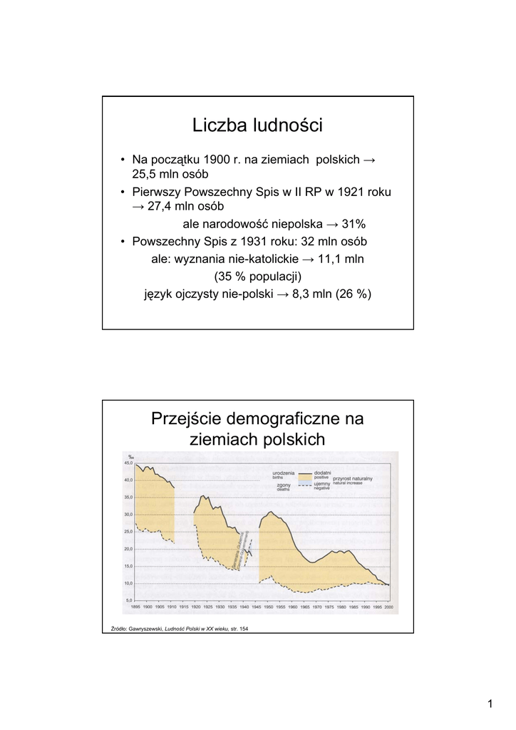 Liczba ludności • Na początku 1900 r. na ziemiach polskich → 25,5 mln osób • Pierwszy Powszechny Spis w II RP w 1921 roku → 27,4 mln osób ale narodowość niepolska → 31% • Powszechny Spis z 1931 roku: 32 mln osób ale: wyznania nie-katolickie → 11,1 mln (35 % populacji) język ojczysty nie-polski → 8,3 mln (26 %) Przejście demograficzne na ziemiach polskich Źródło: Gawryszewski, Ludność Polski w XX wieku, str. 154 1 Ruch naturalny 1946-2000 Liczba ludnośc i Urodzenia/zgony 800 40 000 700 600 35 000 500 400 30 000 300 200 25 000 100 prognoza 0 Ludność Polski (31 XII) Urodzenia 2010 2005 2000 1995 1990 1985 1980 1975 1970 1965 1960 1955 1950 1945 20 000 Zgony Źródło: Okólski, Demografia, str. 124 Spis Powszechny z 2002 roku 38,2 mieszkańców kraju, z tego za granicą przez przynajmniej 2 mies.- 786 tys. (w tym 626 tys. za granicą przez przynajmniej rok, a 250 tys. – 10 lat) Faktyczna ludność Polski: 37,6 mln osób (o 1,7% mniej) * w miastach 61,76 % populacji * 96,7 % narodowości wyłącznie polskiej 1,4 % narodowości wyłącznie niepolskiej * 97,0 % to obywatele RP (+ 1,2 % podwójne obywatelstwo, 1,7 % nieustalone) 0,1 % cudzoziemcy 2 1. Rozrodczość Rysunek 12. Liczba urodzeń żywych w tysiącach, 1946-2005 800 750 700 650 600 550 500 450 400 350 2000 1994 1988 1982 1976 1970 1964 1958 1952 1946 300 Źródło: Fihel, Okólski, Demograficzne przesłanki zmian w liczbie urodzeń w Polsce i wpływ na sytuację kobiet na rynku pracy 1. Zmiany TFR po II wojnie światowej TFR 4,0 3,5 3,0 2,5 2,0 1,5 Miasta 1978 1980 1982 1984 1986 1988 1990 1992 1994 1996 1998 2000 1952 1954 1956 1958 1960 1962 1964 1966 1968 1970 1972 1974 1976 1,0 Obszary wiejskie Polska Źródło: Okólski, Demografia, str. 114 3 2. Umieralność ludności w wieku 45-64 lata Z g o n y n a 1.000 o sób d an ej p łci 19,0 17,0 15,0 13,0 11,0 9,0 7,0 Kobiety 2000 1995 1990 1985 1980 1975 1970 1965 1960 1955 1950 5,0 Mężczyźni Źródło: Okólski, Demografia, str. 118 2. Umieralność ludności (trwanie życia) 80,0 75,0 70,0 65,0 60,0 Źródło: Okólski, Demografia, str. 117 e(0) - mężczyźni e(0) - kobiety e(1) - mężczyźni e(1) - kobiety 1998 1993 1988 1983 1978 1973 1968 1963 1958 1953 1948 55,0 4 3. Migracje wewnętrzne – zasiedlanie ziem zachodnich i północnych Źródło: Gawryszewski, Ludność Polski w XX wieku, str. 390 3. Migracje wewnętrzne – urbanizacja Źródło: opracowanie własne 5 4. Migracje zagraniczne Źródło: Kaczmarczyk, Migracje zarobkowe Polaków w dobie przemian, str. 134 4. Migracje zagraniczne • Migracje zagraniczne Æ imigracja/repatriacja 1945-48: 3,7 mln 1949-89: 350 tys. Æ emigracja/wysiedlenia 1945-47: 3,9 mln 1948-50: 160 tys. 1951-55: 15 tys. 1956-59: 330 tys. 1960-79: 500 tys. od 1980 do 1989: 1,3 mln (przeważa emigracja „nielegalna”) 6 4. Migracje zagraniczne 500 000 450 000 400 000 350 000 300 000 250 000 200 000 150 000 100 000 50 000 0 1981 1982 1983 1984 1985 em igracja rejestrow ana (a) 1986 1987 1988 1989 em igracja niew idzialna (b) Źródło: opracowanie własne na podst. Sakson (2002), Wpływ „niewidzialnych” migracji zagranicznych lat osiemdziesiątych na struktury demograficzne Polski 7