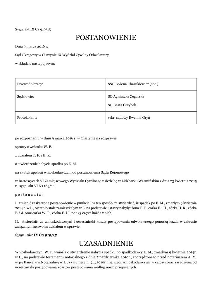 Sygn. akt IX Ca 919/15 POSTANOWIENIE Dnia 9 marca 2016 r. Sąd Okręgowy w Olsztynie IX Wydział Cywilny Odwoławczy w składzie następującym: Przewodniczący: SSO Bożena Charukiewicz (spr.) Sędziowie: SO Agnieszka Żegarska SO Beata Grzybek Protokolant: sekr. sądowy Ewelina Gryń po rozpoznaniu w dniu 9 marca 2016 r. w Olsztynie na rozprawie sprawy z wniosku W. P. z udziałem T. F. i H. K. o stwierdzenie nabycia spadku po E. M. na skutek apelacji wnioskodawczyni od postanowienia Sądu Rejonowego w Bartoszycach VI Zamiejscowego Wydziału Cywilnego z siedzibą w Lidzbarku Warmińskim z dnia 23 kwietnia 2015 r., sygn. akt VI Ns 169/14, postanawia: I. zmienić zaskarżone postanowienie w punkcie I w ten sposób, że stwierdzić, iż spadek po E. M., zmarłym 9 kwietnia 2014 r. w L., ostatnio stale zamieszkałym w L. na podstawie ustawy nabyły: żona T. F., córka F. i H., córka H. K., córka E. i J. oraz córka W. P., córka E. i J. po 1/3 części każda z nich, II. stwierdzić, że wnioskodawczyni i uczestniczki koszty postępowania odwoławczego ponoszą każda w zakresie związanym ze swoim udziałem w sprawie. Sygn. akt IX Ca 919/15 UZASADNIENIE Wnioskodawczyni W. P. wniosła o stwierdzenie nabycia spadku po spadkodawcy E. M., zmarłym 9 kwietnia 2014r. w L., na podstawie testamentu notarialnego z dnia 7 października 2010r., sporządzonego przed notariuszem A. M. w jej Kancelarii Notarialnej w L., za numerem (...)2010r., na rzecz wnioskodawczyni w całości oraz zasądzenia od uczestniczki postępowania kosztów postępowania według norm przepisanych. W uzasadnieniu wnioskodawczyni wskazała, że spadkodawca był jej ojcem. Jego krąg spadkobierców ustawowych tworzą : córka W. P., córka H. K. oraz żona T. F.. Uczestniczka H. K. przychyliła się do stanowiska wnioskodawczyni. Uczestniczka T. F. wniosła o stwierdzenie nabycia spadku po spadkodawcy E. M. na podstawie testamentu notarialnego z dnia 2 marca 2012 r., sporządzonego przed notariuszem A. M. w jej Kancelarii Notarialnej w L. za numerem (...)2012r. na jej rzecz w całości i zasądzenia od wnioskodawczyni kosztów postępowania według norm przepisanych . Postanowieniem z dnia 23 kwietnia 2015 r. Sąd Rejonowy w Bartoszycach VI Zamiejscowy Wydział Cywilny z siedzibą w Lidzbarku Warmińskim stwierdził, że spadek po spadkodawcy E. M., synu K. i B., zmarłym 9 kwietnia 2014 r, ostatnio stale zamieszkałym w L., na podstawie testamentu notarialnego z dnia 2 marca 2012 r. nabyła uczestniczka postępowania T. F. z domu L., córka F. i H. w całości. Orzekł, że koszty postępowania wnioskodawczyni i uczestnicy ponoszą każdy stosownie do swego udziału w sprawie. Nakazał pobrać od wnioskodawczyni i uczestniczek postępowania na rzecz Skarbu Państwa (Sądu Rejonowego w Bartoszycach ) kwotę po 352,92 zł od każdej z nich tytułem zwrotu wydatków wyłożonych tymczasowo na poczet przeprowadzenia dowodu z opinii biegłych. Sąd Rejonowy ustalił, że E. M., syn K. i B. z domu D. zmarł 9 kwietnia 2014r. w L., ostatnio stale zamieszkiwał w L.. W chwili śmierci był żonaty z T. F. z domu L., córką F. i H.. Jego pierwszą żona była J. M. z domu K., która zmarła 9 czerwca 2010 r. w L.. Z małżeństwa z J. M. spadkodawca miał dwoje dzieci tj. wnioskodawczynię W. P. i uczestniczkę H. K.. Z małżeństwa z uczestniczka T. F. spadkodawca dzieci nie pozostawił. Nie miał dzieci pozamałżeńskich ani przysposobionych. Nikt z kręgu spadkobierców ustawowych E. M. nie został uznany za niegodnego dziedziczenia. Postępowanie prowadzone w niniejszej sprawie jest pierwszym postępowaniem o stwierdzenie nabycia praw do spadku po E. M.. Jego spadkobiercy nie uzyskali poświadczenia dziedziczenia po jego osobie przed notariuszem. Jak ustalił Sąd Rejonowy spadkodawca sporządził dwa testamenty, oba sporządzone w formie aktu notarialnego przed notariuszem A. M., w jej Kancelarii Notarialnej w L.. Pierwszy z nich sporządzony został za numerem (...)2010 dnia 07.10.2010r. na rzecz wnioskodawczyni. Drugi natomiast sporządzony został za numerem (...)2012 dnia 02.03.2012r. Spadkodawca w treści testamentu notarialnego z dnia 02.03.2012r. oświadczył, że odwołuje w całości swój testament z dnia 7 października 2010r., sporządzony za numerem A (...) i wydziedzicza: córkę W. P., córkę H. K., wnuka Z. P., wnuczkę M. nazwisko rodowe R. (M. R. ), wnuczkę M. nazwisko rodowe K. (L. K.), wnuczkę J. nazwisko rodowe K. (M. C.), ponieważ nie interesują się nim i nie opiekują się nim. Także w dniu 2 marca 2012r. spadkodawca darował na podstawie umowy zawartej w formie aktu notarialnego sporządzonego przed Notariuszem A. M. za numerem A (...) uczestniczce T. F. prawo własności lokalu mieszkalnego numer (...), położonego w L. przy ul. (...). Z dalszych ustaleń Sądu Rejonowego wynika, że w dacie sporządzenia obu aktów notarialnych dotyczących uczestniczki T. F. spadkodawca miał niespełna 91 lat. Kilka miesięcy wcześniej tj. 30 grudnia 2011 r. spadkodawca ożenił się z uczestniczką T. F.. T. F. wraz ze swoim pierwszym mężem była od lat znana spadkodawcy, ponieważ mieszkała ona w lokalu mieszkalnym znajdującym się na tej samej klatce schodowej, co spadkodawca z pierwszą żoną, oba małżeństwa mieszkały po sąsiedzku. Nie była ona osobą, która pojawiła się w życiu spadkodawcy znikąd. Spadkodawca czuł się osamotniony, był już osobą małosamodzielną, wymagającą opieki i zaproponował T. F. małżeństwo. T. F. sprawowała należytą opiekę nad swoim drugim mężem. Warunki bytowe w jakich pozostawał spadkodawca na wniosek jego córek były przedmiotem kontroli ze strony Kierownika Miejskiego Ośrodka Pomocy Społecznej w L.. Kiedy spadkodawca przebywał w szpitalach na leczeniu, jako osobę do kontaktu z rodziną wskazywał żonę, T. F.. Obie córki zmarłego, szczególnie wnioskodawczyni nie zaakceptowały decyzji ojca o związaniu się z inną kobietą i prakty