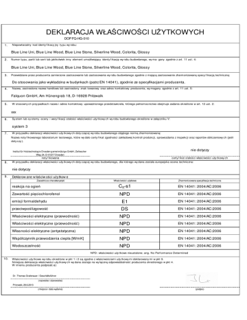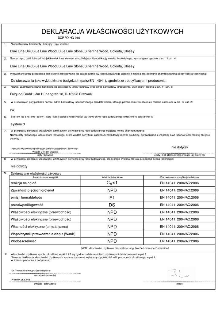 DEKLARACJA WŁAŚCIWOŚCI UŻYTKOWYCH DOP FQ-HG-010 1. Niepowtarzalny kod identy f ikacy jny ty pu wy robu: Blue Line Uni, Blue Line Wood, Blue Line Stone, Silverline Wood, Colorita, Glossy 2. Numer ty pu, partii lub serii lub jakikolwiek inny element umożliwiający identy f ikację wy robu budowlanego, wy ma- gany zgodnie z art. 11 ust. 4: Blue Line Uni, Blue Line Wood, Blue Line Stone, Silverline Wood, Colorita, Glossy 3. Przewidziane przez producenta zamierzone zastosowanie lub zastosowania wy robu budowlanego zgodnie z mającą zastosowanie zharmonizowaną specy f ikacją techniczną: Do stosowania jako wykładzina w budynkach (patrz EN 14041), zgodnie ze specyfikacjami producenta. 4. Nazwa, zastrzeżona nazwa handlowa lub zastrzeżony znak towarowy oraz adres kontaktowy producenta, wy magany zgodnie z art. 11 ust. 5: Falquon GmbH, Am Hünengrab 18, D-16928 Pritzwalk 5. W stosowny ch przy padkach nazwa i adres kontaktowy upoważnionego przedstawiciela, którego pełnomocnictwo obejmuje zadania określone w art. 12 ust. 2: xxx 6. Sy stem lub sy stemy oceny i wery f ikacji stałości właściwości uży tkowy ch wy robu budowlanego określone w załączniku V: system 3 7. W przy padku deklaracji właściwości uży tkowy ch doty czącej wy robu budowlanego objętego normą zharmonizowaną: Nazwa noty f ikowanego laboratorium testowego, które wy dało certy f ikat zgodności zakładowej kontroli produkcji, sprawozdania z inspekcji oraz raportów obliczeniowy ch (jeśli doty czy ). nie dotyczy Institut für Holztechnologie Dresden gemeinnützige GmbH, Zellescher Weg 24, D-01217 Dresden noty f ikowana 8. certy f ikat stałości właściwości uży tkowy ch W przy padku deklaracji właściwości uży tkowy ch doty czącej wy robu budowlanego, dla którego wy dana została europejska ocena techniczna: nie dotyczy 9. Deklarow ane w łaściw ości użytkow e Zasadnicze charakterystyki Właściwości użytkowe Zharmonizowana specyfikacja techniczna reakcja na ogień C fl-s1 EN 14041: 2004/AC:2006 Zawartość pięciochlorofenol NPD EN 14041: 2004/AC:2006 emisji formaldehydu E1 EN 14041: 2004/AC:2006 przeciwpoślizgowość DS EN 14041: 2004/AC:2006 Właściwości elektryczne (przewodność) NPD EN 14041: 2004/AC:2006 Właściwości elektryczne (przewodność) NPD EN 14041: 2004/AC:2006 Własności elektryczne (antystatyczna) NPD EN 14041: 2004/AC:2006 Współczynnik przewodzenia ciepła [W/mK] NPD EN 14041: 2004/AC:2006 Wodoszczelność NPD EN 14041: 2004/AC:2006 NPD: właściwości uży tkowe nieustalone; ang. No Perf ormance Determined 10. Właściwości uży tkowe wy robu określone w pkt 1 i 2 są zgodne z właściwościami uży tkowy mi deklarowany mi w pkt 9. Niniejsza deklaracja właściwości uży tkowy ch wy dana zostaje na wy łączną odpowiedzialność producenta określonego w pkt 4. W imieniu producenta podpisał(-a): Dr. Thomas Grafenauer / Geschäftsführer (nazwisko i stanowisko) Pritzwalk, 28.6.2013 (miejsce i data wydania) (podpis)