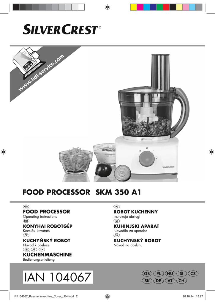 FOOD PROCESSOR SKM 350 A1 FOOD PROCESSOR ROBOT KUCHENNY KONYHAI ROBOTGÉP KUHINJSKI APARAT KUCHYŇSKÝ ROBOT KUCHYNSKÝ ROBOT Operating instructions Kezelési útmutató Návod k obsluze Instrukcja obsługi Navodilo za uporabo Návod na obsluhu KÜCHENMASCHINE Bedienungsanleitung IAN 104067 RP104067_Kuechenmaschine_Cover_LB4.indd 2 28.10.14 13:27 __RP104067_B4.book Seite 1 Mittwoch, 5. November 2014 3:42 15 English..................................................................................... 2 Polski .................................................................................... 16 Magyar ................................................................................. 30 Slovenšina ........................................................................... 46 esky .................................................................................... 58 Slovenina ............................................................................. 72 ID: SKM 350 A1_15_V1.3 Deutsch ................................................................................. 86 __RP104067_B4.book Seite 2 Mittwoch, 5. November 2014 3:42 15 Overview / Przegld / Áttekintés / Pregled / Pehled / Prehad / Übersicht A B 1 2 3 3 2 3 4 5 11 11 15 6 16 7 8 C D 2 9 3 10 11 11 12 13 14 16 16 15 16 17 E F 6 G 4 4 6 14 15 5 6 __RP104067_B4.book Seite 2 Mittwoch, 5. November 2014 3:42 15 Contents 1. Overview ........................................................................................ 2 2. Intended purpose ............................................................................ 3 3. Safety information ........................................................................... 3 4. Items supplied ................................................................................. 6 5. How to use ...................................................................................... 6 6. Installation ...................................................................................... 7 7. Operation ........................................................................................ 7 8. Cleaning ........................................................................................ 10 9. Storage ......................................................................................... 10 10. Troubleshooting ............................................................................. 11 11. Recipes .......................................................................................... 11 12. Disposal ........................................................................................ 13 13. Technical specifications .................................................................. 13 14. Warranty of the HOYER Handel GmbH ........................................... 14 1. Overview 1 2 / 2 GB Food pusher for food chute : lid positioned : lid locked 3 Lid 4 Slicing insert 5 Grating disk 6 Insert holder 7 Dough blade 8 Blade insert 9 Drive axle 10 Top marking on the bowl 11 Bowl (holding capacity: 1000 ml) 12 Bottom marking on the bowl 13 Spindle 14 Power cable with mains plug 15 Motor block 16 / : bowl attached : bowl locked 17 P 0 1 2 Control dial P: pulse button / 0: switched off / 1: low speed / 2: high speed __RP104067_B4.book Seite 3 Mittwoch, 5. November 2014 3:42 15 Thank you for your trust! 2. Intended purpose Congratulations on the purchase of your new food processor. For a safe handling of the product and in order to get to know the entire scope of features: The food processor is intended solely for stirring and chopping foodstuffs. The device is designed for use in private households. The device must only be used indoors. This device must not be used for commercial purposes. • Thoroughly read these operating instructions prior to initial commissioning. • Above all, observe the safety instructions! • The device should only be used as described in these instructions. • Keep these instructions for reference. • If you pass the device on to someone else, please include these operating instructions. Foreseeable misuse We wish you a lot of joy with your new food processor! 3. Safety information WARNING! Risk of material damage! ~ Do not use the device for processing especially hard foodstuffs, such as frozen foods, bones, nutmeg, cereals or coffee beans. ~ It is also not possible to knead dough with dough hooks. This would overload the motor. Warnings If necessary, the following warnings will be used in these operating instructions: DANGER! High risk: failure to observe this warning may result in injury to life and limb. WARNING! Moderate risk: failure to observe this warning may result in injury or serious material damage. CAUTION: low risk: failure to observe this warning may result in minor injury or material damage. NOTE: circumstances and specifics that must be observed when handling the device. GB 3 __RP104067_B4.book Seite 4 Mittwoch, 5. November 2014 3:42 15 Instructions for safe operation ~ Children must be prevented from using this device. ~ This device with its power cable must be stored out of the reach of children. ~ Cleaning and user maintenance must not be performed by children. ~ Children must be supervised to ensure that they do not play with the device. ~ This device can be used by people with restricted physical, sensory or intellectual abilities or people without adequate experience and/or understanding if they are supervised or instructed on how to use this device safely and if they are aware of the resulting risks. ~ The device must be disconnected from the mains if left unattended and prior to assembly, disassembly or cleaning. ~ The blade insert and the grating and slicing inserts are sharp. Handle with care. When washing manually, the water should be sufficiently clear that you can see the blades easily. ~ The insert holder, the blade insert and the dough blade keep on turning after the device has been turned off. Please wait until all parts have come to