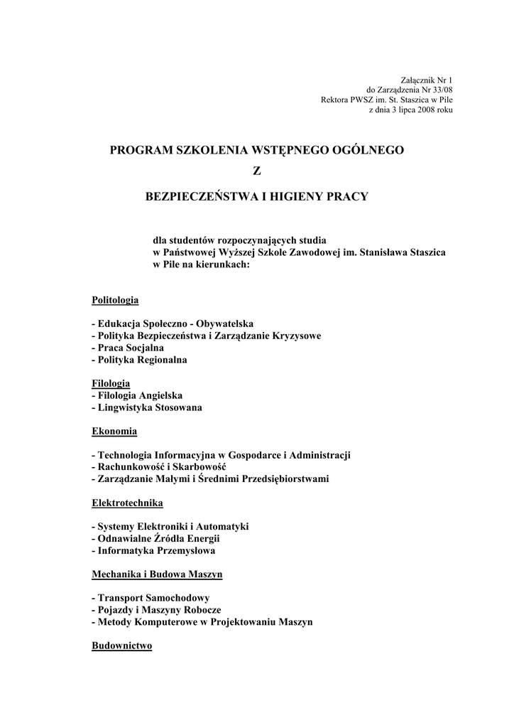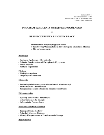 Załącznik Nr 1 do Zarządzenia Nr 33/08 Rektora PWSZ im. St. Staszica w Pile z dnia 3 lipca 2008 roku PROGRAM SZKOLENIA WSTĘPNEGO OGÓLNEGO Z BEZPIECZEŃSTWA I HIGIENY PRACY dla studentów rozpoczynających studia w Państwowej WyŜszej Szkole Zawodowej im. Stanisława Staszica w Pile na kierunkach: Politologia - Edukacja Społeczno - Obywatelska - Polityka Bezpieczeństwa i Zarządzanie Kryzysowe - Praca Socjalna - Polityka Regionalna Filologia - Filologia Angielska - Lingwistyka Stosowana Ekonomia - Technologia Informacyjna w Gospodarce i Administracji - Rachunkowość i Skarbowość - Zarządzanie Małymi i Średnimi Przedsiębiorstwami Elektrotechnika - Systemy Elektroniki i Automatyki - Odnawialne Źródła Energii - Informatyka Przemysłowa Mechanika i Budowa Maszyn - Transport Samochodowy - Pojazdy i Maszyny Robocze - Metody Komputerowe w Projektowaniu Maszyn Budownictwo Instytut Ochrony Zdrowia - Pielęgniarstwo - Fizjoterapia Szkolenie wstępne ogólne (instruktaŜ ogólny) ramowy program szkolenia Czas zajęć 4 x 45 minut I. Istota bezpieczeństwa i higieny pracy 1. NajwaŜniejsze definicje a. Bezpieczeństwo b. Higiena pracy c. Ochrona pracy 2. Regulacje prawne dotyczące ochrony pracy 3. Państwowy nadzór nad przestrzeganiem przepisów bhp a. Państwowa Inspekcja Pracy b. Państwowa Inspekcja Sanitarna c. Inne organy nadzoru i kontroli nad warunkami pracy 4. Społeczny nadzór nad przestrzeganiem przepisów bhp a. Związki zawodowe b. Społeczna inspekcja pracy II. Zakres obowiązków i uprawnień rektora, studentów oraz poszczególnych jednostek organizacyjnych uczelni 1. Ogólne obowiązki rektora w zakresie bhp 2. Szczegółowe obowiązki rektora w zakresie bhp profilaktyczną ochroną zdrowia, czynnikami i procesami pracy i nauki stwarzającymi szczególne zagroŜenie, szkoleniem bhp) 3. Podstawowe prawa studenta 4. Podstawowe obowiązki studenta 5. Podstawowe obowiązki osób kierujących studentami III. Odpowiedzialność za naruszenie przepisów lub zasad bhp 1. Odpowiedzialność dyscyplinarna studentów 2 IV. Zasady poruszania się na terenie uczelni 1. Podział i nazwy dróg na terenie uczelni 2. Znakowanie dróg 3. Wymogi dla dróg i placów manewrowych dla środków transportowych 4. Wymogi dla dróg dla ruchu pieszego 5. Zasady poruszania się środków transportowych 6. Zasady poruszania się pieszych 7. Wymogi dla dróg ewakuacyjnych i dojazdów poŜarowych 8. Oświetlenie dróg 9. Przemieszczanie się w pomieszczeniach uczelni i korzystania z pomieszczeń usługowych V. ZagroŜenia wypadkowe i zagroŜenia dla zdrowia występujące w uczelni, podstawowe środki zapobiegawcze 1. ZagroŜenia czynnikami występującymi w procesach pracy, nauczania 2. Czynniki niebezpieczne i szkodliwe w środowisku pracy, nauczania 3. Czynniki fizyczne 4. Czynniki chemiczne 5. Czynniki biologiczne 6. Czynniki psychofizyczne w środowisku pracy, nauki VI. Podstawowe zasady bhp związane z obsługą urządzeń technicznych 1. Urządzenia techniczne – definicje 2. Deklaracja i ocena zgodności 3. Dokumentacja techniczno-ruchowa 4. Kwalifikacje w zakresie obsługi i konserwacji urządzeń technicznych 5. Oświetlenie maszyn – wymagania 6. Elementy sterownicze i informacyjne maszyn 3 7. Osłony i urządzenia ochronne 8. Ograniczanie emisji czynników szkodliwych dla zdrowia 9. Kontrola maszyn 10. Współdziałanie pracowników i studentów w celu zapewnienia bezpieczeństwa VII. Zasady przydziału środków ochrony indywidualnej 1. Środki ochrony indywidualnej – zasady stosowania VIII. Porządek i czystość w miejscu pracy, nauki 1. 2. 3. 4. Odpowiedzialność studentów ZagroŜenia poŜarem ZagroŜenia wypadkowe i chorobowe ZagroŜenia sanitarno – epidemiologiczne IX. Profilaktyczna opieka lekarska – zasady jej sprawowania w odniesieniu do studentów 1. Uwarunkowania środowiska pracy, nauczania i uwarunkowania zewnętrzne 2. Profilaktyka indywidualna dotycząca studenta 3. PIP i PIS w profilaktyce zdrowotnej uczelni X. Podstawowe zasady ochrony przeciwpoŜarowej oraz postępowanie w razie poŜaru 1. 2. 3. 4. 5. 6. Ocena bezpieczeństwa poŜarowego uczelni Charakterystyka poŜarowa materiałów Źródła zapłonu Warunki techniczno – budowlane wpływające na bezpieczeństwo poŜarowe Techniczne systemy zabezpieczeń przeciwpoŜarowych Zasady zachowania się w sytuacji poŜaru lub innego zagroŜenia XI. Postępowanie w razie wypadku na terenie uczelni 1. Definicja wypadku w szczególnych okolicznościach 2. Zaopatrzenie z tytułu wypadków lub chorób zawodowych powstałych w szczególnych okolicznościach 3. Postępowanie powypadkowe a. Uprawnienia i obowiązki studenta b. Obowiązki rektora i zespołu powypadkowego c. Sporządzenie i zatwierdzenie protokołu powypadkowego 4 XII. Zasady udzielania pierwszej pomocy medycznej 1. Podstawy prawne ratownictwa w wypadkach przy pracy 2. Przygotowanie sprzętu i łączności ratunkowej 3. Wzywanie pomocy na miejsce wypadku 4. Zasady zabezpieczania miejsca wypadku i ewakuacji poszkodowanych 5. Diagnostyka objawów Ŝyciowych ofiar wypadku 6. Postępowanie w razie zranień głowy, szyi, kończyn, klatki piersiowej i brzucha 7. Problemy związane z urazem wielo - narządowym 8. Zapobieganie wstrząsowi pourazowemu 9. Zabezpieczanie złamań i zwichnięć 10. Opatrywanie oparzeń termicznych i chemicznych 11. Postępowanie z odmroŜeniami i wychłodzeniem 12. Zasady postępowania z osobą poraŜoną prądem 13. Postępowanie w razie nagłych zatruć oraz niespodziewanych pogorszeń stanów w chorobach wewnętrznych 5