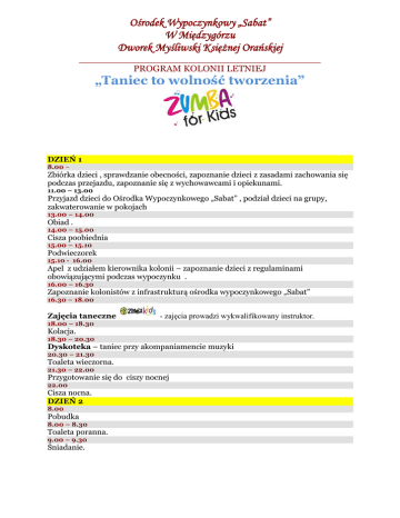 Ośrodek Wypoczynkowy „Sabat” W Międzygórzu Dworek Myśliwski Księżnej Orańskiej ________________________________________ PROGRAM KOLONII LETNIEJ „Taniec to wolność tworzenia” DZIEŃ 1 8.00 – Zbiórka dzieci , sprawdzanie obecności, zapoznanie dzieci z zasadami zachowania się podczas przejazdu, zapoznanie się z wychowawcami i opiekunami. 11.00 – 13.00 Przyjazd dzieci do Ośrodka Wypoczynkowego „Sabat” , podział dzieci na grupy, zakwaterowanie w pokojach 13.00 – 14.00 Obiad . 14.00 – 15.00 Cisza poobiednia 15.00 – 15.10 Podwieczorek 15.10 - 16.00 Apel z udziałem kierownika kolonii – zapoznanie dzieci z regulaminami obowiązującymi podczas wypoczynku . 16.00 – 16.30 Zapoznanie kolonistów z infrastrukturą ośrodka wypoczynkowego „Sabat” 16.30 – 18.00 Zajęcia taneczne - zajęcia prowadzi wykwalifikowany instruktor. 18.00 – 18.30 Kolacja. 18.30 – 20.30 Dyskoteka – taniec przy akompaniamencie muzyki 20.30 – 21.30 Toaleta wieczorna. 21.30 – 22.00 Przygotowanie się do ciszy nocnej 22.00 Cisza nocna. DZIEŃ 2 8.00 Pobudka 8.00 – 8.30 Toaleta poranna. 9.00 – 9.30 Śniadanie. 9.30 – 11.00 Wycieczka piesza nad Wodospad Wilczki - wycieczka z przewodnikiem GOPR + zajęcia plastyczne, konkurs na najładniejszy obraz pt. „Wodospad Wilczki” 11.00 – 13.00 Warsztaty taneczne - zajęcia z wykwalifikownym instruktorem 13.00 – 14.00 Obiad. 14.00 – 14.30 Cisza poobiednia. 14.30 – 14.40 Podwieczorek. 14.40 – 18.00 Zajęcia sportowe – turniej piłki koszykowej – o puchar kierownika kolonii 18.00 – 18.30 Kolacja. 18.30 – 20.30 Ognisko z pieczeniem kiełbasek 20.30 – 21.30 Toaleta wieczorna 22.00 Cisza nocna. DZIEŃ 3 8.00 Pobudka 8.00 – 8.30 Toaleta poranna. 8.30 – 9.00 Konkurs czystości - c.d. 9.00 – 9.30 Śniadanie 9.30 – 13.00 Wycieczka piesza na Górę Igliczną (SMBŚ), powrót przez Polanę Śnieżną i Ogród Bajek – wycieczka z przewodnikiem PTTK 13.00 – 14.00 Obiad. 14.00 – 14.30 Cisza poobiednia. 14.30 – 14.40 Podwieczorek. 14.40 – 17.00 Chrzest kolonijny. 17.00 – 18.00 Warsztaty taneczne 18.00 – 18.30 Kolacja. 18.30 – 21.30 Dyskoteka – konkurs fryzur 21.30 – 22.00 Toaleta wieczorna . 22.00 Cisza nocna. - zajęcia z wykwalifikownym instruktorem DZIEŃ 4 8.00 Pobudka 8.00 – 8.30 Toaleta poranna 8.30 – 9.00 Konkurs czystości - c.d. 9.00 – 9.30 Śniadanie. 9.30 – 17.00 Wycieczka autokarowa – Duszniki Zdrój, Polanica Zdrój – wycieczka z przewodnikiem PTTK. 17.00 Obiadokolacja 18.30 – 19.30 Warsztaty taneczne - zajęcia z wykwalifikownym instruktorem 19.30 – 21.30 Dyskoteka – konkurs Tańca 21.30 – 22.00 Przygotowanie do ciszy nocnej – toaleta wieczorna 22.00 Cisza nocna DZIEŃ 5 8.00 Pobudka 8.00 – 8.30 Toaleta poranna 8.30 – 9.00 Konkurs czystości - c.d. 9.00 – 9.30 Śniadanie 9.30 – 13.00 Konkurs na najładniejszy Totem grupy kolonijnej – konkurs z nagrodami 13.00 – 14.00 Obiad 15.00 – 18.00 Zajęcia o charakterze sportowym – turniej piłki nożnej – rywalizacja w grupach – konkurs o puchar kierownika kolonii. Jednocześnie: Przygotowania do konkursu „Karaoke” 18.00 – 18.30 Kolacja 18.30 – 21.30 Wielki Konkurs „Karaoke” – konkurs z nagrodami 21.30 – 22.00 Toaleta wieczorna . 22.00 Cisza nocna DZIEŃ 6 8.00 Pobudka 8.00 – 8.30 Toaleta poranna. 8.30 – 9.00 Konkurs czystości - c.d. 9.00 – 9.30 Śniadanie. 9.30 – 18.00 Wycieczka piesza do na szczyt „Śnieżnik” - wycieczka z przewodnikiem PTTK 18.00 – 18.30 Obiadokolacja 18.30 – 21.30 Dyskoteka w stylu - konkurs na najlepszy taniec 21.30 – 22.00 Przygotowanie do ciszy nocnej 22.00 Cisza nocna DZIEŃ 7 8.00 Pobudka 8.00 – 8.30 Toaleta poranna. 8.30 – 9.00 Konkurs czystości - c.d. 9.00 – 9.30 Śniadanie 9.30 – 13.00 Wycieczka nad Zaporę Wodną w Międzygórzu - zajęcia o charakterze krajoznawczym – wycieczka z przewodnikiem 13.00 – 14.00 Obiad. 14.40 – 18.00 Wybory Miss i Mistera kolonii oraz pokaz tańca 18.00 – 18.30 Kolacja. 18.30 – 21.30 Uroczysty Apel – wręczenie dyplomów, nagród oraz certyfikatów Dyskoteka 21.30 – 22.00 Toaleta wieczorna . 22.00 Cisza nocna. DZIEŃ 8 8.00 Pobudka 8.00 – 8.30 Toaleta poranna. 8.30 – 9.00 Przygotowania związane z powrotem do domów 9.00 – 9.30 Śniadanie. 9.30 - 10.00 Pożegnalny spacer po Międzygórzu. 10.00 – 12.30 Powrót do Wrocławia