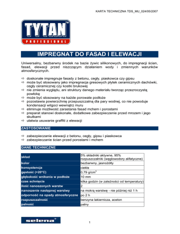 KARTA TECHNICZNA TDS_MU_024/05/2007 IMPREGNAT DO FASAD I ELEWACJI Uniwersalny, bezbarwny środek na bazie żywic silikonowych, do impregnacji ścian, fasad, elewacji przed niszczącym działaniem wody i zmiennych warunk„w atmosferycznych. doskonale impregnuje fasady z betonu, cegły, piaskowca czy gipsu może być stosowany jako impregnacja gresowych płytek ceramicznych dach„wki, cegły ceramicznej czy kostki brukowej nie zmienia wyglądu, ani struktury danego materiału tworząc przezroczystą powłokę może być stosowany na każde porowate podłoże pozostawia powierzchnię przepuszczalną dla pary wodnej, co nie powoduje kondensacji wilgoci wewnątrz muru eliminuje możliwość zarastania fasad mchem i porostami preparat stanowi doskonałe, dodatkowe zabezpieczenie przed mrozem i jego skutkami ułatwia usuwanie graffiti z elewacji ZASTOSOWANIE zabezpieczanie elewacji z betonu, cegły, gipsu i piaskowca zabezpieczanie ścian przed porostami i mchem DANE TECHNICZNE skład kolor konsystencja gęstość (+20„C) głębokość wnikania w podłoże 5% składniki aktywne, 95% rozpuszczalniki (węglowodory alifatyczne) bezbarwny, jasnoż„łty ciekła 0,79 g/cm3 10 mm czas schnięcia kilka godzin (w zależności od temperatury) ilość nanoszonych warstw 2 nanoszenie następnej warstwy na mokrą warstwę - nie p„źniej niż 1 h odporność na opady atmosferyczne po 2 h rozpuszczalność benzyna lakiernicza, aceton palność palny 1 KARTA TECHNICZNA TDS_MU_024/05/2007 SPOS†B UŻYCIA PRZYGOTOWANIE PODLOŻA powierzchnia przeznaczona do pokrycia preparatem dokładnie oczyścić usunąć z podłoża wszystkie uszkodzone fragmenty oraz obce substancje, a także wszelkie naloty (np. mchy, porosty Środkiem do usuwania mchu i porost„w TYTAN), smary, sole mineralne, grzyb i inne substancje mogące osłabić przyczepność należy uszczelnić rysy i pęknięcia, a większe ubytki wypełnić zaprawą lub zaszpachlować powierzchnie zabrudzone sadzą lub pyłem zmyć strumieniem wody pod ciśnieniem przed nałożeniem preparatu podłoże osuszyć zabezpieczyć folią powierzchnie malowane przylegające do impregnowanej powierzchni (np. okna, ramy okienne, drzwi, progi), ponieważ w kontakcie ze środkiem mogą ulec zniszczeniu NAKŁADANIE przed użyciem preparat dokładnie wymieszać na powierzchnię nakładać zawsze z g„ry na d„ł za pomocą szczotki, wałka lub rozpylacza minimalna temperatura podczas pracy wynosi +5oC (dotyczy zar„wno temperatury podłoża, jak i otoczenia) właściwe pokrycie powierzchni otrzymamy po nałożeniu co najmniej dw„ch warstw preparatu (do całkowitego nasycenia powierzchni) kolejna warstwa musi być nałożona na jeszcze wilgotnej warstwie poprzedniej (nie p„źniej niż po 1 godzinie) narzędzia czyścić benzyną lakierniczą lub acetonem po zakończeniu pracy WYDAJNOŚĆ/ ZUŻYCIE MATERIAŁU Wydajność robocza jest uzależniona od chłonności i stopnia porowatości powierzchni: średnio 0,5 l/m2 zwarta powierzchnia kamienista 0,2 l/m2 powierzchnie wapienne o dużej porowatości 1 l/m2 PRZECHOWYWANIE I OPAKOWANIE Produkt pakowany jest w pojemniki o poj. 1 litr i 5 litr„w. Przechowywać 2 lata, w szczelnie zamkniętych opakowaniach w suchych, chłodnych pomieszczeniach w temp. od +5C do +20oC. Z dala od źr„deł ognia i grzejnik„w, środk„w spożywczych w miejscach niedostępnych dla dzieci. UWAGI I OSTRZEŻENIA I ZALECENIA BHP 2 KARTA TECHNICZNA TDS_MU_024/05/2007 nie należy stosować preparatu, jeśli istnieje możliwość wystąpienia opad„w w ciągu około 2 godzin po zastosowaniu (w zależności od warunk„w atmosferycznych). podczas wykonywania prac należy przestrzegać og„lnych zasad BHP oraz zachować ostrożność konieczną przy stosowaniu środk„w łatwopalnych. stosować sprzęt ochrony osobistej. opr„żnionych opakowań po preparacie nie używać do innych cel„w. chronić przed dziećmi. produkt palny Aktualizacja 03.05.2007 Wszelkie pisemne lub ustne informacje, zalecenia i wskaz„wki zostały udzielone na podstawie najlepszej naszej wiedzy, badań i doświadczeń, w dobrej wierze zgodnie z zasadami obowiązującymi u producenta i w naszej Sp„łce. Każdy z użytkownik„w tego materiału upewni się na wszelkie możliwe sposoby, włącznie ze sprawdzeniem produktu końcowego w odpowiednich warunkach, o przydatności dostarczanych materiał„w dla osiągnięcia cel„w zamierzonych przez niego. Sp„łka , jej oddziały ani upoważnieni przedstawiciele nie mogą ponosić odpowiedzialności za jakiekolwiek straty poniesione na skutek nieprawidłowego, bądź błędnego użycia jej materiał„w. 3