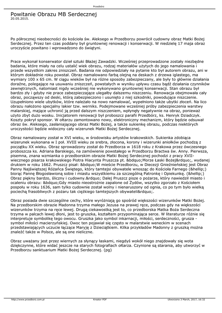 Przedbórz Powitanie Obrazu MB Serdecznej 20.05.2015. Po półrocznej nieobecności do kościoła św. Aleksego w Przedborzu powrócił cudowny obraz Matki Bożej Serdecznej. Przez ten czas poddany był gruntownej renowacji i konserwacji. W niedzielę 17 maja obraz uroczyście powitano i wprowadzono do świątyni. Prace wykonał konserwator dzieł sztuki Błażej Zawadzki. Wcześniej przeprowadzone zostały niezbędne badania, które miały na celu ustalić wiek obrazu, rodzaj materiałów użytych do jego namalowania i przede wszystkim zakres zniszczeń. Badania nie odpowiedziały na pytanie kto był autorem obrazu, ani w którym dokładnie roku powstał. Obraz namalowano farbą olejną na deskach z drzewa iglastego, ma wymiary 100 x 65 cm. W ciągu wieków był na różne sposoby zabezpieczany, ale były to głównie działania doraźne, polegające na usuwaniu zniszczeń, powstałych w wyniku upływu czasu bądź działania czynników zewnętrznych, natomiast nigdy wcześniej nie wykonywano gruntownej konserwacji. Stan obrazu był bardzo zły i gdyby nie prace zabezpieczające ulegałby dalszemu niszczeniu. Renowacja obejmowała cały obraz, począwszy od deski, którą zabezpieczono i usunięto z niej szkodniki, powodujące niszczenie. Uzupełniono wiele ubytków, które należało na nowo namalować, wypełniono także ubytki złoceń. Na lico obrazu nałożono specjalny lakier tzw. werniks. Podejmowane wcześniej próby zabezpieczenia warstwy malarskiej, mające uchronić ją przed dalszym niszczeniem, wpłynęły negatywnie na obraz, ponieważ użyto zbyt dużo wosku. Inicjatorem renowacji był proboszcz parafii Przedbórz, ks. Henryk Dziadczyk. Koszty pokrył sponsor. W ołtarzu zamontowano nowy, elektroniczny mechanizm, który będzie odsuwał obraz św. Aleksego, zasłaniającego obraz Matki Bożej, a także sukienkę obrazu, podczas niektórych uroczystości będzie widoczny cały wizerunek Matki Bożej Serdecznej. Obraz namalowany został w XVI wieku, w środowisku artystów krakowskich. Sukienka zdobiąca wizerunek wykonana w I poł. XVIII wieku ze srebra, złocona, korony i wizerunki aniołków pochodzą z początku XX wieku. Obraz sprowadzony został do Przedborza w 1618 roku z Krakowa przez ówczesnego proboszcza ks. Adriana Barskiego, na zamówienie powstałego w Przedborzu Bractwa św. Anny. Pierwsza, pisemna, znana wzmianka o przedborskim obrazie Matki Bożej Serdecznej pochodzi z pracy XVIIwiecznego pisarza krakowskiego Piotra Hiacynta Pruszcza pt. „Morze Łaski Bożej”, wydanej drukiem w roku 1662. Pruszcz pisał: „W mieście Przedborzu, w Diecezji Gnieźnieńskiej jest Obraz Panny Najświętszej Różańca Świętego, który tamtejsi obywatele wnosząc do Kościoła Farnego (…) biorąc Pannę Błogosławioną sobie i miastu wszystkiemu za szczególną Patronkę i Opiekunkę. (…) Obraz piękny bardzo, śliczny i cudowny.” Dalej Pruszcz pisze o pożarze, który nawiedził miasto i ocaleniu obrazu: „Gdy miasto nieostrożnie zapalone od Żydów, wszytko zgorzało z Kościołem pospołu w roku 1636, sam tylko cudownie został wolny i nienaruszony od ognia, co po tym było wielką pociechą frasobliwych z pożaru tak ciężkiego tamtejszych obywateli”. Obraz posiada dwie szczególne cechy, które wyróżniają go spośród większości wizerunków Matki Bożej. Na przedborskim obrazie Madonna trzyma małego Jezusa na prawej ręce, podczas gdy na większości wizerunków trzyma na ręce lewej. Drugą ciekawostką jest to, co przedborska Matka Boża Serdeczna trzyma w palcach lewej dłoni, jest to gruszka, kształtem przypominająca serce. W literaturze różnie się interpretuje symbolikę tego owocu. Gruszka jako symbol inkarnacji, miłości, serdeczności, grusza symbol miłości macierzyńskiej. Owoc ten pojawiał się często w malarstwie weneckim w scenach przedstawiających uczucie łączące Maryję z Dzieciątkiem. Kilka przykładów Madonny z gruszką można znaleźć także w Polsce, ale są one nieliczne. Obraz uważany jest przez wiernych za słynący łaskami, niegdyś wokół niego znajdowały się wota dziękczynne, które widać jeszcze na starych fotografiach ołtarza. Czynione są starania, aby utworzyć w Przedborzu sanktuarium Matki Bożej Serdecznej. (pg) http://www.przedborz.com.pl Kreator PDF Utworzono 3 March, 2017, 16:32 Przedbórz http://www.przedborz.com.pl Kreator PDF Utworzono 3 March, 2017, 16:32 Przedbórz Obraz przed renowacją i po renowacji http://www.przedborz.com.pl Kreator PDF Utworzono 3 March, 2017, 16:32