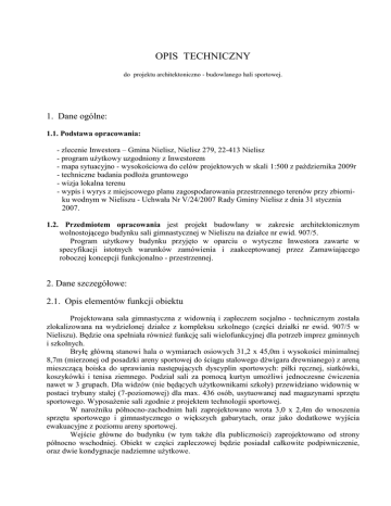 OPIS TECHNICZNY do projektu architektoniczno - budowlanego hali sportowej. 1. Dane ogólne: 1.1. Podstawa opracowania: - zlecenie Inwestora – Gmina Nielisz, Nielisz 279, 22-413 Nielisz - program uŜytkowy uzgodniony z Inwestorem - mapa sytuacyjno - wysokościowa do celów projektowych w skali 1:500 z października 2009r - techniczne badania podłoŜa gruntowego - wizja lokalna terenu - wypis i wyrys z miejscowego planu zagospodarowania przestrzennego terenów przy zbiorniku wodnym w Nieliszu - Uchwała Nr V/24/2007 Rady Gminy Nielisz z dnia 31 stycznia 2007. 1.2. Przedmiotem opracowania jest projekt budowlany w zakresie architektonicznym wolnostojącego budynku sali gimnastycznej w Nieliszu na działce nr ewid. 907/5. Program uŜytkowy budynku przyjęto w oparciu o wytyczne Inwestora zawarte w specyfikacji istotnych warunków zamówienia i zaakceptowanej przez Zamawiającego roboczej koncepcji funkcjonalno - przestrzennej. 2. Dane szczegółowe: 2.1. Opis elementów funkcji obiektu Projektowana sala gimnastyczna z widownią i zapleczem socjalno - technicznym została zlokalizowana na wydzielonej działce z kompleksu szkolnego (części działki nr ewid. 907/5 w Nieliszu). Będzie ona spełniała równieŜ funkcję sali wielofunkcyjnej dla potrzeb imprez gminnych i szkolnych. Bryłę główną stanowi hala o wymiarach osiowych 31,2 x 45,0m i wysokości minimalnej 8,7m (mierzonej od posadzki areny sportowej do ściągu stalowego dźwigara drewnianego) z areną mieszczącą boiska do uprawiania następujących dyscyplin sportowych: piłki ręcznej, siatkówki, koszykówki i tenisa ziemnego. Podział sali za pomocą kurtyn umoŜliwi jednoczesne ćwiczenia nawet w 3 grupach. Dla widzów (nie będących uŜytkownikami szkoły) przewidziano widownię w postaci trybuny stałej (7-poziomowej) dla max. 436 osób, usytuowanej nad magazynami sprzętu sportowego. WyposaŜenie sali zgodnie z projektem technologii sportowej. W naroŜniku północno-zachodnim hali zaprojektowano wrota 3,0 x 2,4m do wnoszenia sprzętu sportowego i gimnastycznego o większych gabarytach, oraz jako dodatkowe wyjścia ewakuacyjne z poziomu areny sportowej. Wejście główne do budynku (w tym takŜe dla publiczności) zaprojektowano od strony północno wschodniej. Obiekt w części zapleczowej będzie posiadał całkowite podpiwniczenie, oraz dwie kondygnacje nadziemne uŜytkowe. W piwnicy zaprojektowano: dwie klatki schodowe, korytarz komunikacyjny, gabinet masaŜu, zespół pomieszczeń sauny, dwa zespoły przebieralni (szatnia + łazienka), siłownię, wentylatornię z rekuperatorem, pomieszczenie porządkowe, oraz kotłownię wraz z pomieszczeniem na opał (ekogroszek, pelety). Na parterze budynku znalazły się następujące pomieszczenia: • sala sportowa • w części dla publiczności: hall wejściowy z szatnią i kasą, oraz klatka schodowa z dźwigiem osobowym, • w części zaplecza socjalno-technicznego: pokój trenerów (nauczycieli w.f.) z łazienką, węzeł sanitarny sportowców, dwa podwójne zespoły szatniowo-natryskowe, gabinet kultury fizycznej, pomieszczenia porządkowe i gospodarcze, magazyny sprzętu sportowego (pod widownią), drugą klatkę schodową i wejście pomocnicze. Na I piętrze zaprojektowano: klatkę schodową z dźwigiem osobowym, korytarz komunikacyjny, sklepik uczniowski z salką do konsumpcji, salę ćwiczeń korekcyjnych, dwa zespoły szatniowo – umywalniowe (oddzielne dla dziewcząt i chłopców), węzeł sanitarny ogólnodostępny (w.c.), pokój pierwszej pomocy z łazienką, pokój organizacji sportowych, pomieszczenie techniczne dla obsługi audiowizualnej sali sportowej, widownię, oraz drugą klatkę schodową. 2.2. Opis dostępności dla osób niepełnosprawnych Na parkingu gminnym zlokalizowanym przy szkole są wyznaczone miejsca postojowe dla pojazdów osób niepełnosprawnych. Cały projektowany obiekt będzie dostępny dla osób niepełnosprawnych poruszających się na wózkach. Wejście główne i wyjścia ewakuacyjne są pozbawione barier architektonicznych; drzwi wejściowe o progach max. 2cm i szerokości skrzydeł 90cm. Komunikację w pionie umoŜliwi zaprojektowana winda osobowa przystosowana do przewozu osób na wózkach. Przy sanitariatach ogólnodostępnych zaprojektowano węzły sanitarne dla osób niepełnosprawnych, wyposaŜone w niezbędne uchwyty. Jeden z zespołów przebieralni z natryskami dla sportowców na parterze, oraz dwa takie został przystosowany dla potrzeb sportowców niepełnosprawnych zapewniono przestrzeń manewrową, oraz wyposaŜono urządzenia sanitarne w niezbędne uchwyty i osprzęt. Na poziomie areny sportowej przewiduje się dla widzów niepełnosprawnych 6 miejsc na wózki inwalidzkie z pomocnikiem. 2.3. Konstrukcja Hala sportowa – o konstrukcji ramowej z dźwigarów i płatwi drewnianych (drewno klejone) opartych na słupach Ŝelbetowych i ścianach szczytowych murowanych. Pokrycie z płyt warstwowych stalowych z rdzeniem z wełny mineralnej. Zaplecze socjalne i techniczne hali sportowej z częścią dla widzów – piętrowe o konstrukcji murowej tradycyjnej, udoskonalonej, całkowicie podpiwniczone, zwieńczone niezbyt stromym dachem wielospadowym o konstrukcji drewnianej. Układ ścian konstrukcyjnych – mieszany. Przewiduje się dylatacje pionowe wzdłuŜ ścian projektowanej hali sąsiadujących z budynkiem zaplecza. Warunki gruntowo-wodne: w/g opisu do części konstrukcyjnej. Ławy i stopy fundamentowe - Ŝelbetowe wylewane w/g PT konstrukcji z betonu B-20 zbrojone stalą 34GS i StOS na podkładzie z chudego betonu B-7,5 grub.10cm. 2.3.1. Ściany fundamentowe: a/ sala gimnastyczna - murowane o grubości 25cm i 38cm z bloczków betonowych klasy 15 MPa na zaprawie cementowej 5 Mpa z dodatkiem plastyfikatora (mleczka wapiennego); ściany zewnętrzne ocieplone styropianem gr. 8 cm; b/ łącznik – murowane z bloczków betonowych gr. 25cm na zaprawie j.w. - ocieplone płytami styropianowymi o łącznej grubości 10cm. 2.3
