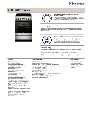 EKC54550OX Kuchnia Pełna kontrola nad pieczeniem z niewielką pomocą zegara Użyj tego zegara, aby ułatwić sobie pracę w kuchni. Wystarczy, że ustawisz czas pieczenia, aby piekarnik włączył i wyłączył się automatycznie. Łatwe do wyczyszczenia szklane drzwi Dzięki pomysłowej konstrukcji tej kuchenki można całkowicie wymontować wewnętrzną szybę z drzwi jej piekarnika. Znacząco ułatwia to jego dokładne wyczyszczenie. Spraw, aby każdy kęs smakował równie wspaniale Dzięki wielofunkcyjnemu piekarnikowi tej kuchenki każda potrawa będzie smakować wspaniale. Funkcja równomiernego rozprowadzania ciepła sprawi natomiast, że każdy kęs będzie równie pyszny! Dodatkowe zalety: • Dodatkowe miejsce na akcesoria, dokładnie tam, gdzie tego potrzebujesz • Łatwa w czyszczeniu płyta grzejna o idealnie płaskiej powierzchni • Zdejmowane drzwi piekarnika pozwalają zaoszczędzić czas na czyszczeniu Funkcje: Dane techniczne: Opis produktu: • Kuchnia elektryczna •Typ płyty: ceramiczna •Pole lewe przednie: Hilight , 1700W(1700W/700W)/180/120mm •Pole lewe tylne: Hilight , 1200W/140mm •Pole prawe przednie: Hilight , 1200W/140mm •Pole prawe tylne: Hilight , 1800W/180mm •Wskaźnik ciepła pozostałego dla poszczególnych pól grzania: 4 •Typ piekarnika: elektryczny •Funkcje piekarnika: ogrzewanie dolne, nawiew, nawiew + ogrzewanie górne, grill, termoobieg, ogrzewanie górne + dolne •Elementy sterujące dla 4 stref grzejnych •Sposób czyszczenia piekarnika: czarna emalia •Łatwe do czyszczenia drzwi piekarnika •Tylny wylot oparów z piekarnika •Szuflada do przechowywania akcesoriów • Klasa energetyczna : A •Pojemność [l] - główna komora : 57 •Wymiary (wys. x szer. x gł.) [mm] : 858x500x600 •Akcesoria opcjonalne : 2 prowadnice teleskopowe z rusztami •Typ płyty : ceramiczna •Typ piekarnika : elektryczny •Całkowity pobór mocy [W] : 7945.4 •Napięcie [V] : 230 •Wymagany bezpiecznik [A] : 2x40, 3X32, 3x20, 4x16 •Kolor : stal szlachetna •Kod produktu (PNC) : 943 004 680 •Kod EAN : 7332543342549 Kuchnia elektryczna z płytą ceramiczną z zegarem Time Control i w pełni szklanymi drzwiami.